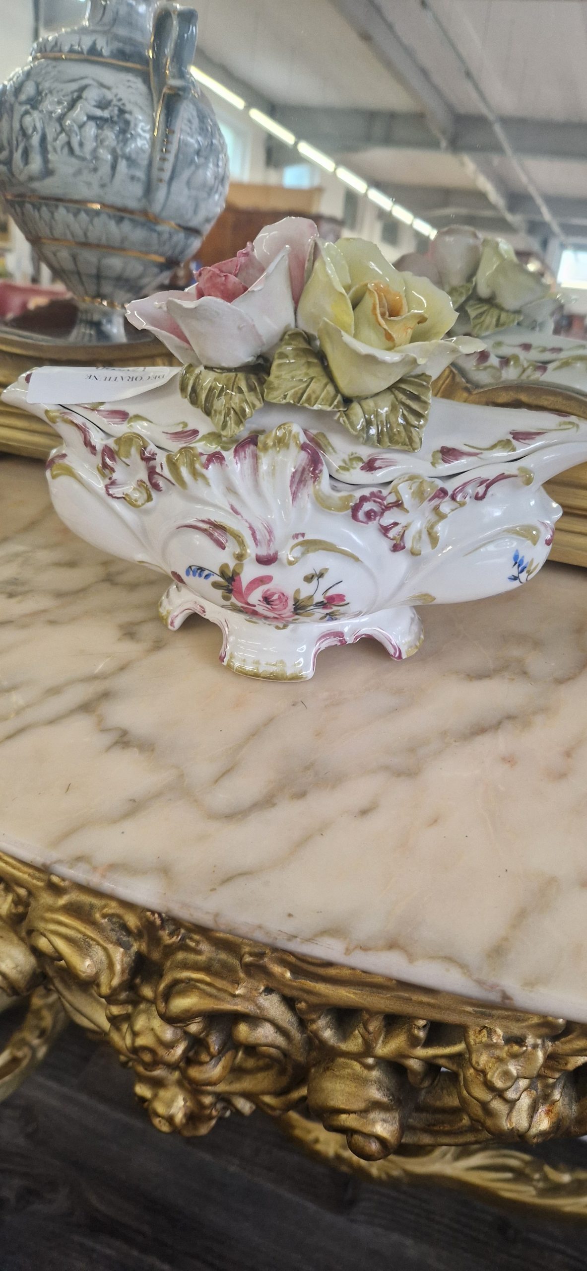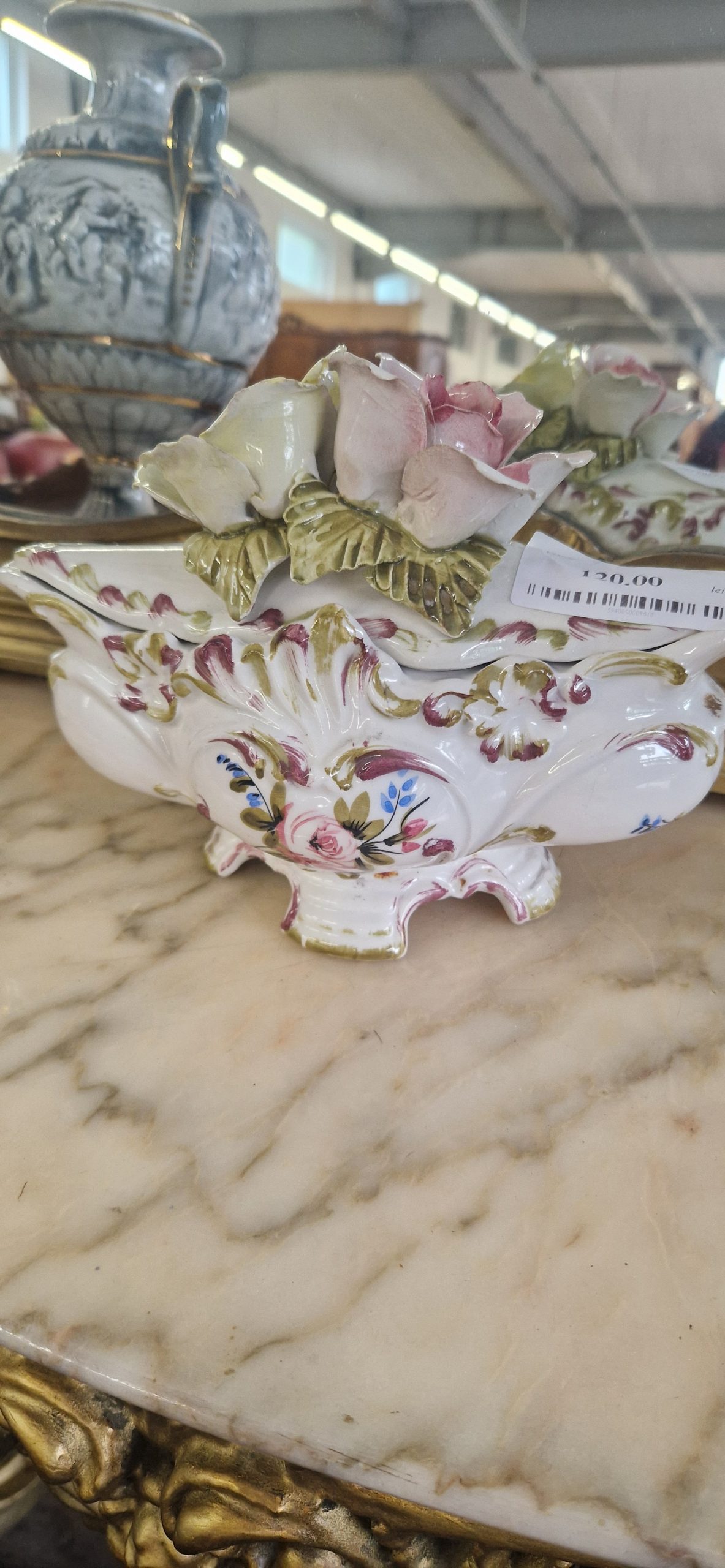 O eleganta decoratiune din portelan Capodimonte, pictat manual si imbogatit cu forme florale in relief