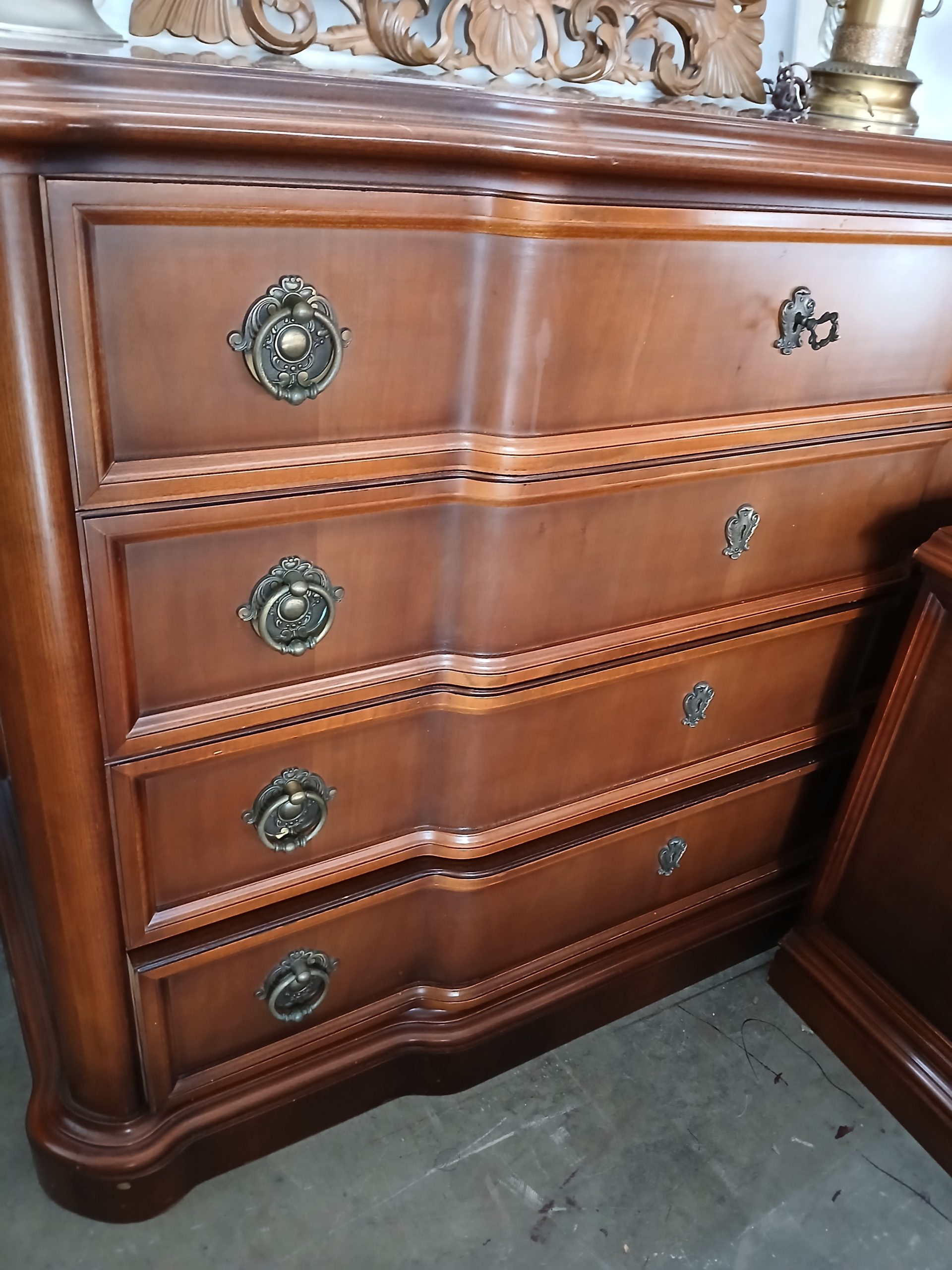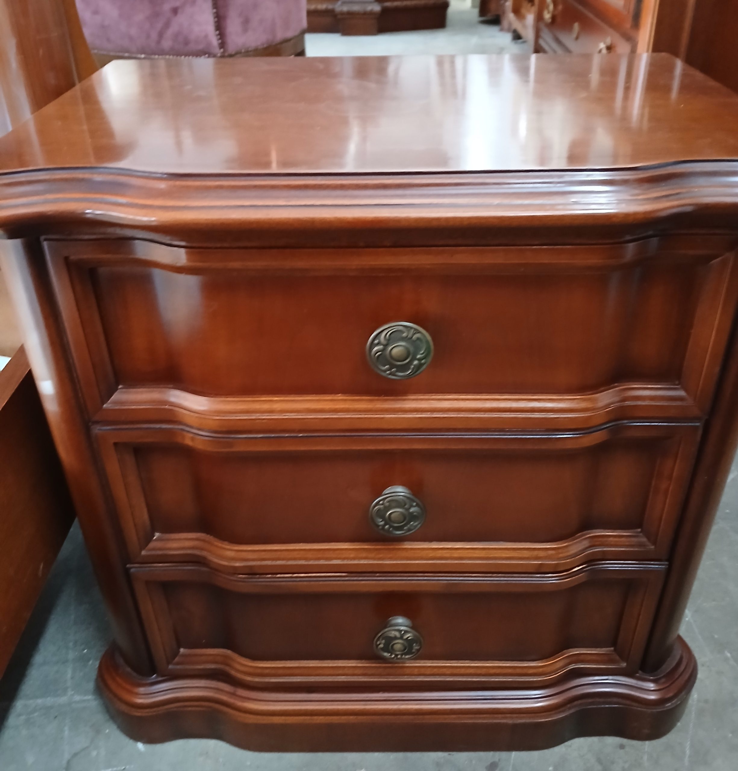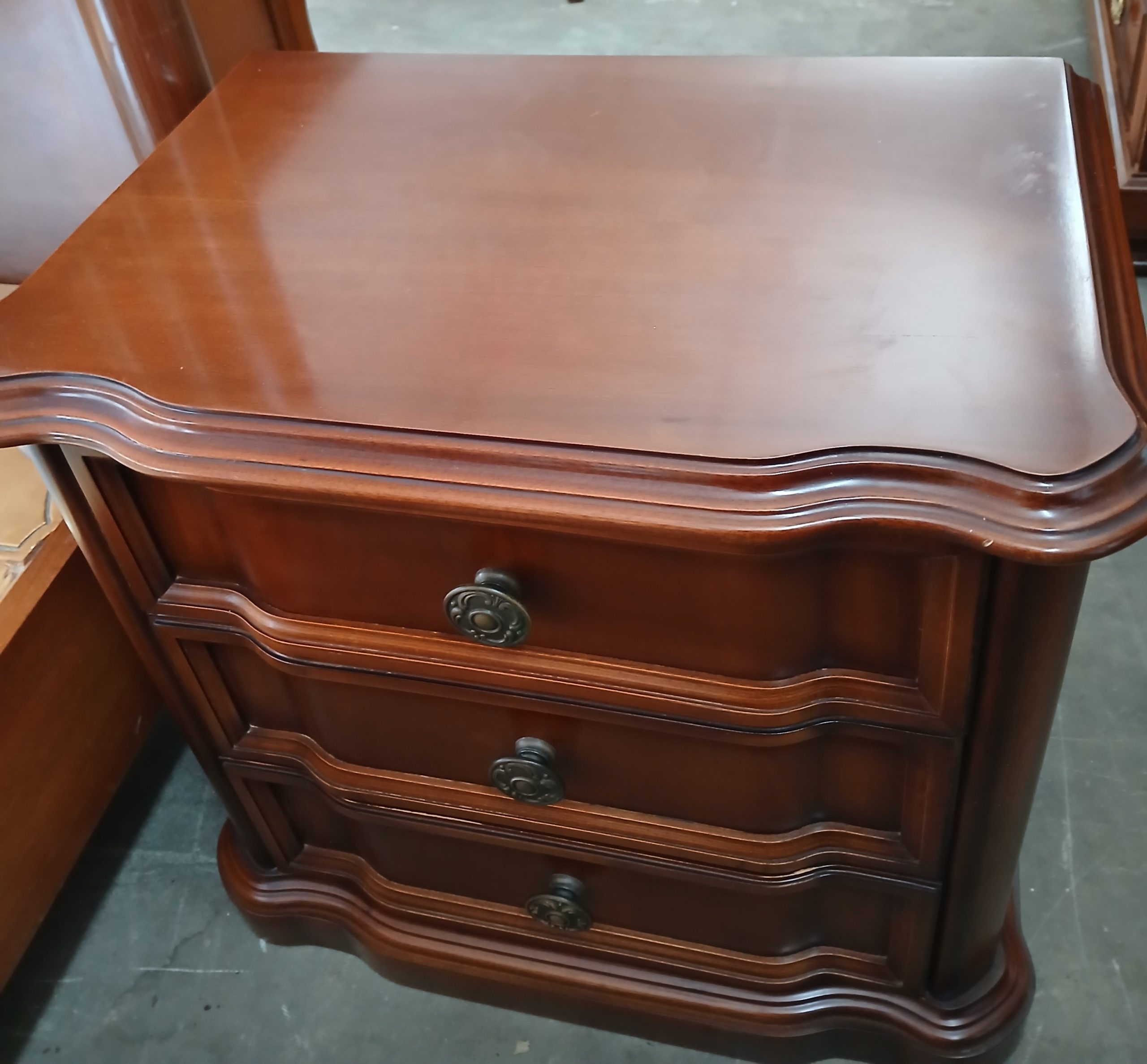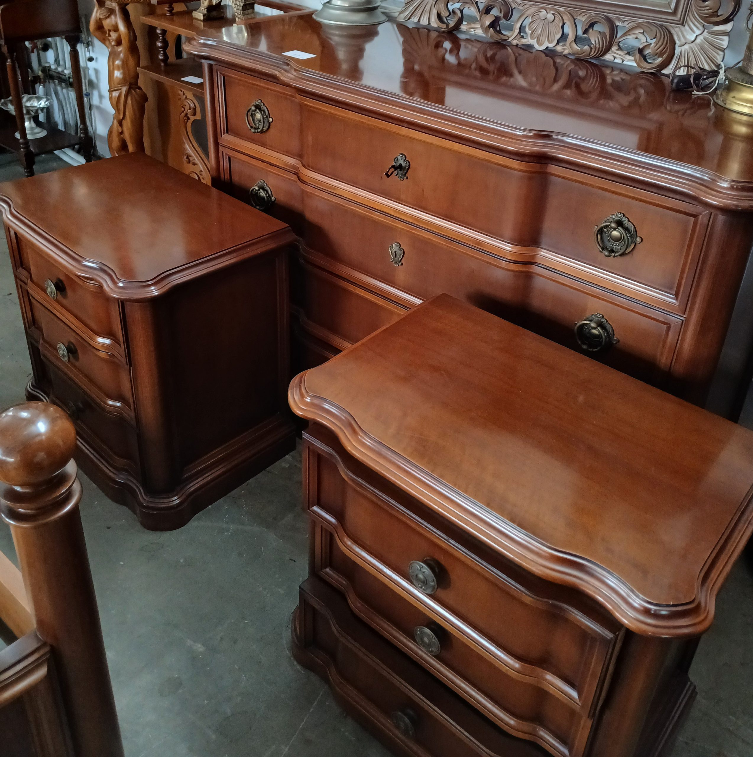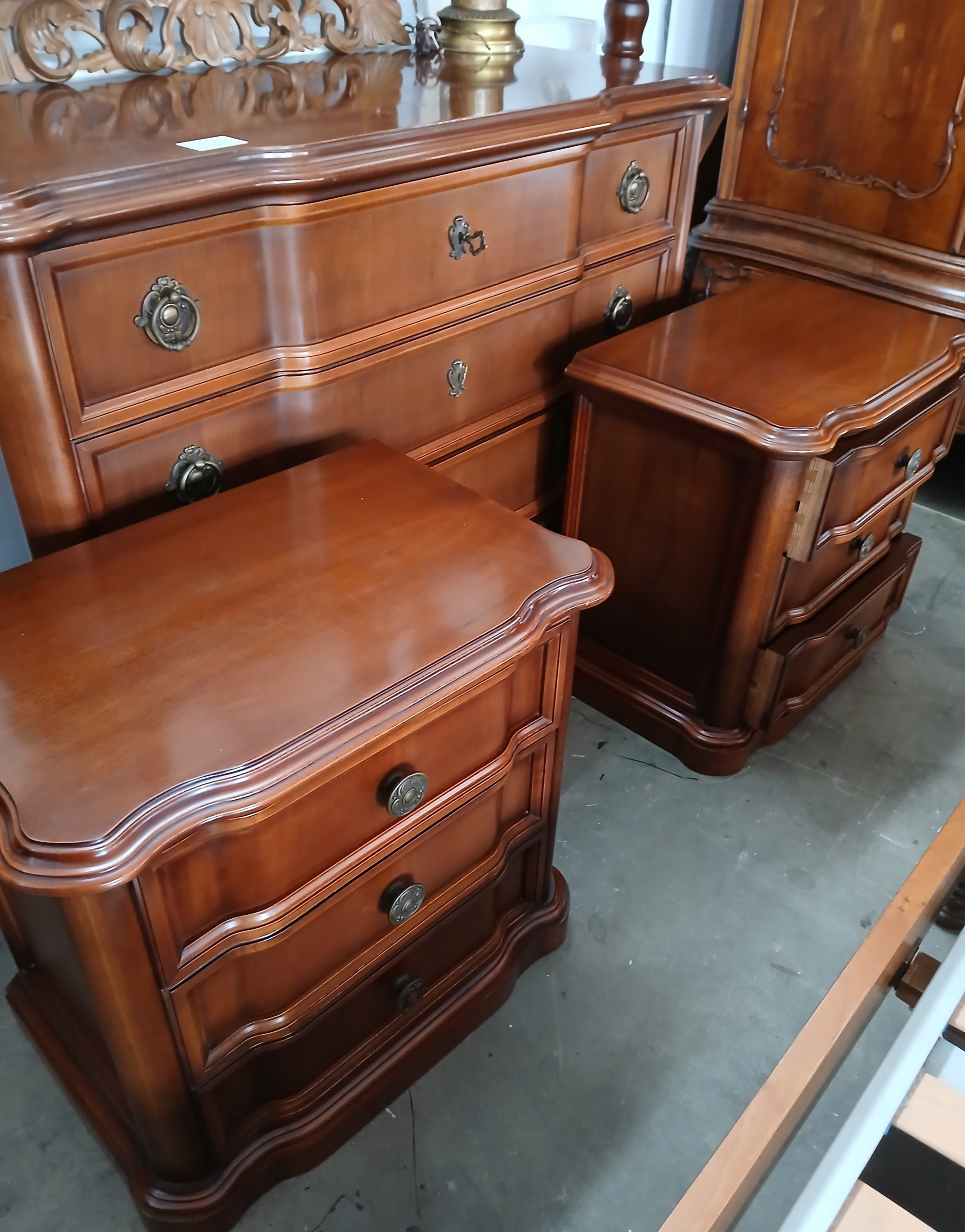 Set de dormitor in stil clasic, realizat din lemn având detalii sculptate manual si forme curbate. Comoda are un design elegant ,cu patru sertare mari si feronerie metalică. Noptierele sunt prevazute cu trei sertare si detalii sculptate care urmează linia comode.