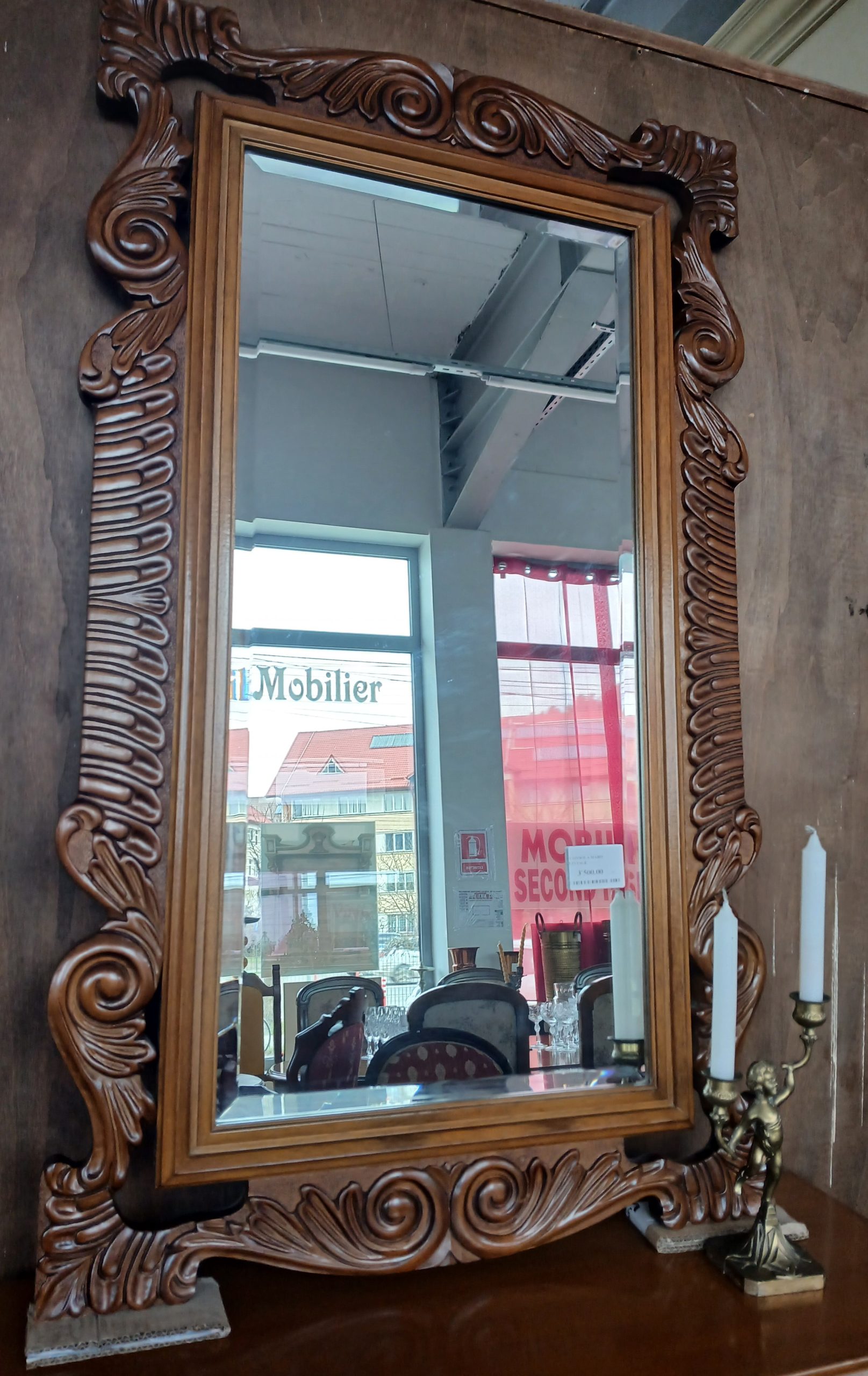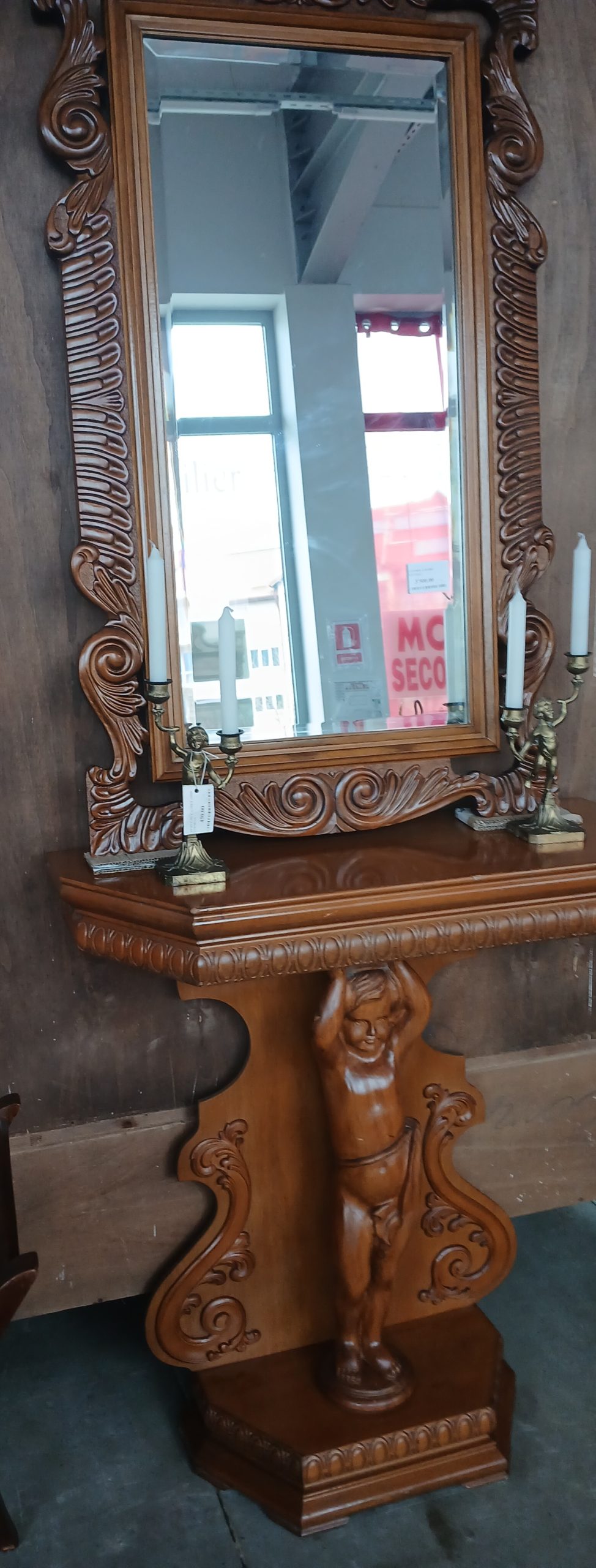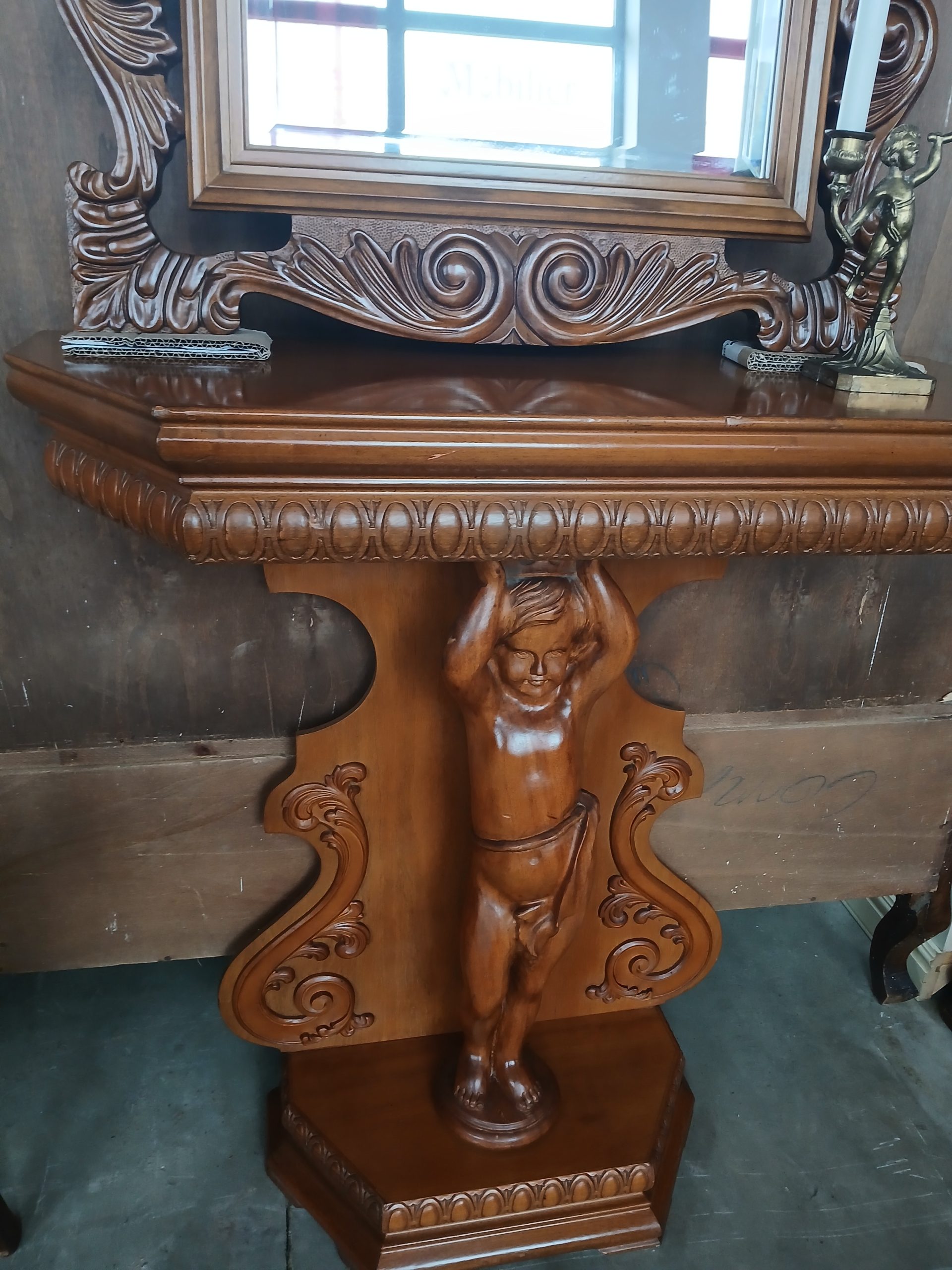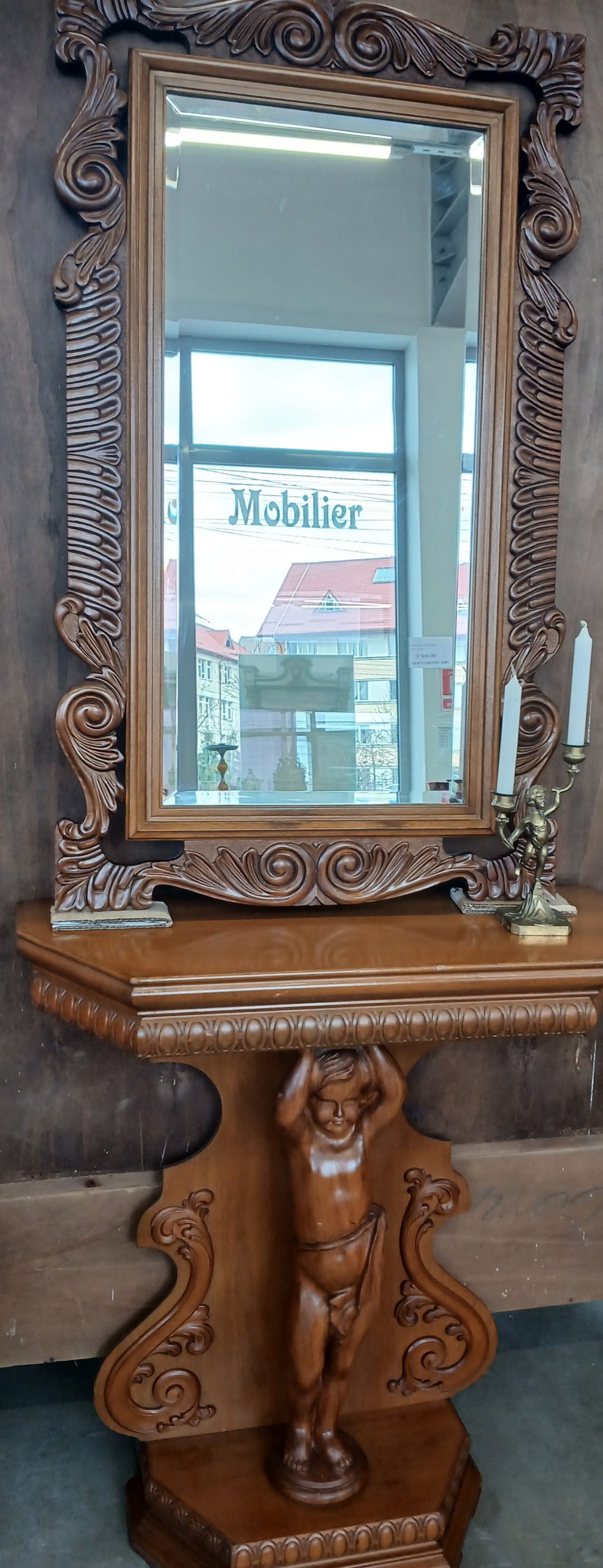 Consolă sculptata cu oglindă asortată din lemn masiv. Aceasta se sprijină pe un picior central impunator, modelat sub forma unui ingeras/ amoras, o trasatură a stilului baroc. Deasupra consolei se află o oglindă din cristal cu margini fazetate si ramă din lemn bogat ornamentată.