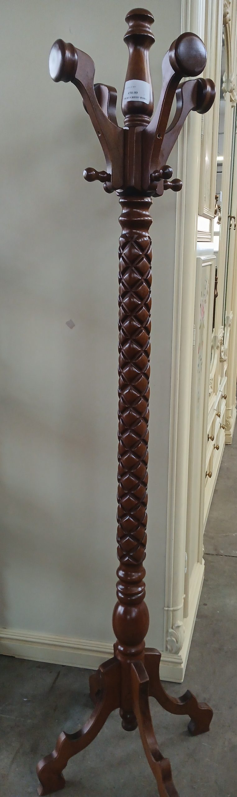 Acesta este un cuier de lemn in stil vintage, model pom,ideal pentru organizarea hainelor si accesoriilor in hol.Prezintă detalii decorative sculptate si are un fus central torsadat(stil”Barley Twist”)si o bază stabilă cu patru picioare.Are inaltimea de 172 cm.