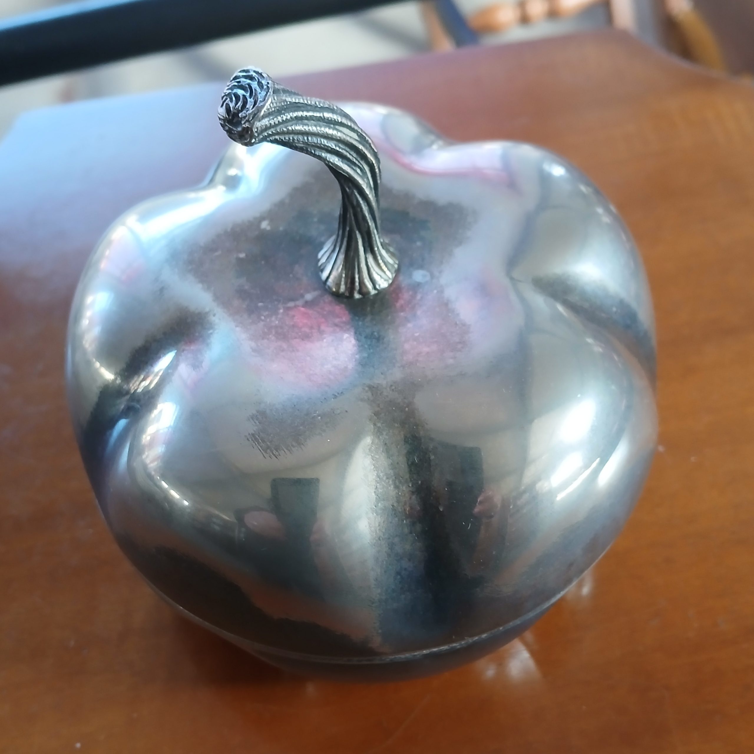 Este o cutie decorativă vintage in formă de dovleac,argintată,realizată in Italia in anii 1970.