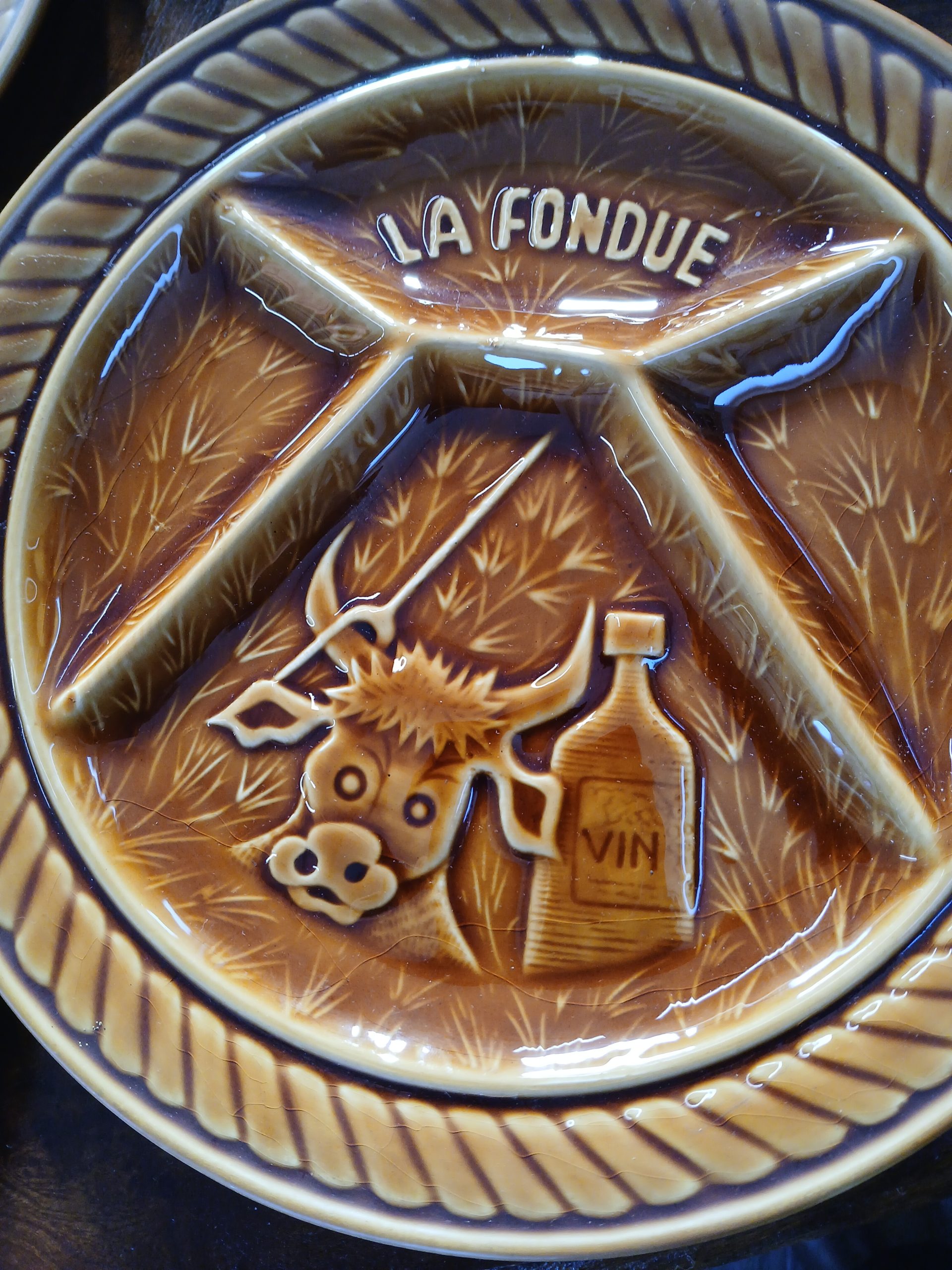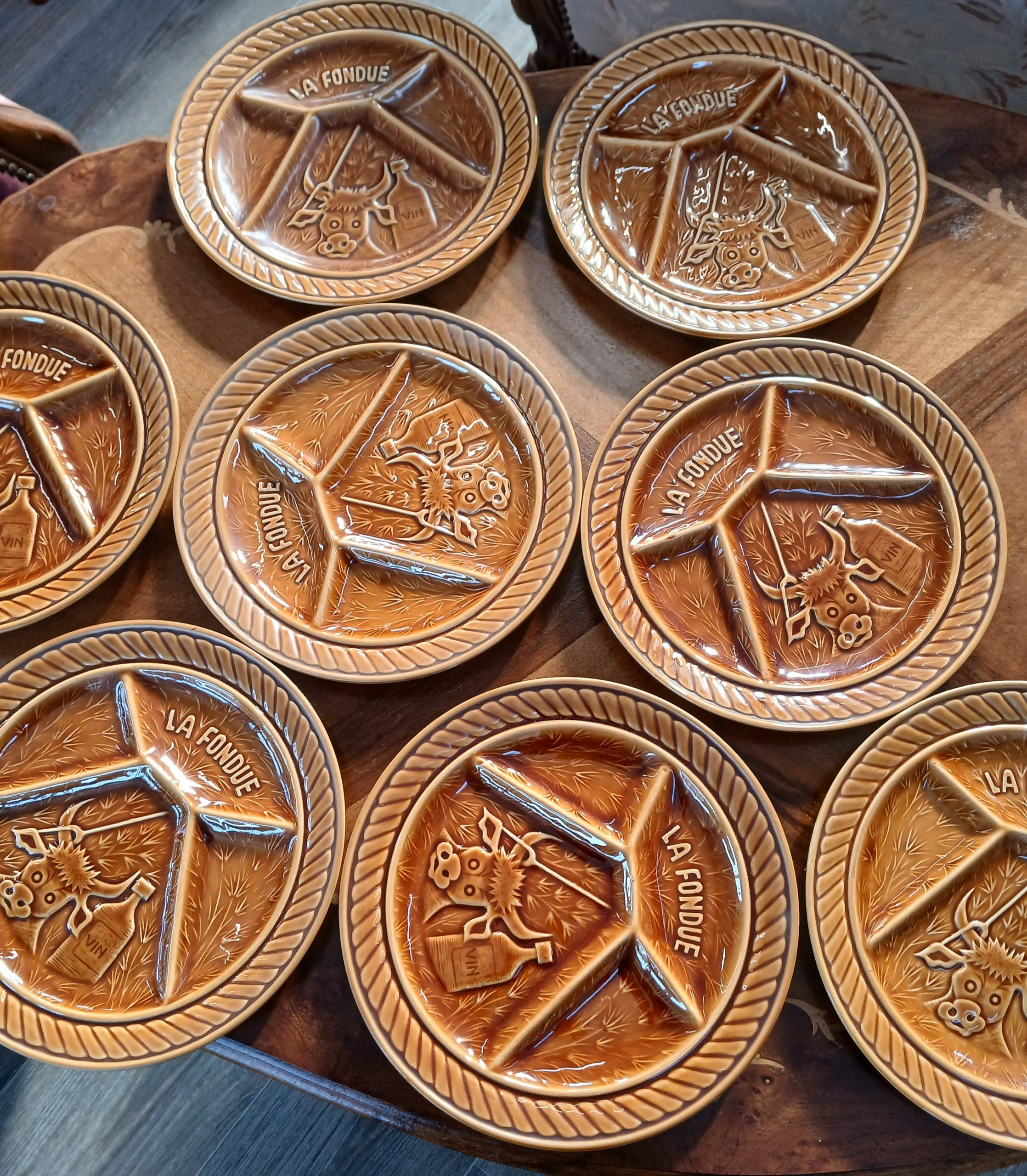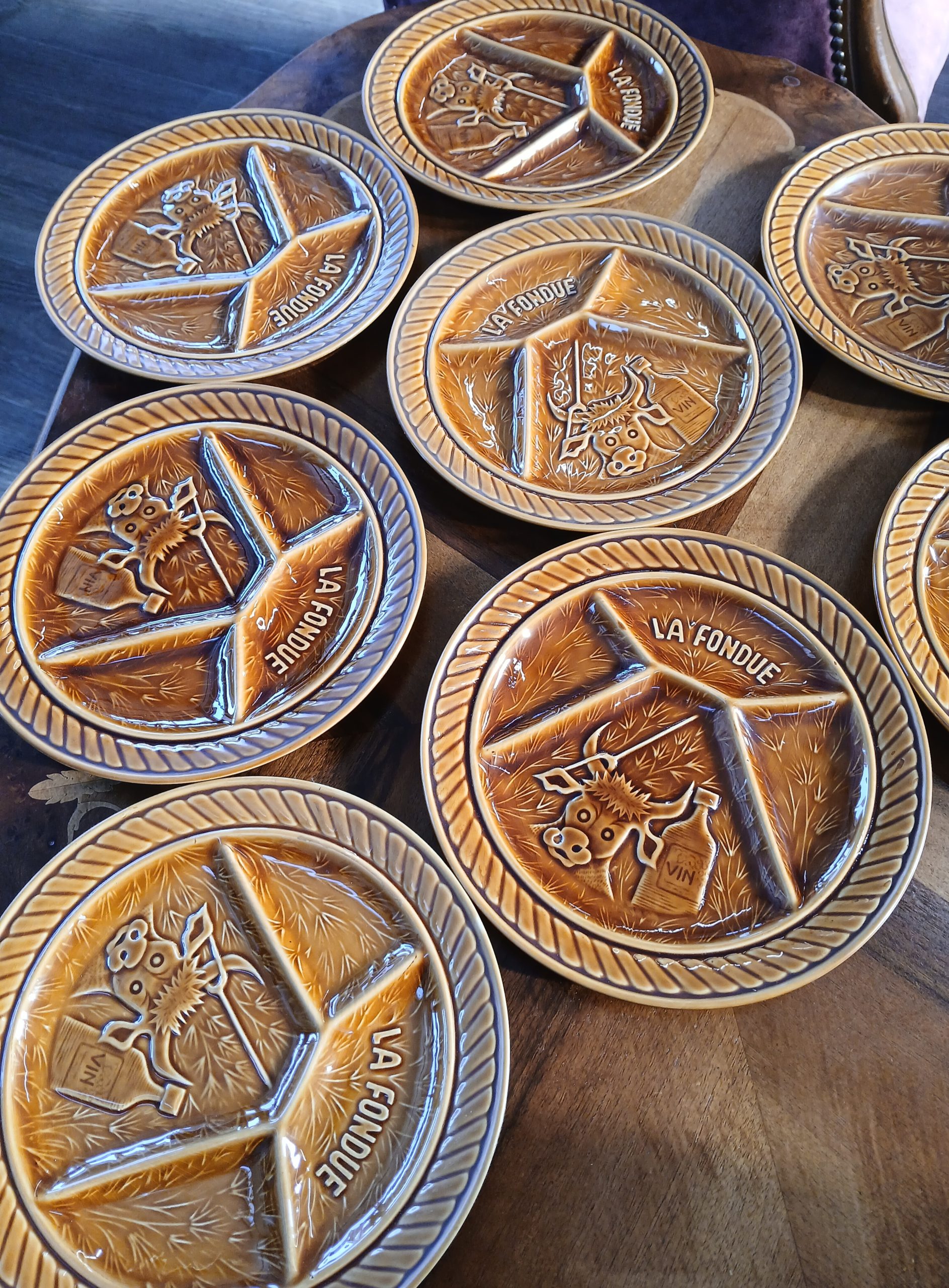 Farfurii ceramice maro,special concepute cu compartimente pentru fondue si gravuri tematice (mentionand “La Fondue”si “Vin”).