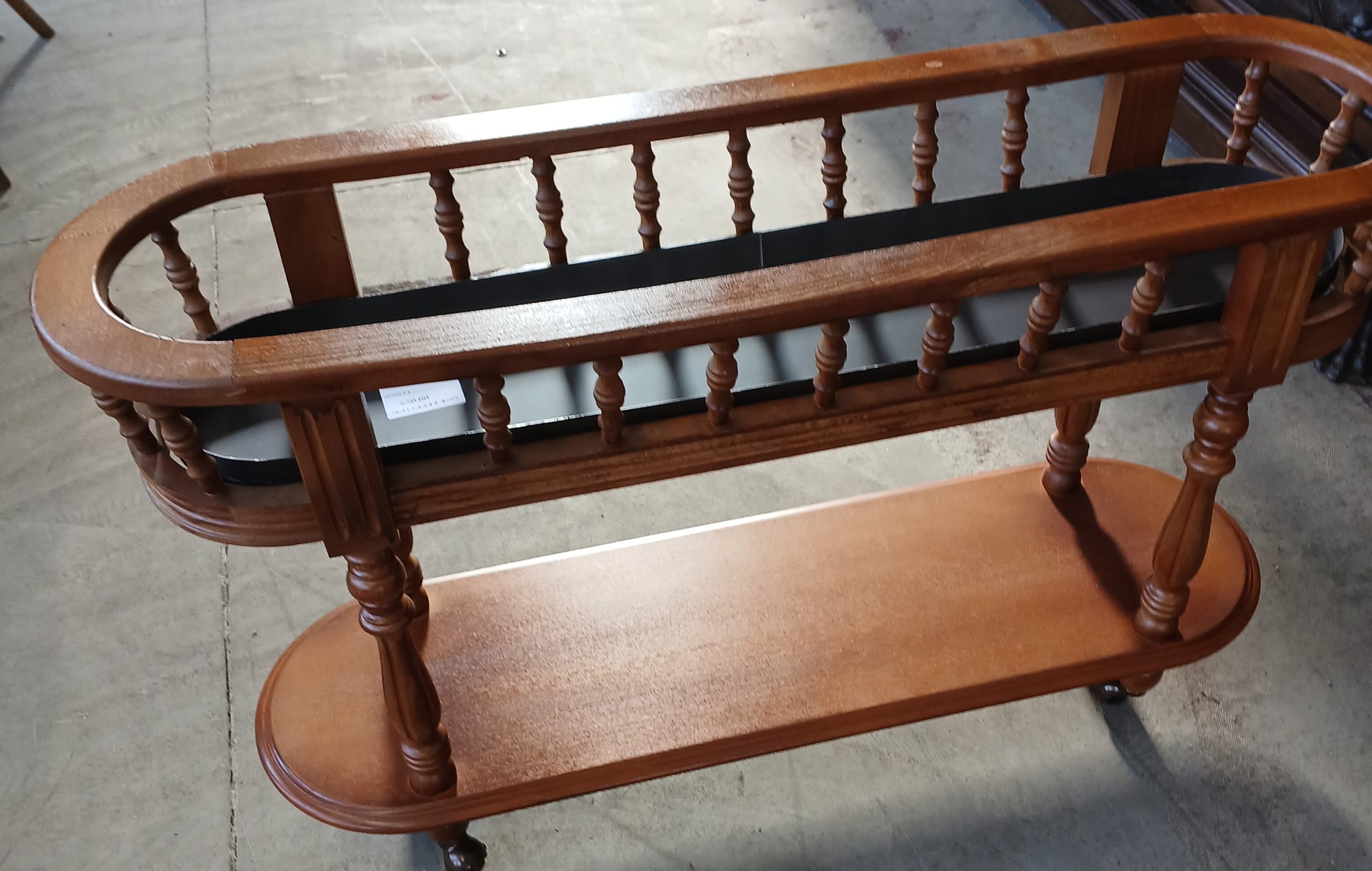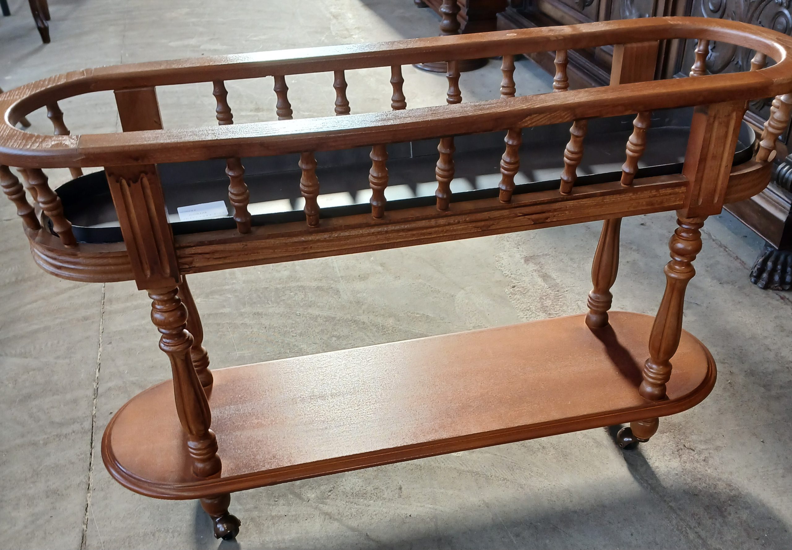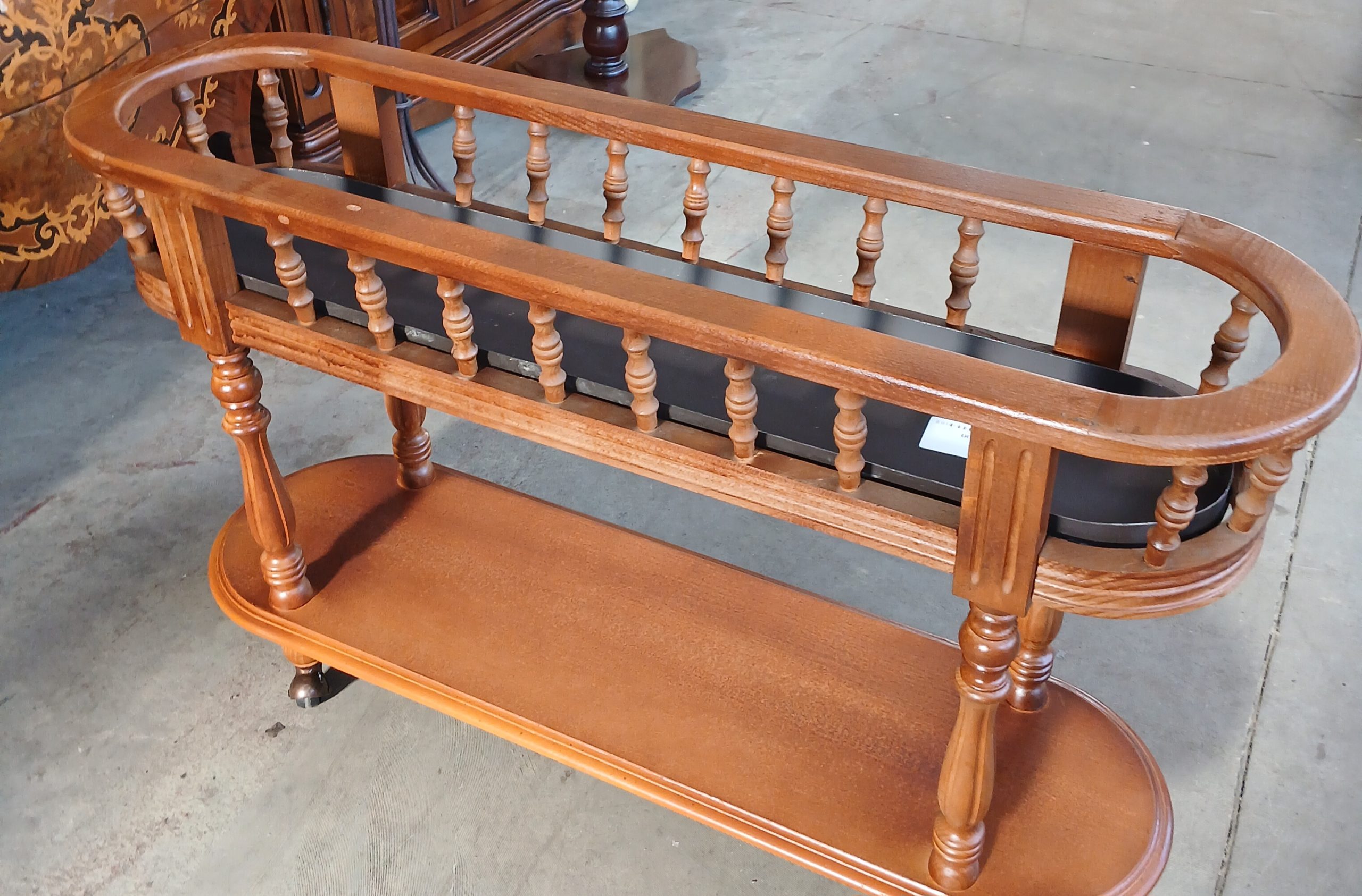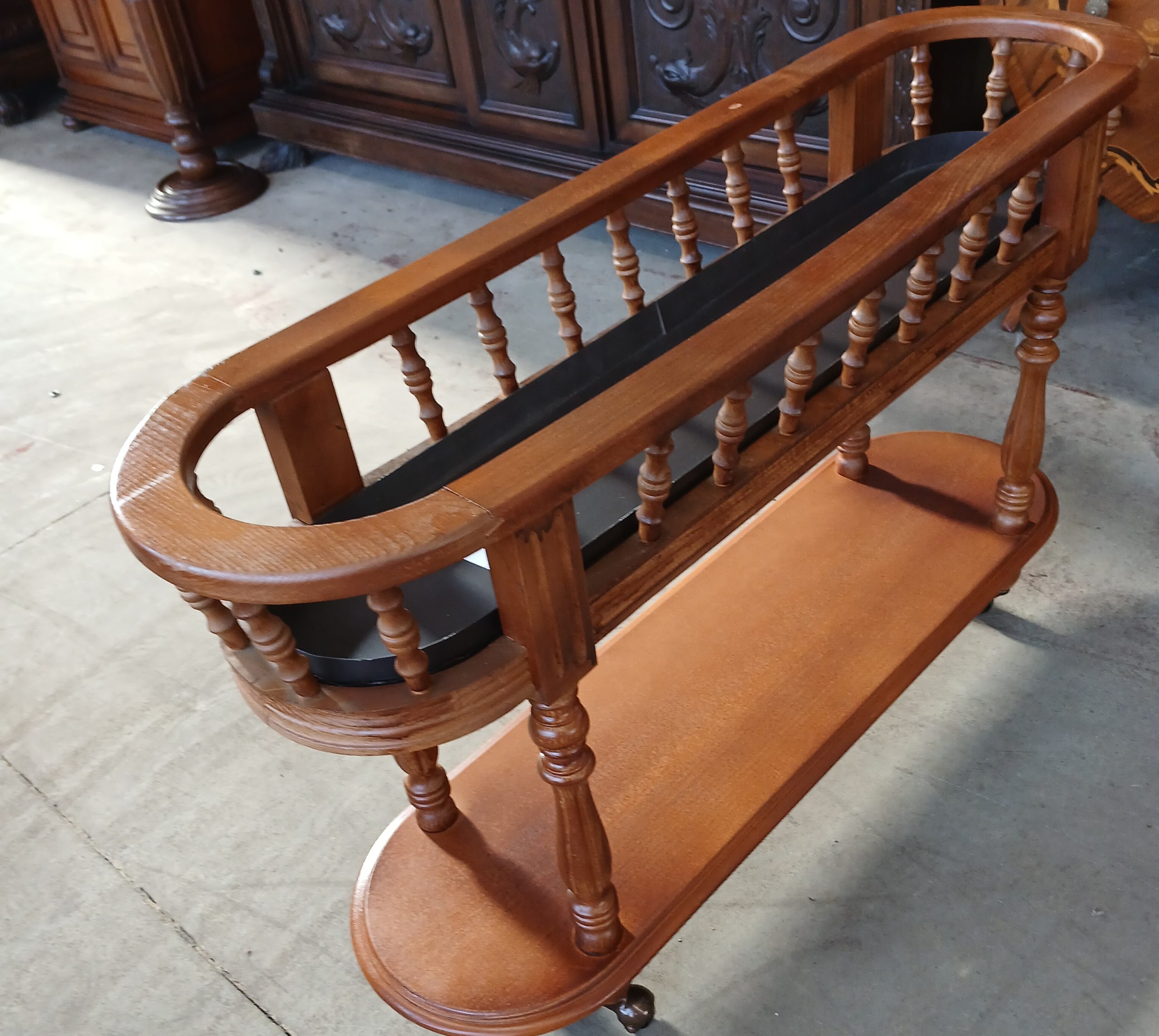 Este din lemn masiv si prezintă un design clasic cu balustradă si doua niveluri.