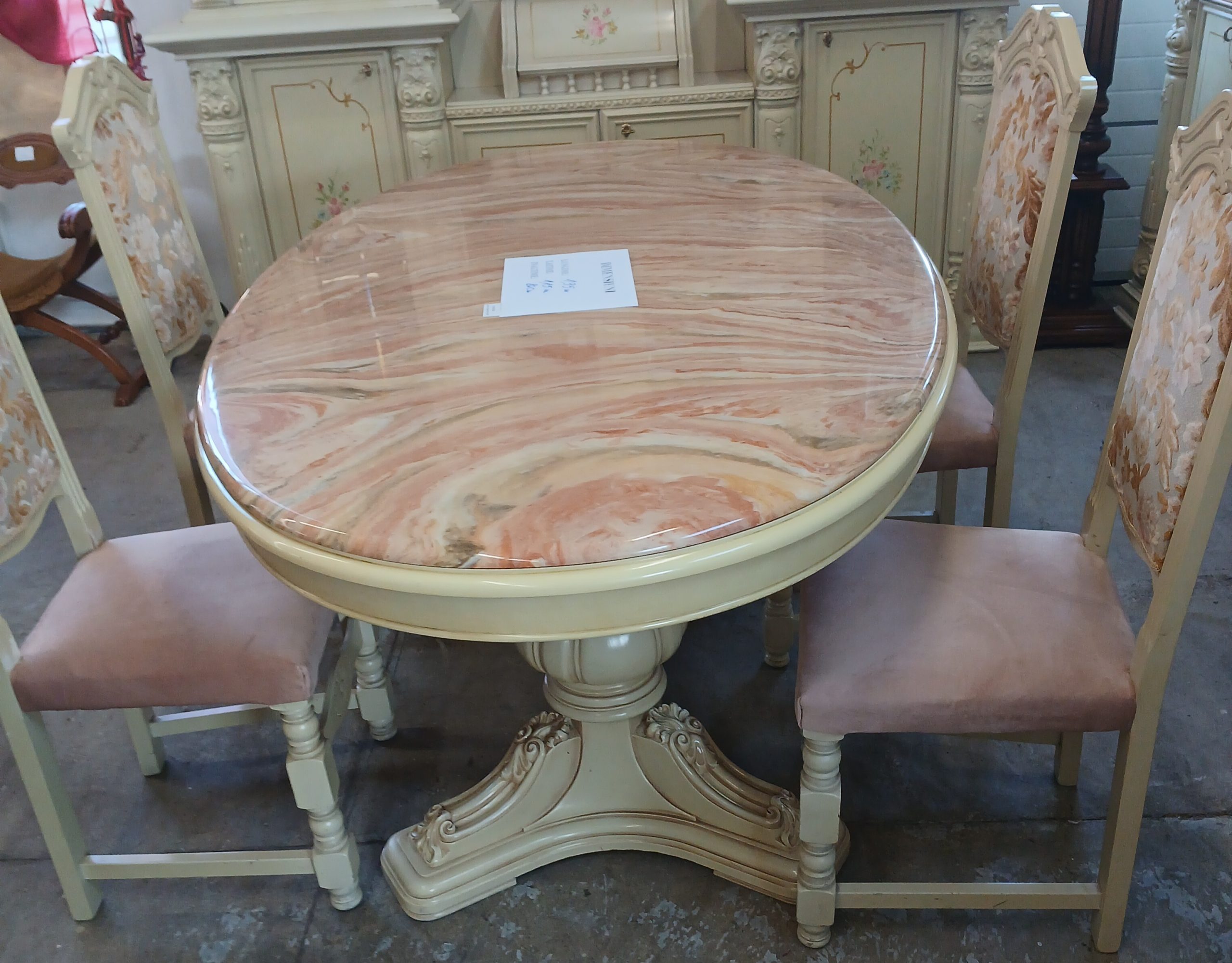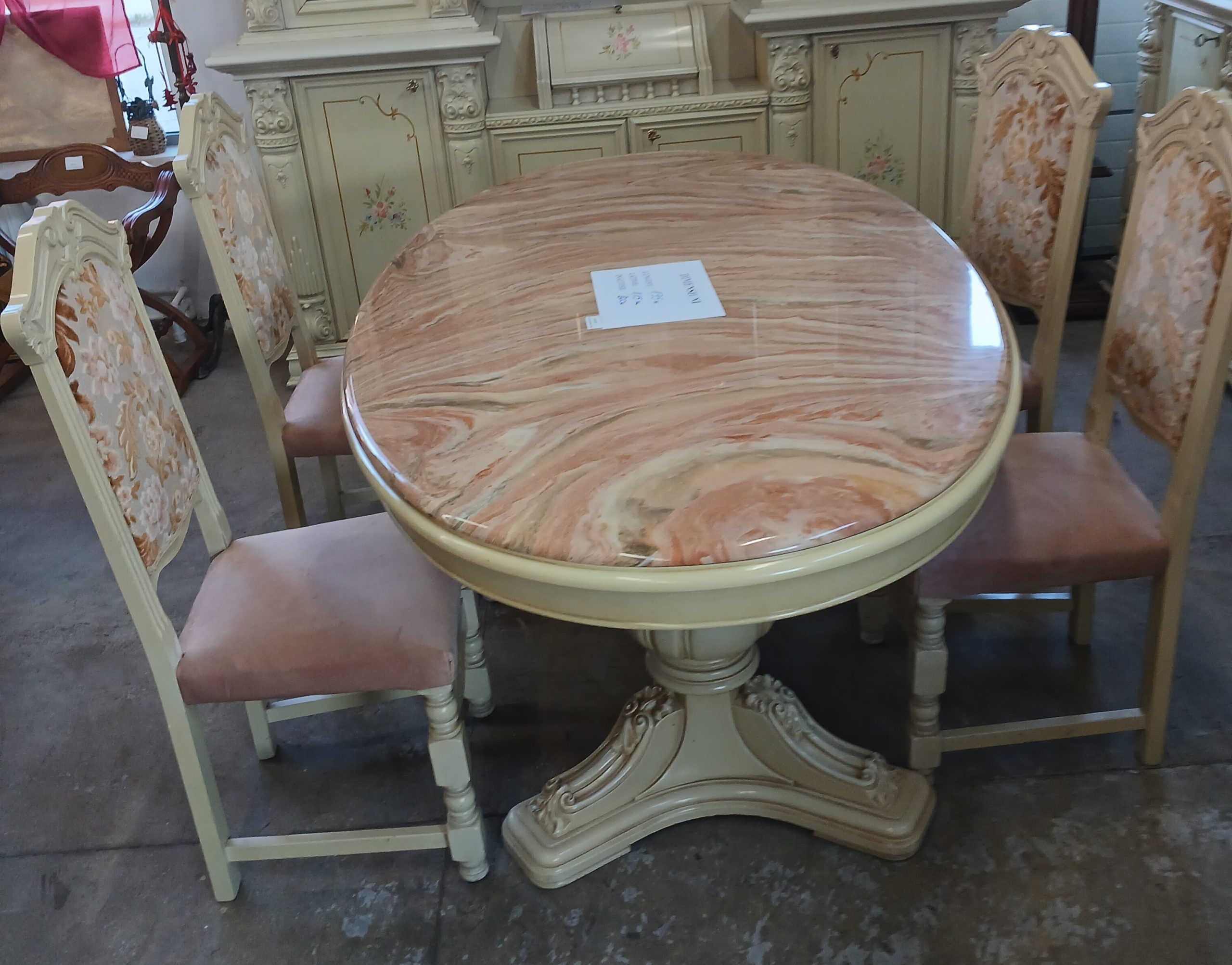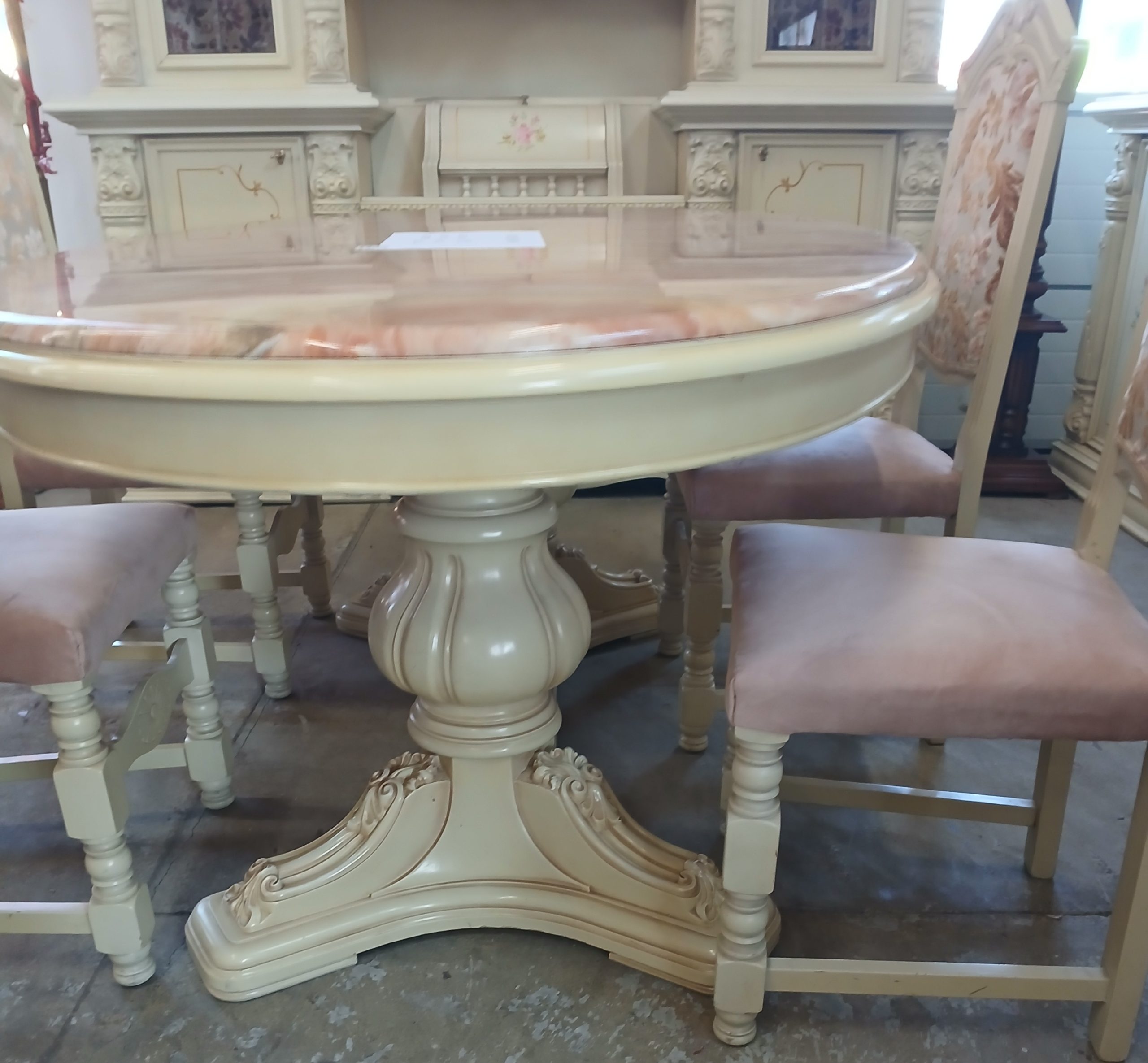 Acest set de mobilier include o masă de sufragerie cu patru scaune,in stil baroc, caracterizată prin picioare sculptate masive si un blat de marmură.