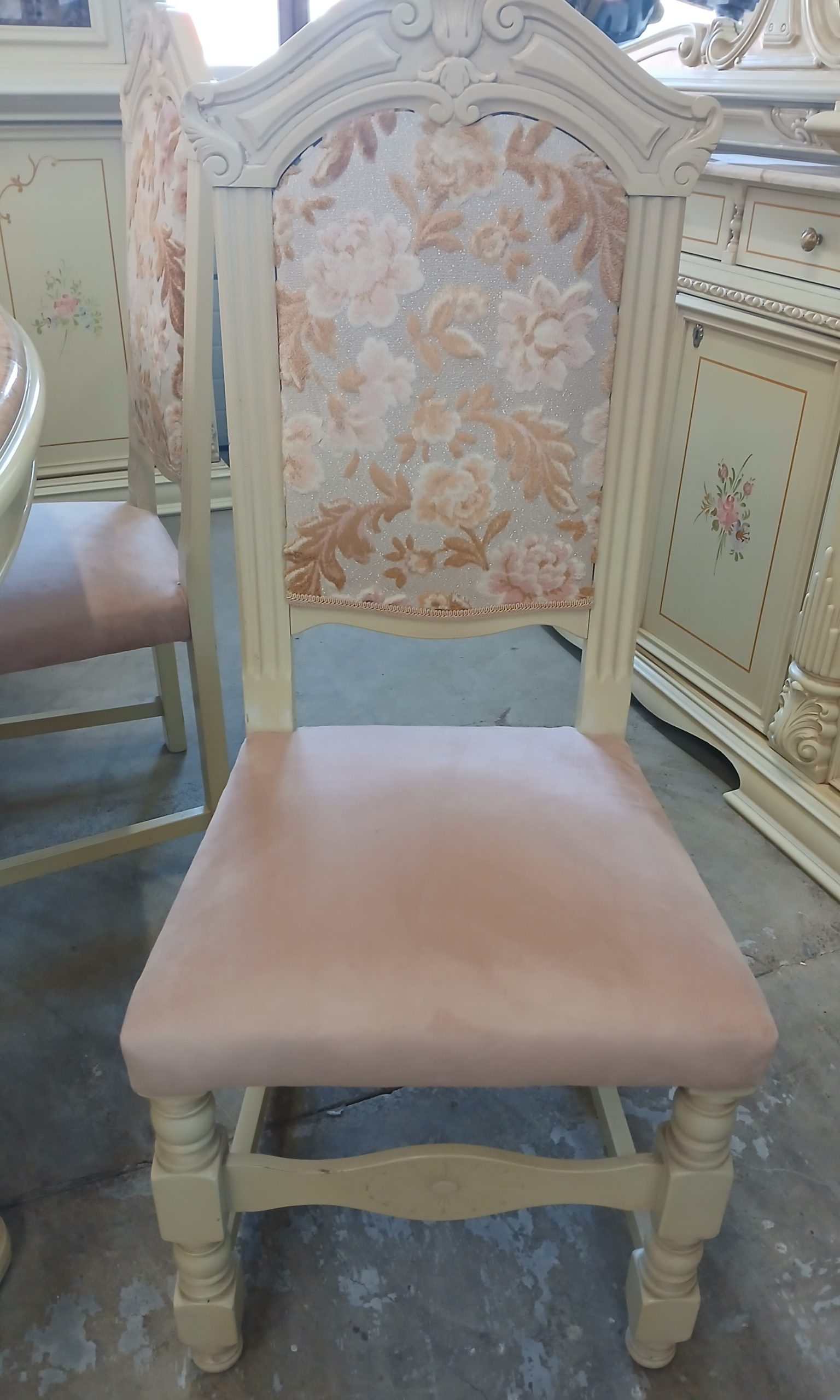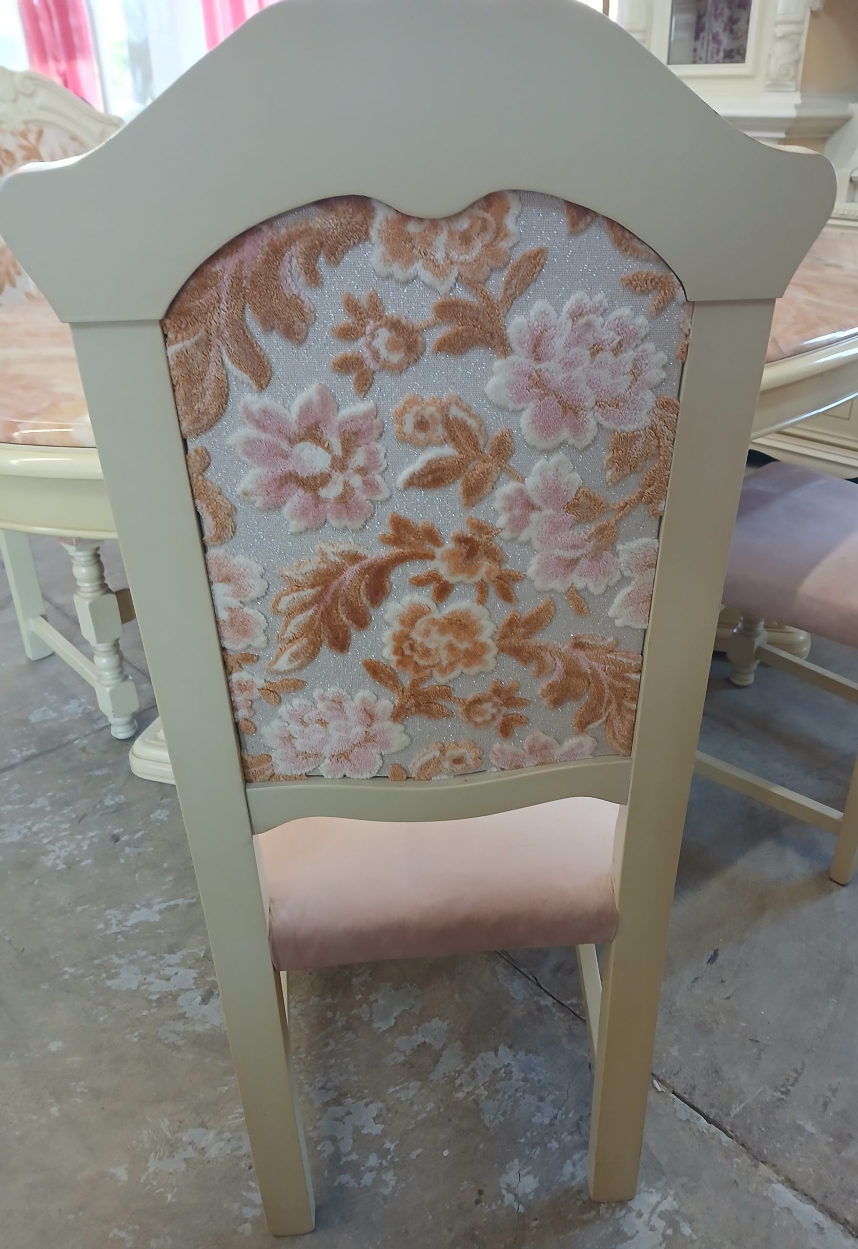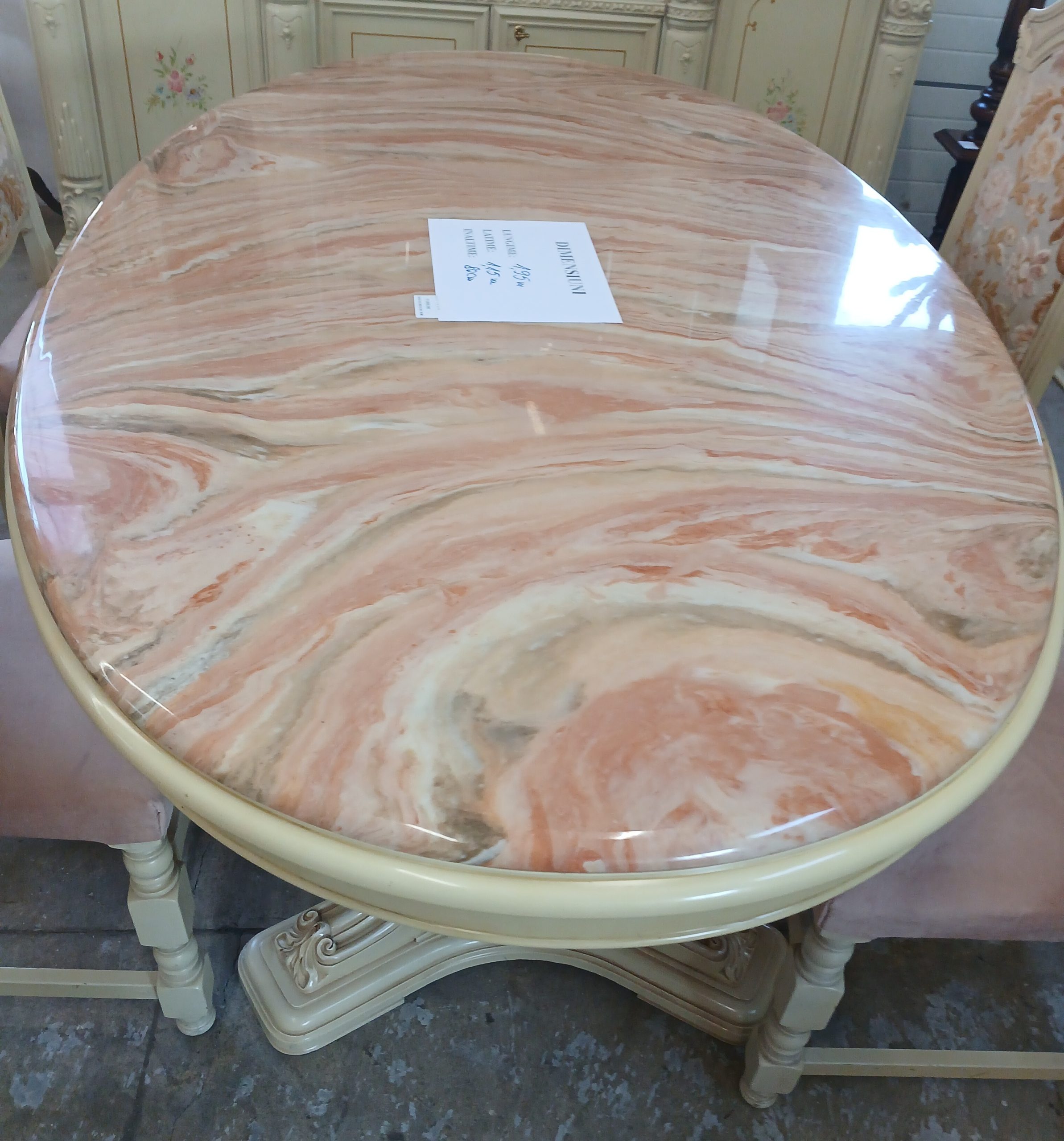 Acest set de mobilier include o masă de sufragerie cu patru scaune,in stil baroc, caracterizată prin picioare sculptate masive si un blat de marmură.