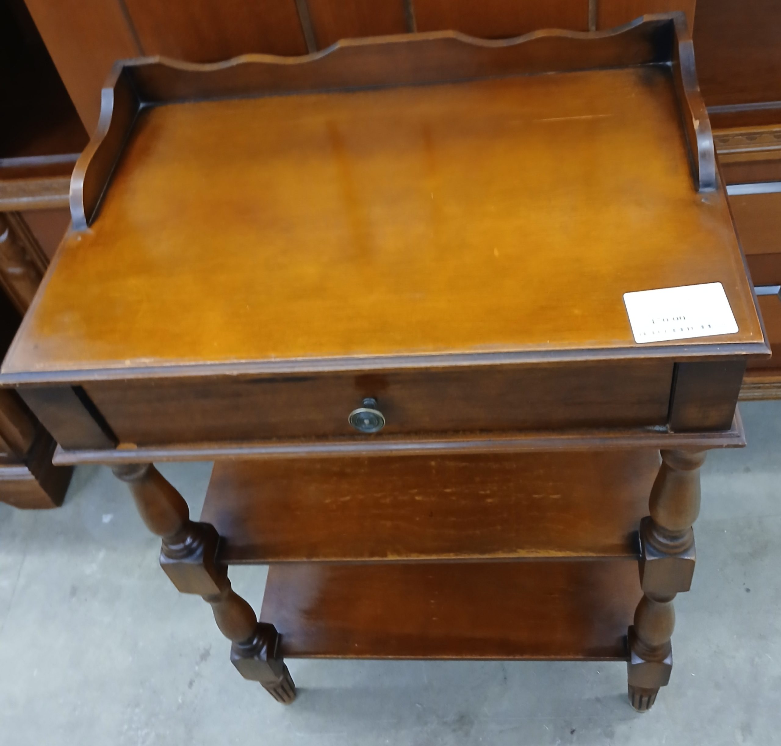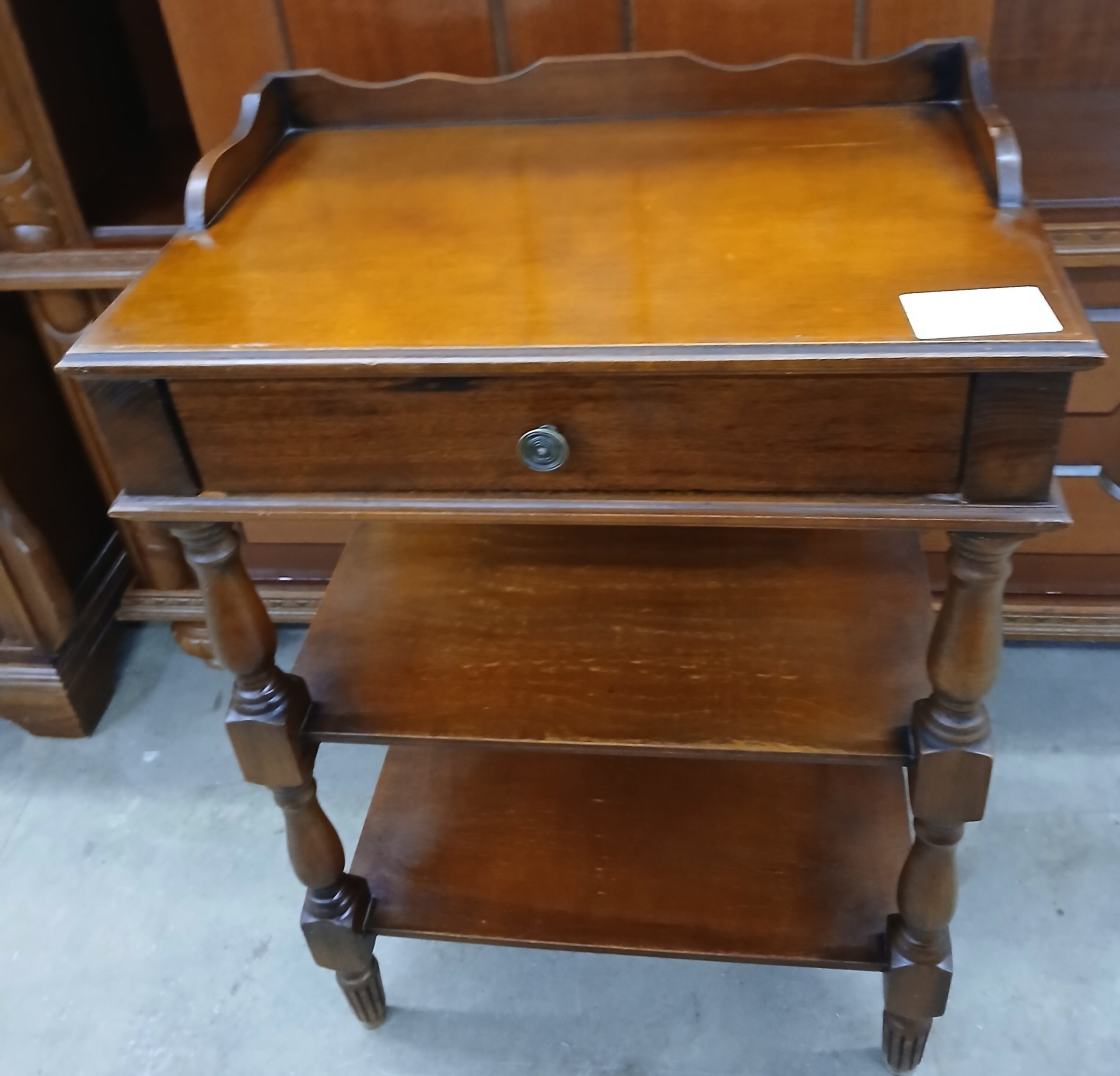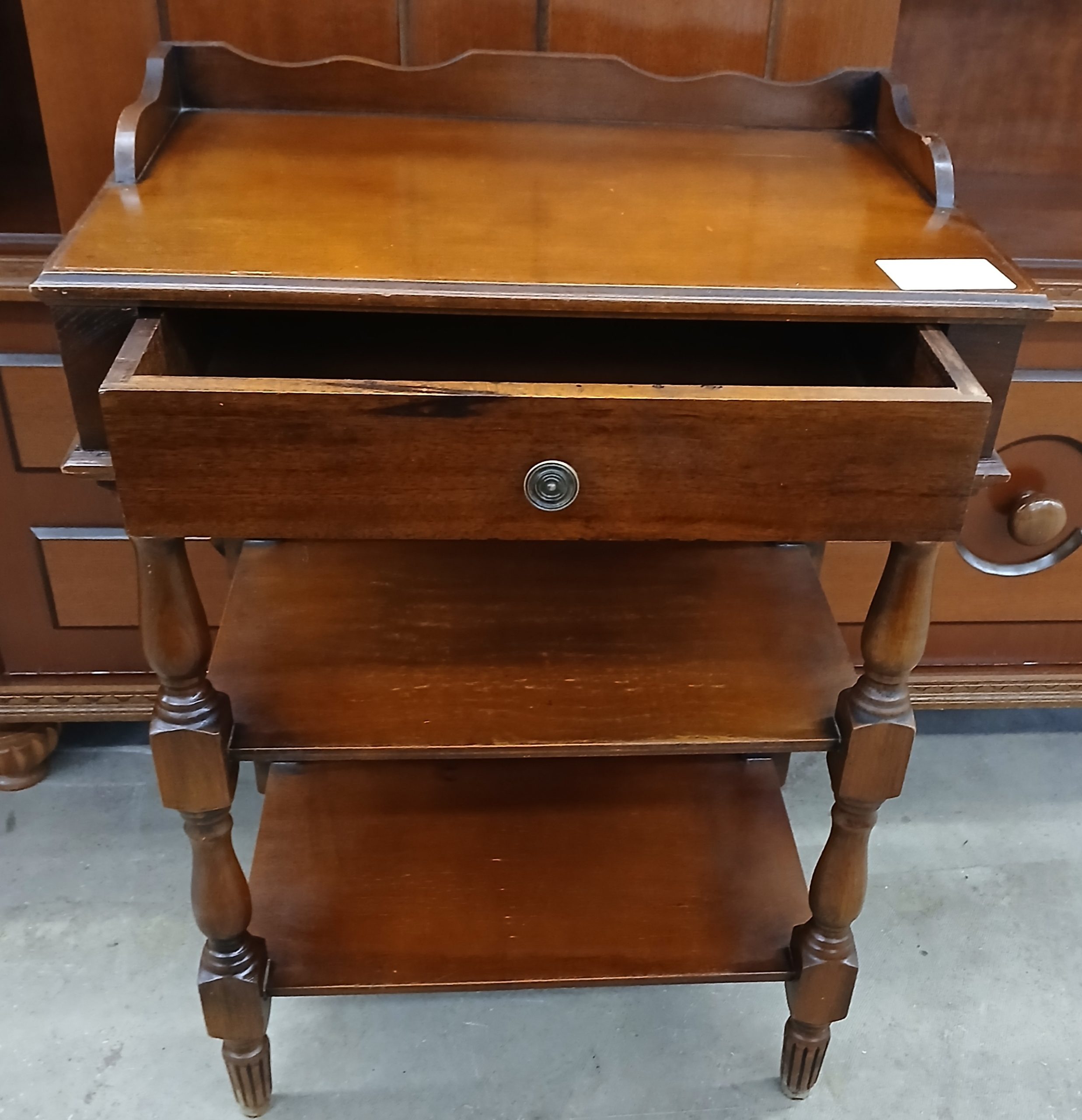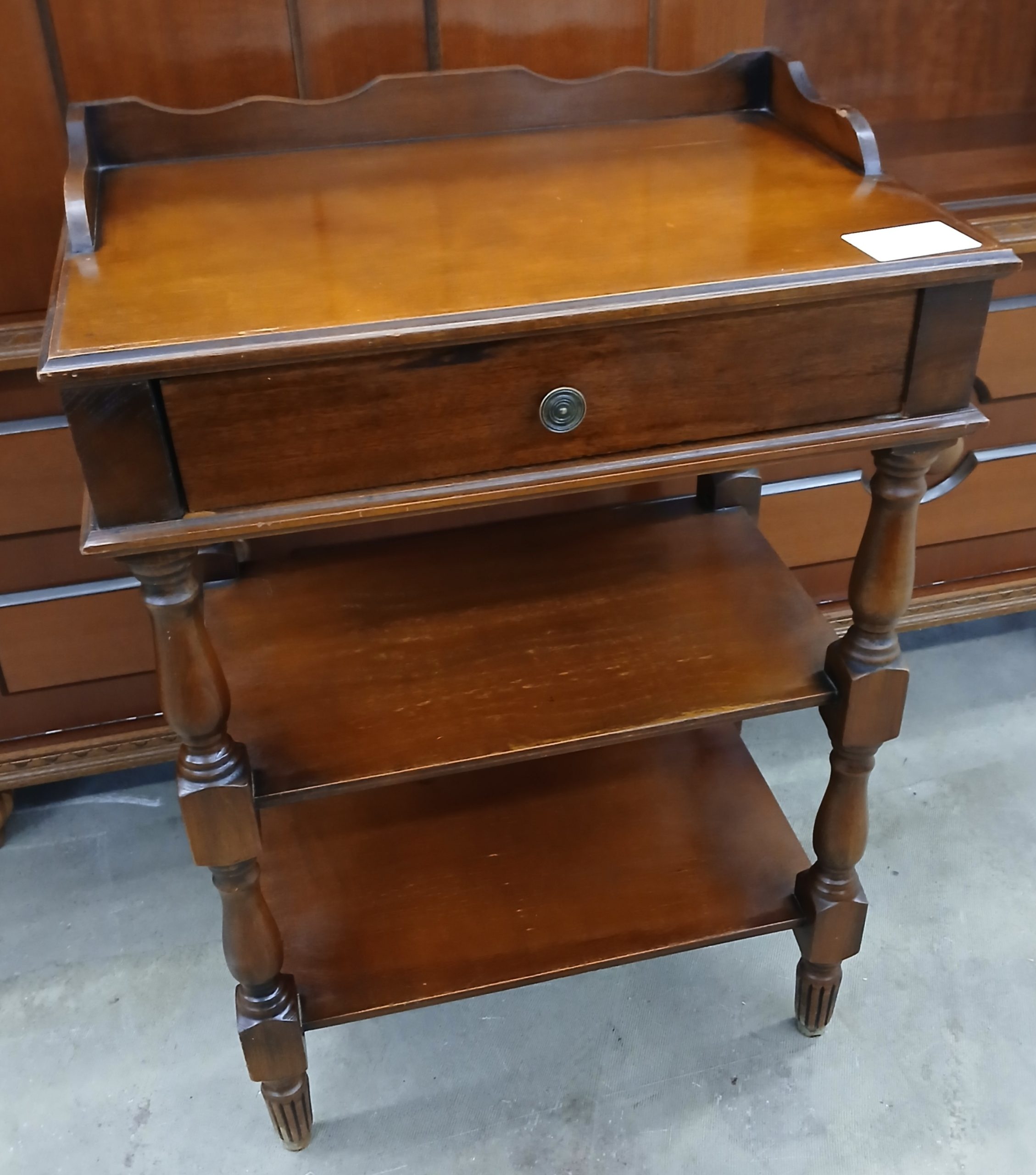 Aceasta este o măsuță de tip”whatnot” sau o etajeră de epocă cu sertar, realizată într-un stil clasic. Este o piesă multifuncțională concepută pentru a fi utilizată ca noptieră, masută laterală sau suport pentru obiecte decorative si cărți. Dispune de un sertar superior si două rafturi deschise pentru depozitare. Are lungimea de 47cm, latimea de 31cm si înălțimea de 67cm.