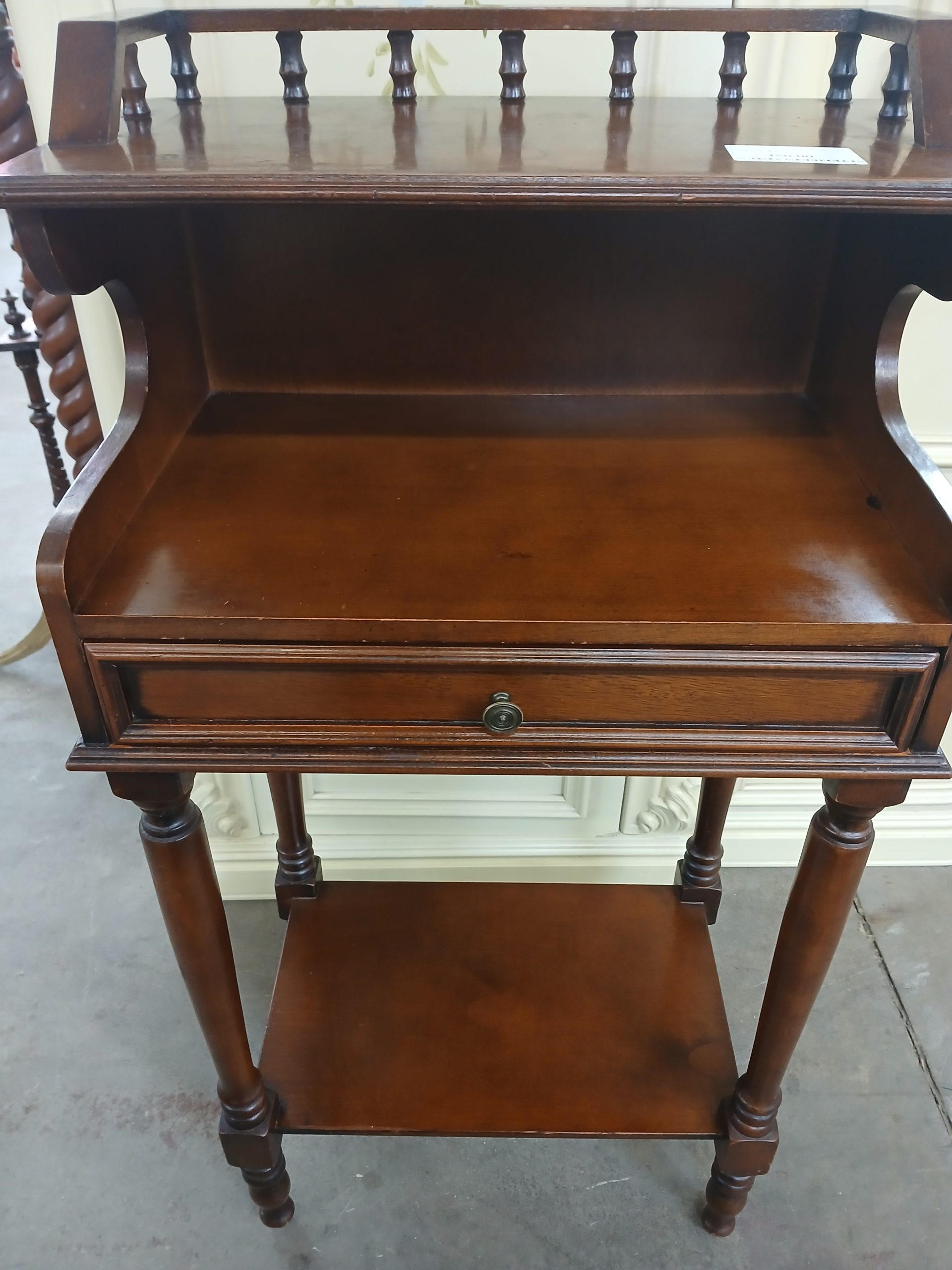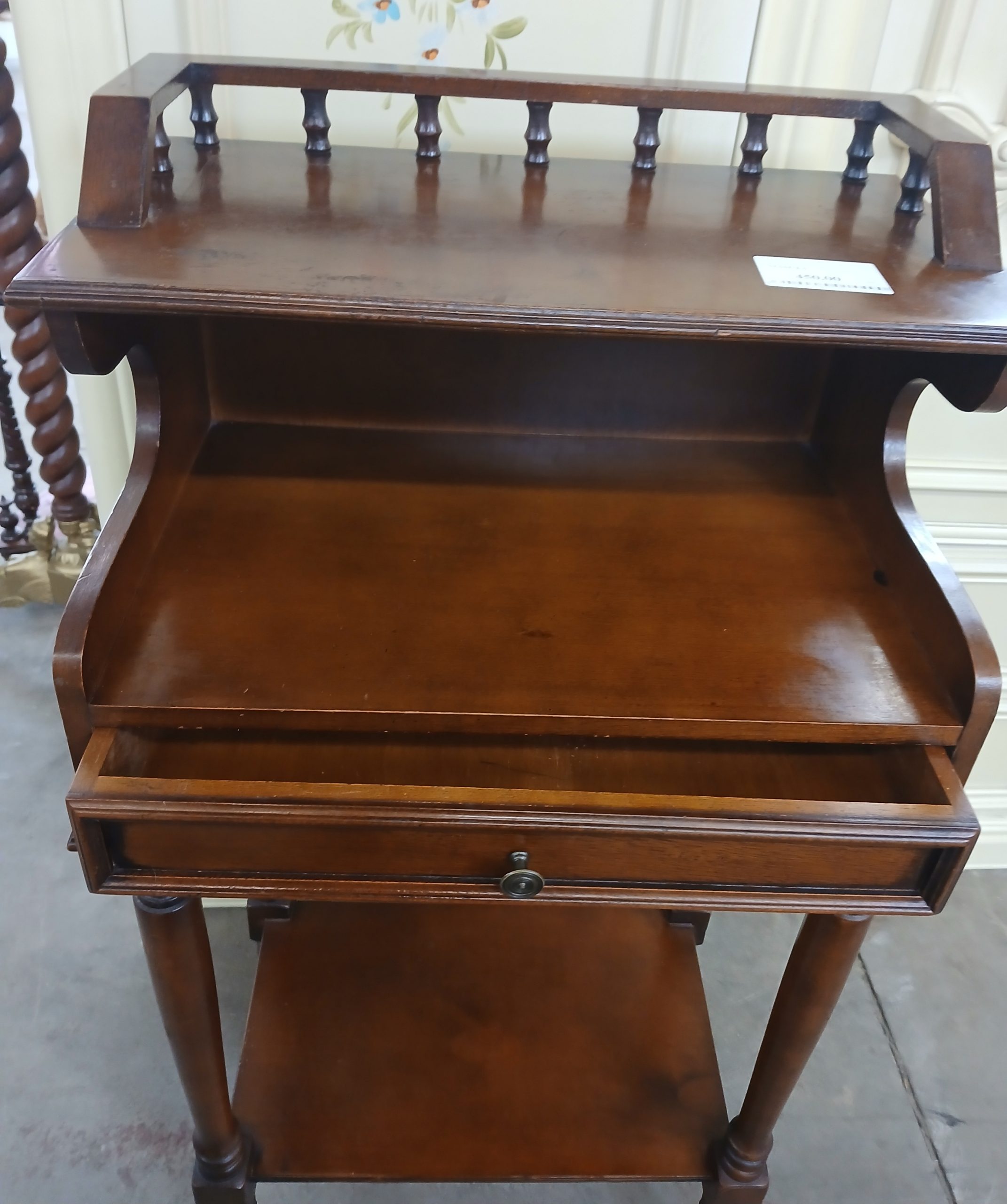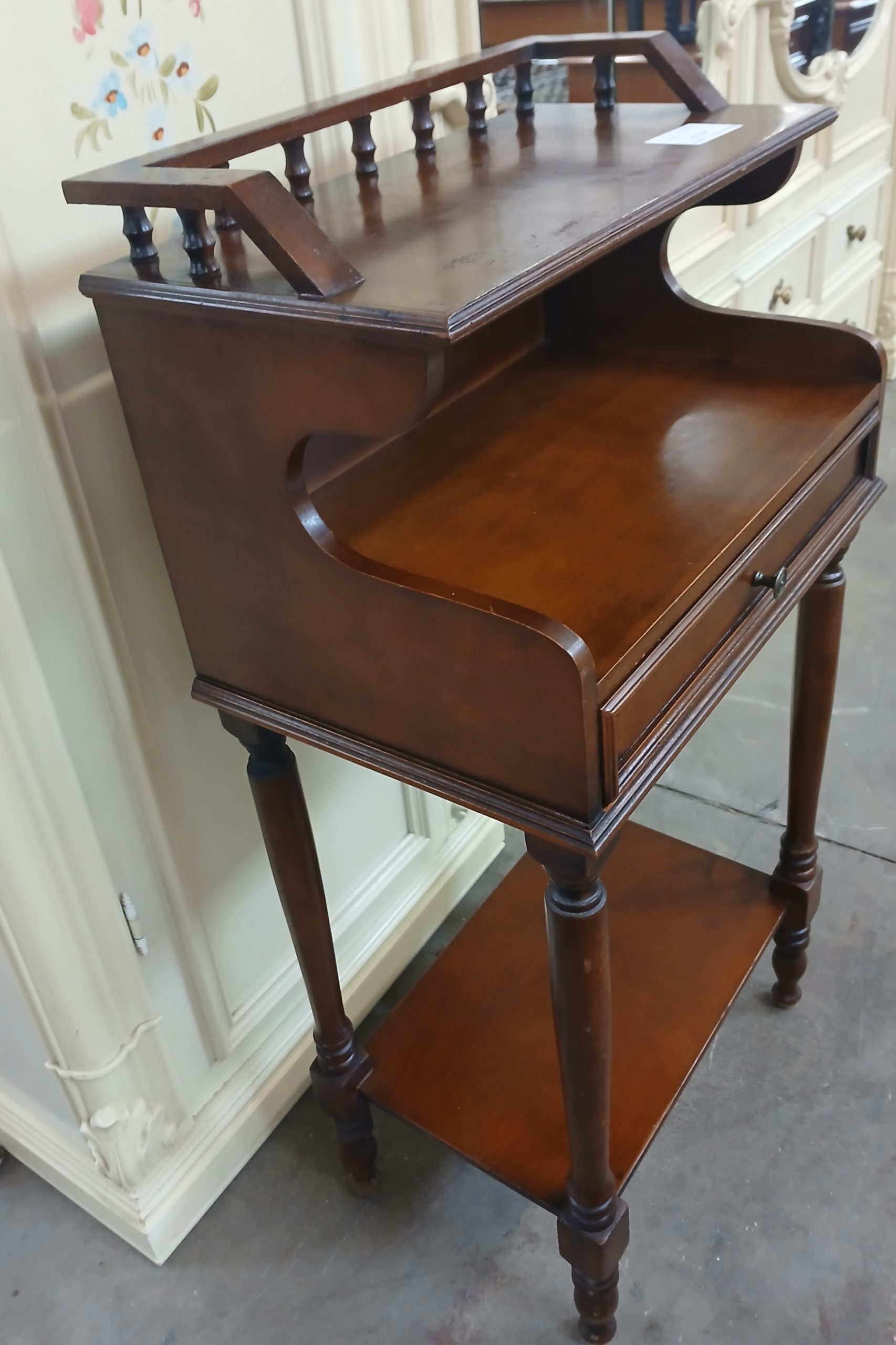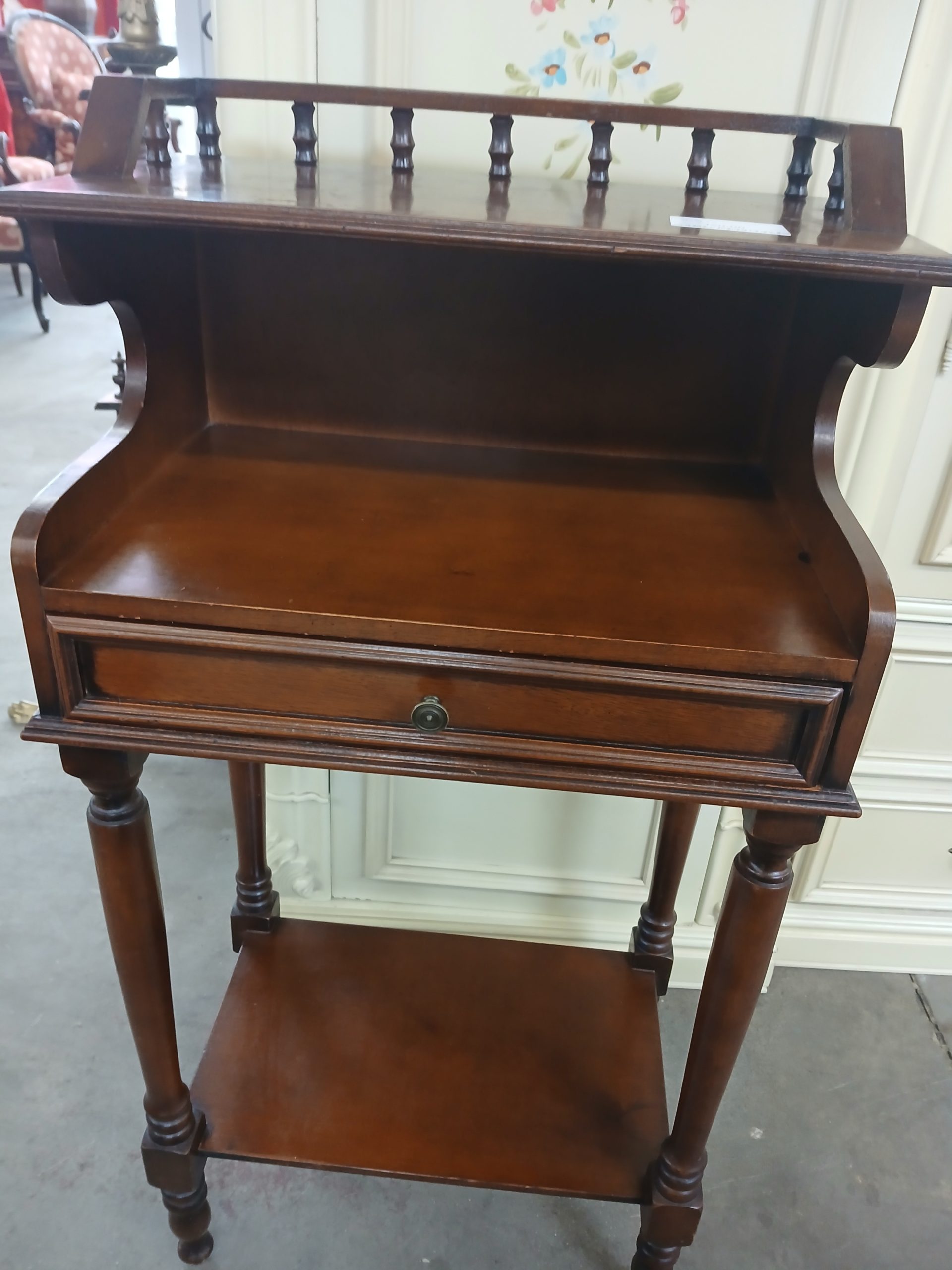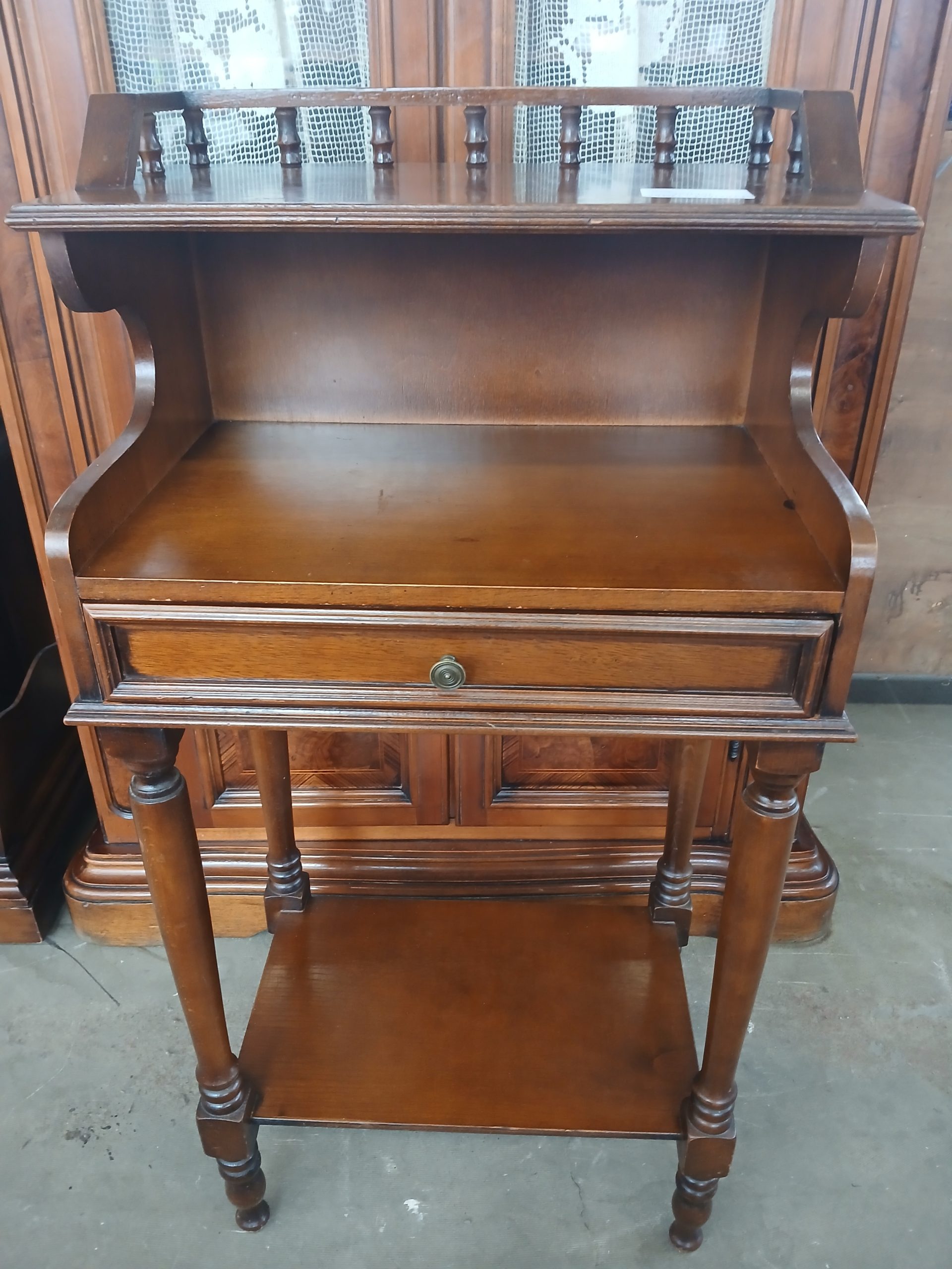 Este o masută sau o etajeră consolă vintage, realizată din lemn masiv in stil baroc ,si se caracterizează prin picioare strunjite si detalii ornamentale Dispune de un raft superior cu galerie de protecție formată din baluștri mici ,un raft deschis la mijloc,un sertar central cu maner metalic circular si o poliță inferioară pentru depozitare.Poate fi folosită ca masută de telefon consolă de hol, sau .suport pentru plante Dimensiuni: 46×30×91cm.