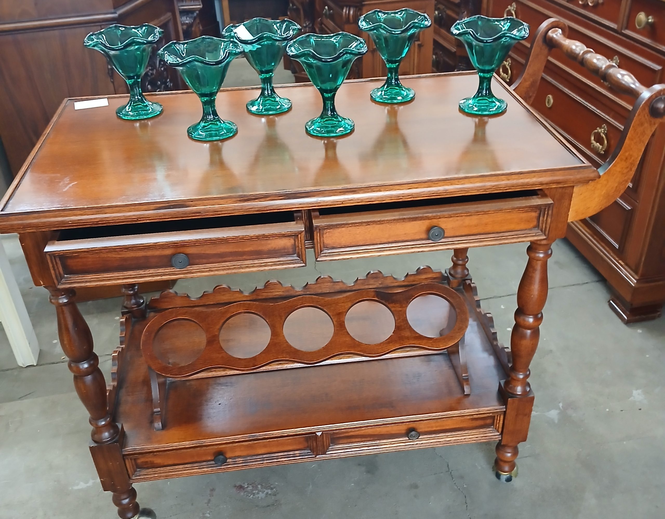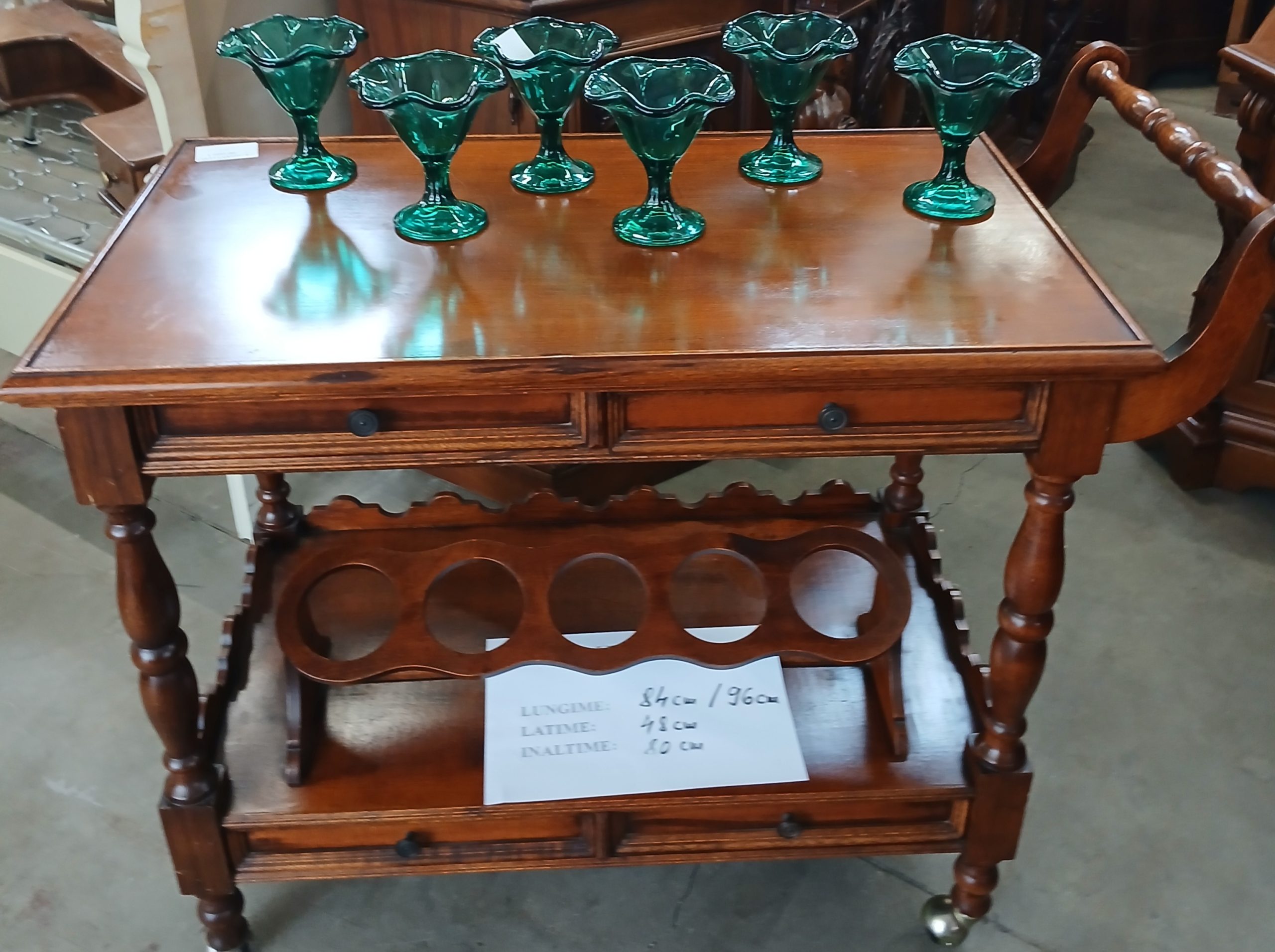 Un elegant căruț de servire sau gheridon, realizat in stil vintage, din lemn masiv. Este dotat cu patru sertare, două superioare si două inferioare si un suport central special conceput pentru sticle. Prezintă picioare strunjite elegant si un mâner sculptat pentru manevrare facilă.