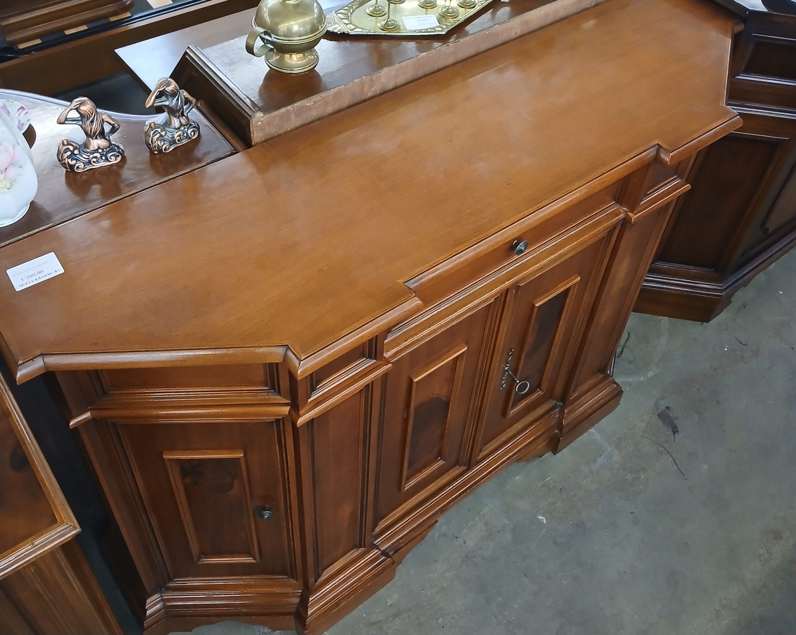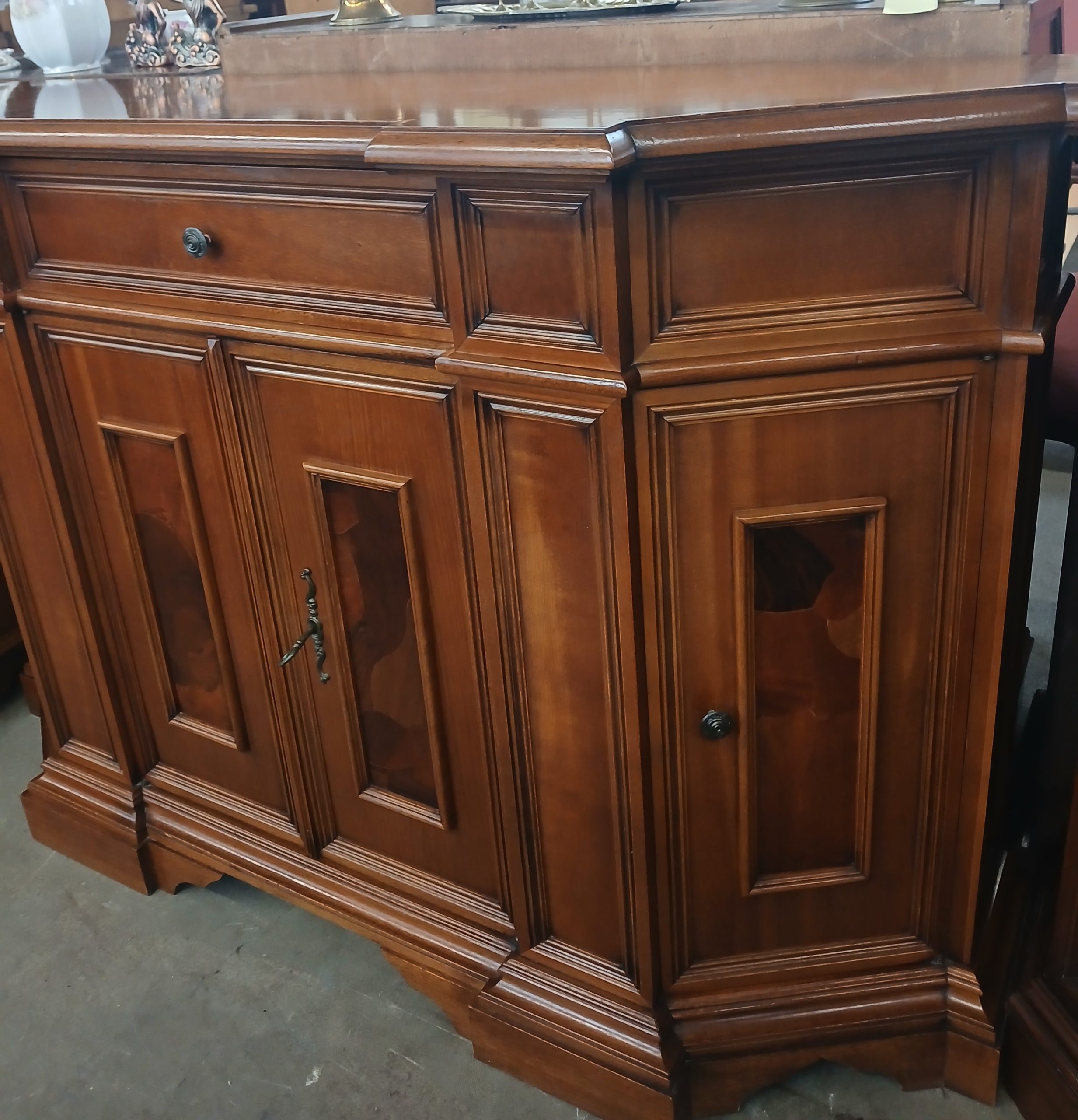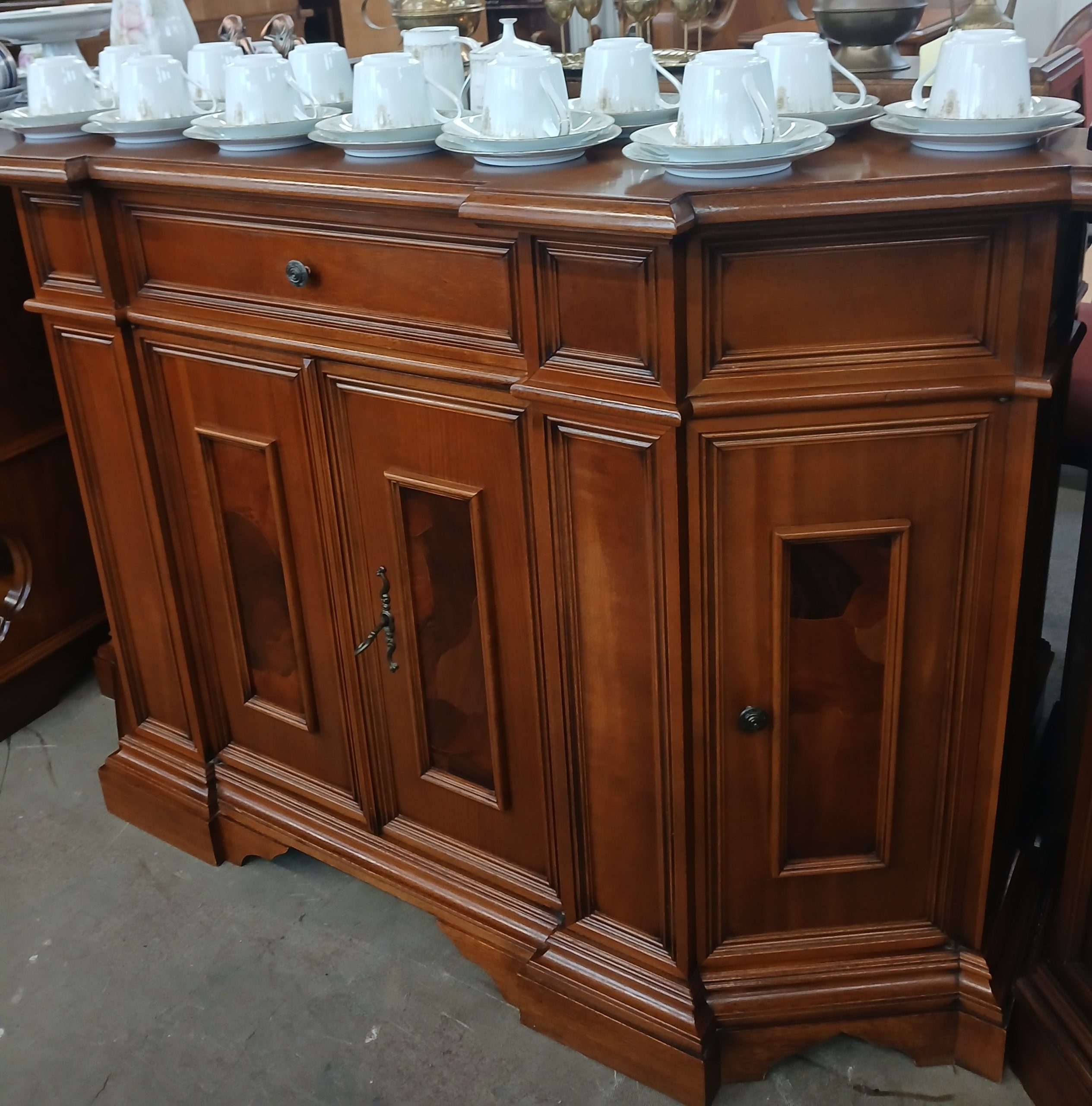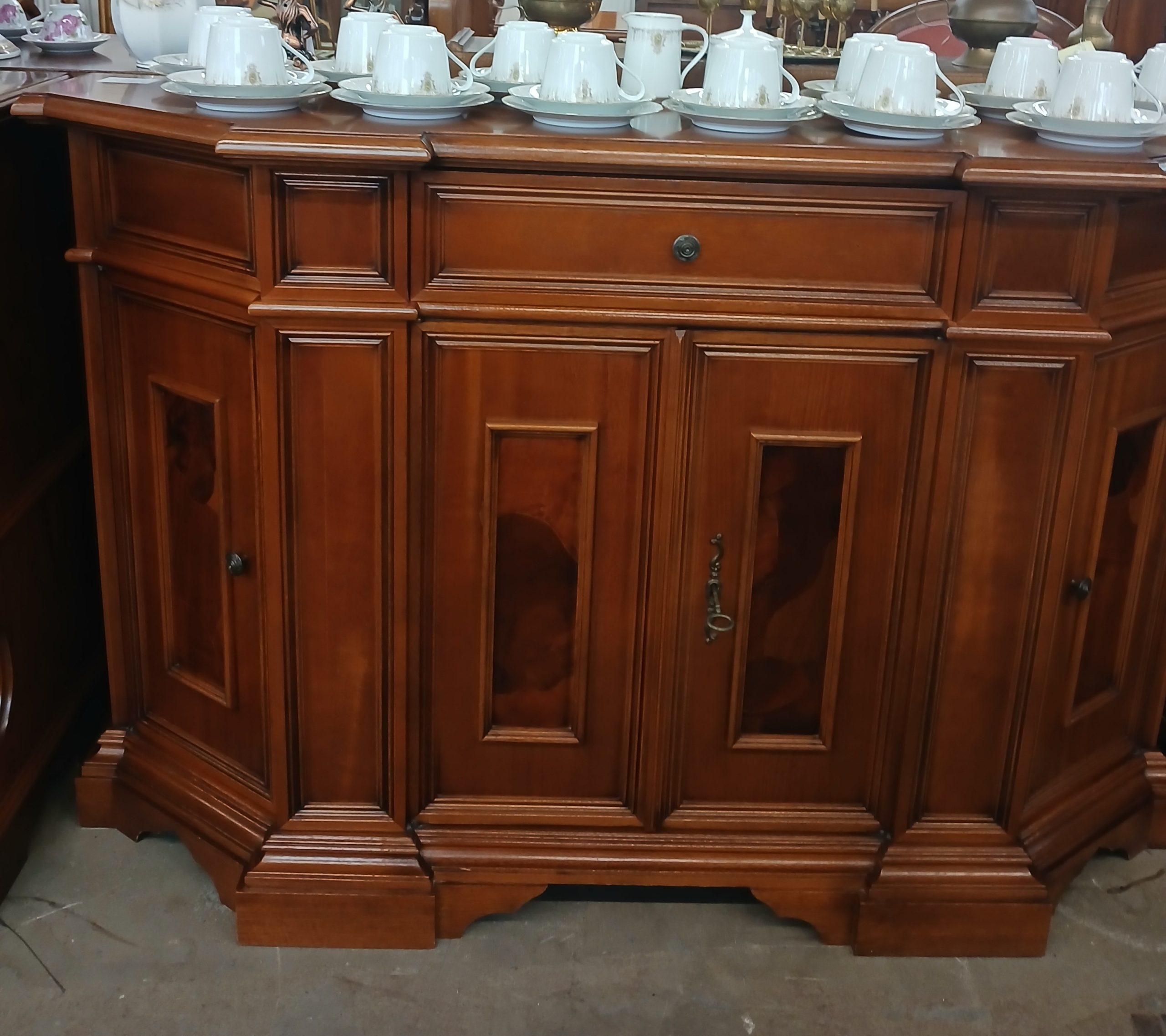 Comodă eleganta din lemn cu intarsii in stil baroc caracterizată prin linii curbe si detalii ornamentate.