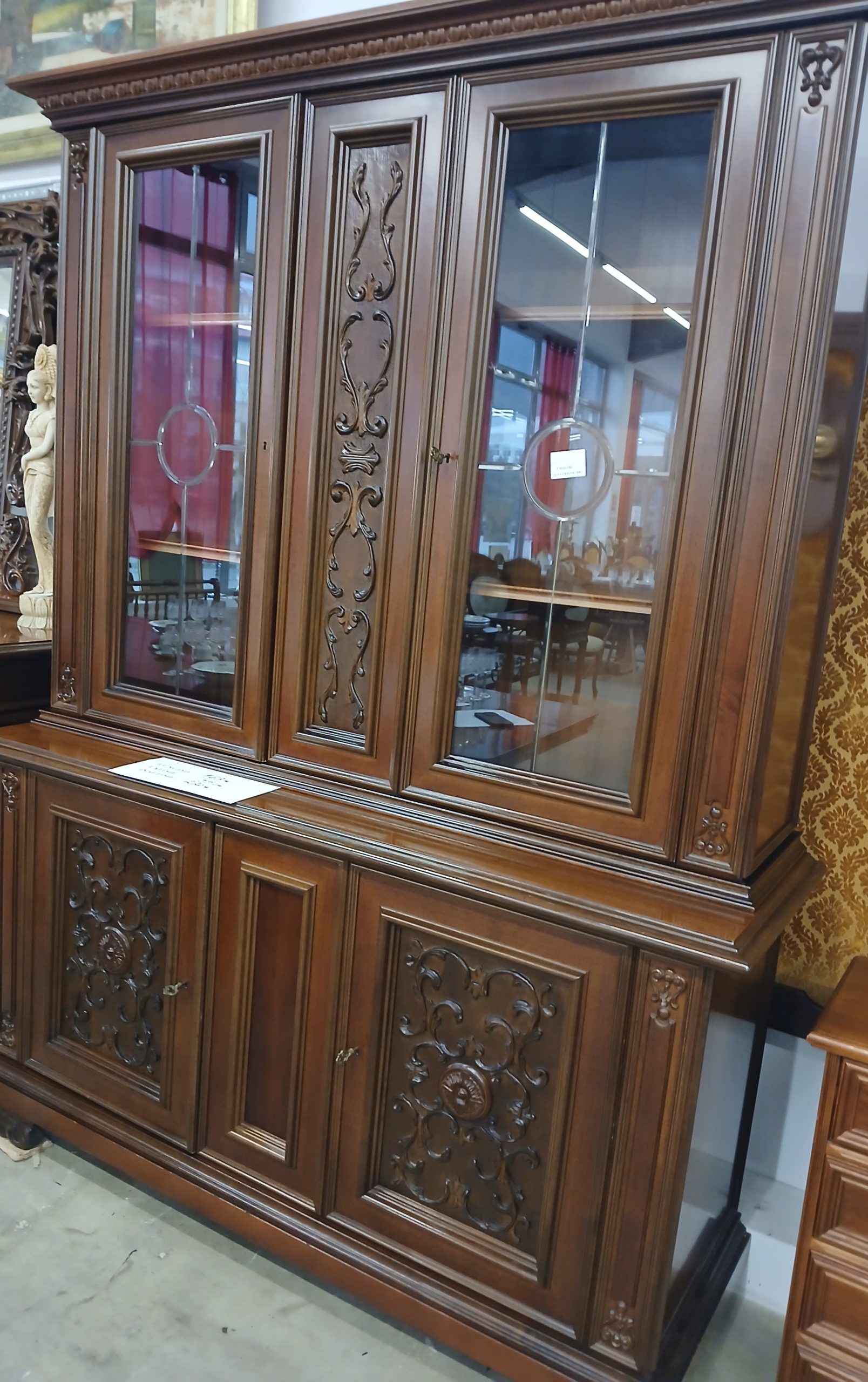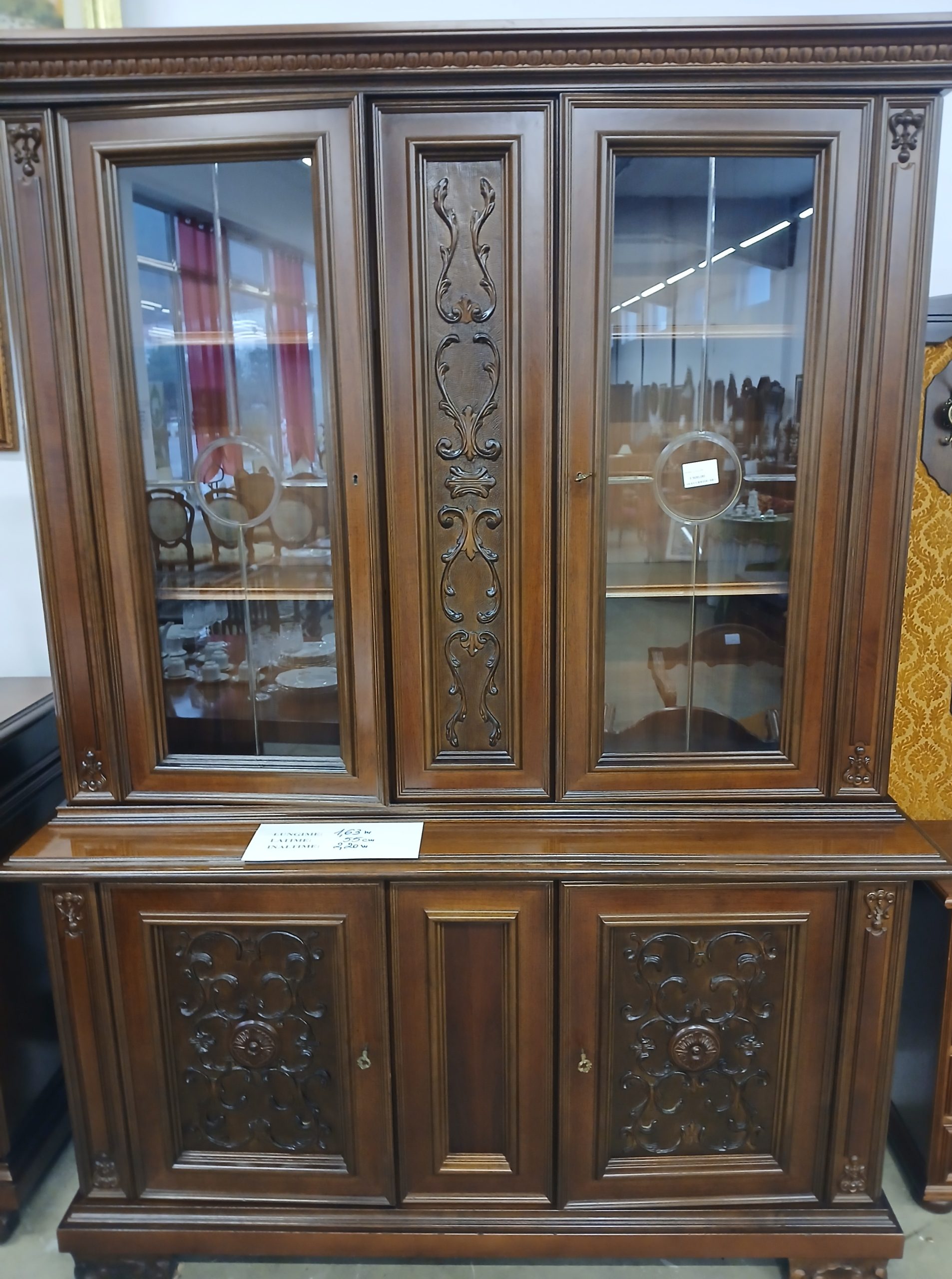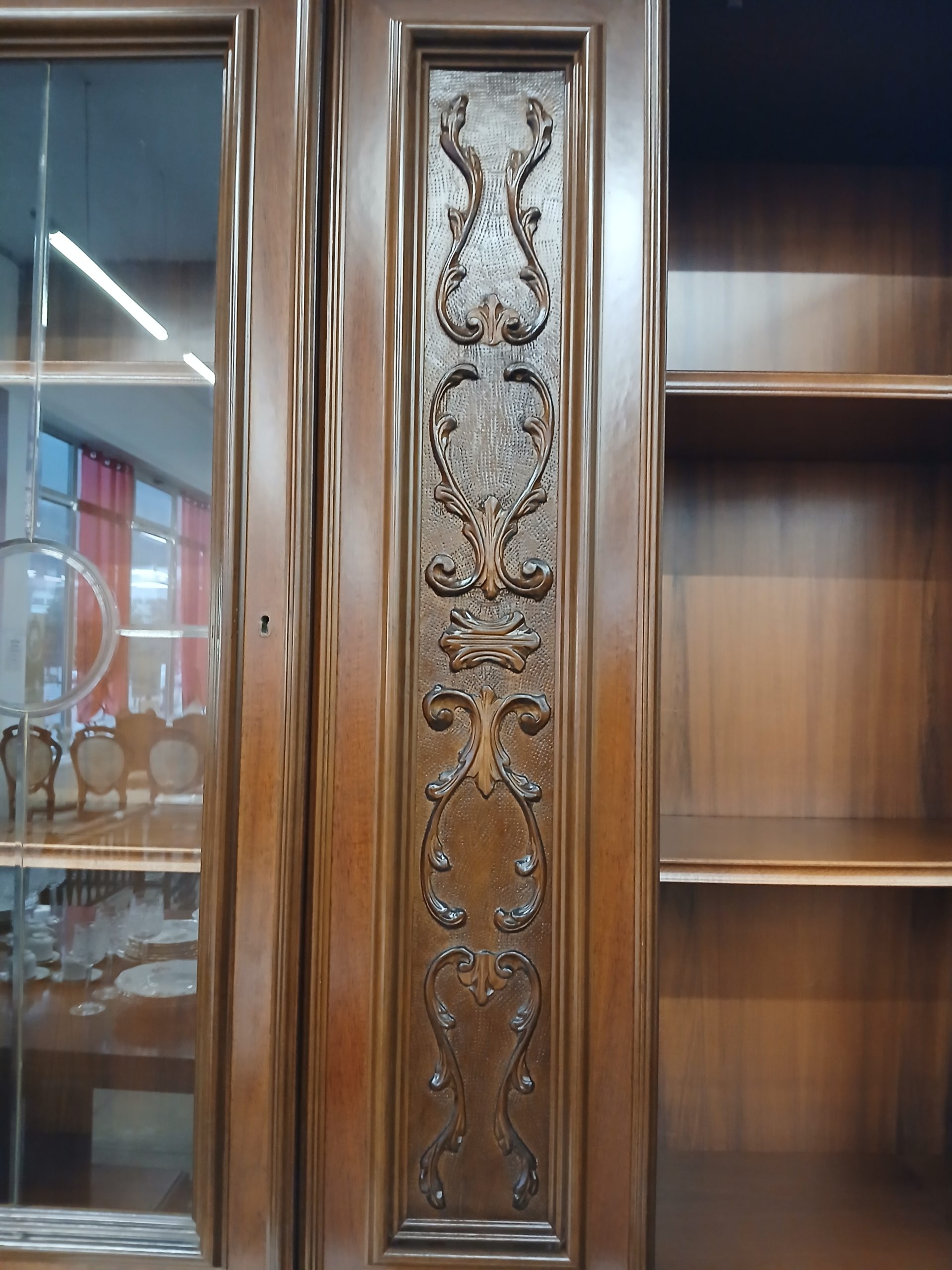 Este o vitrină din lemn masiv, in stil clasic,de calitate italiană,cu detalii sculptate manual si usi cu sticla..