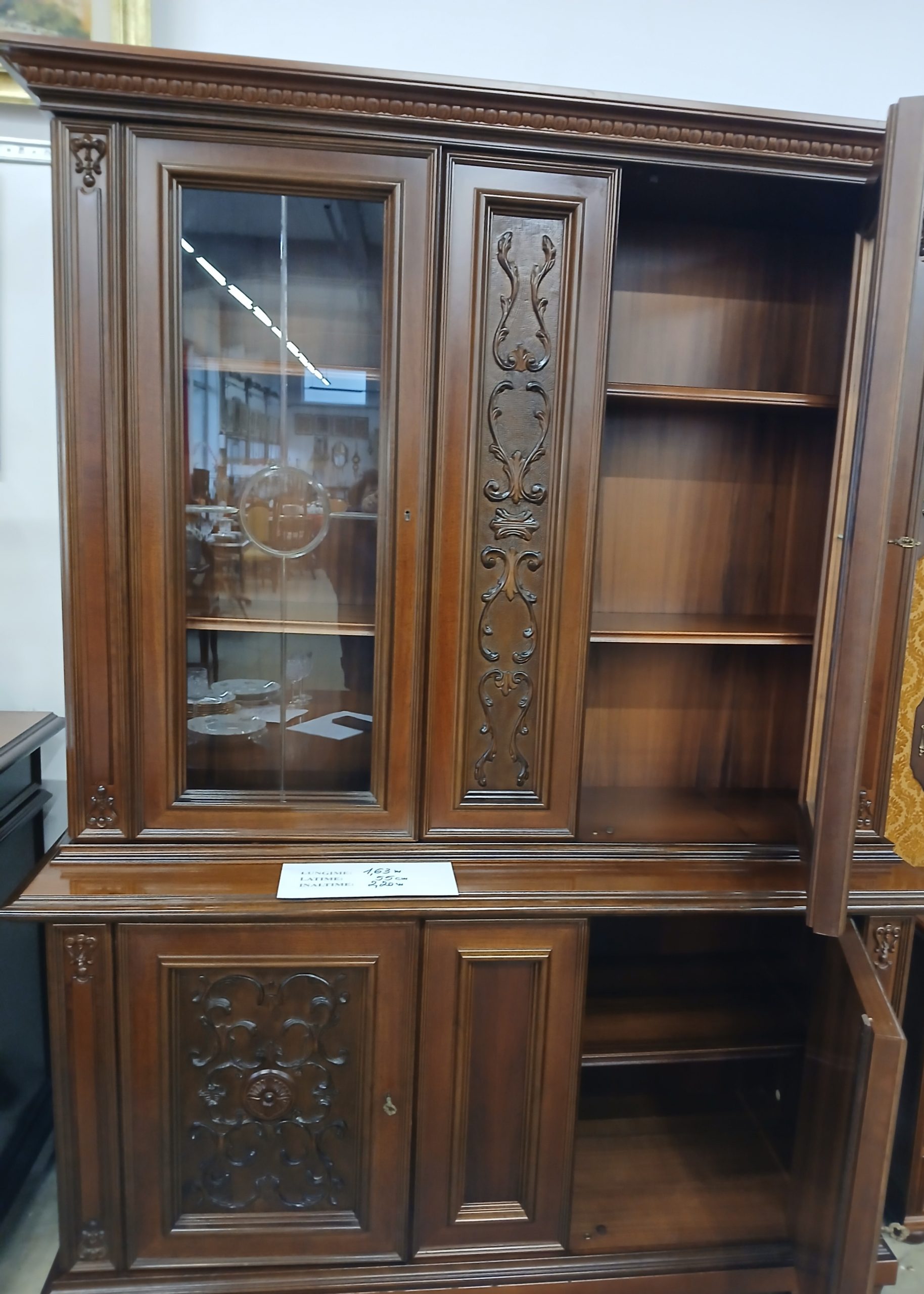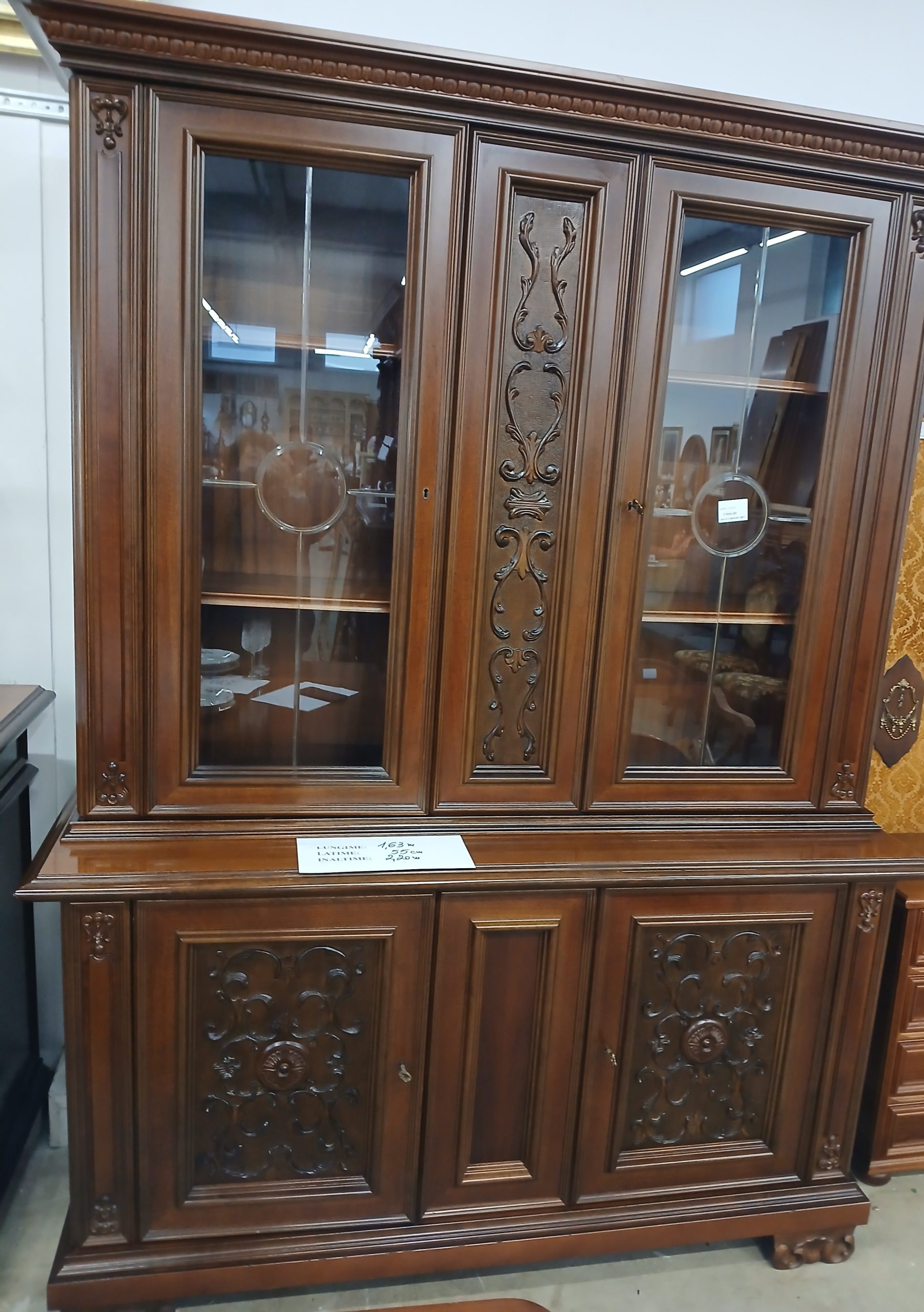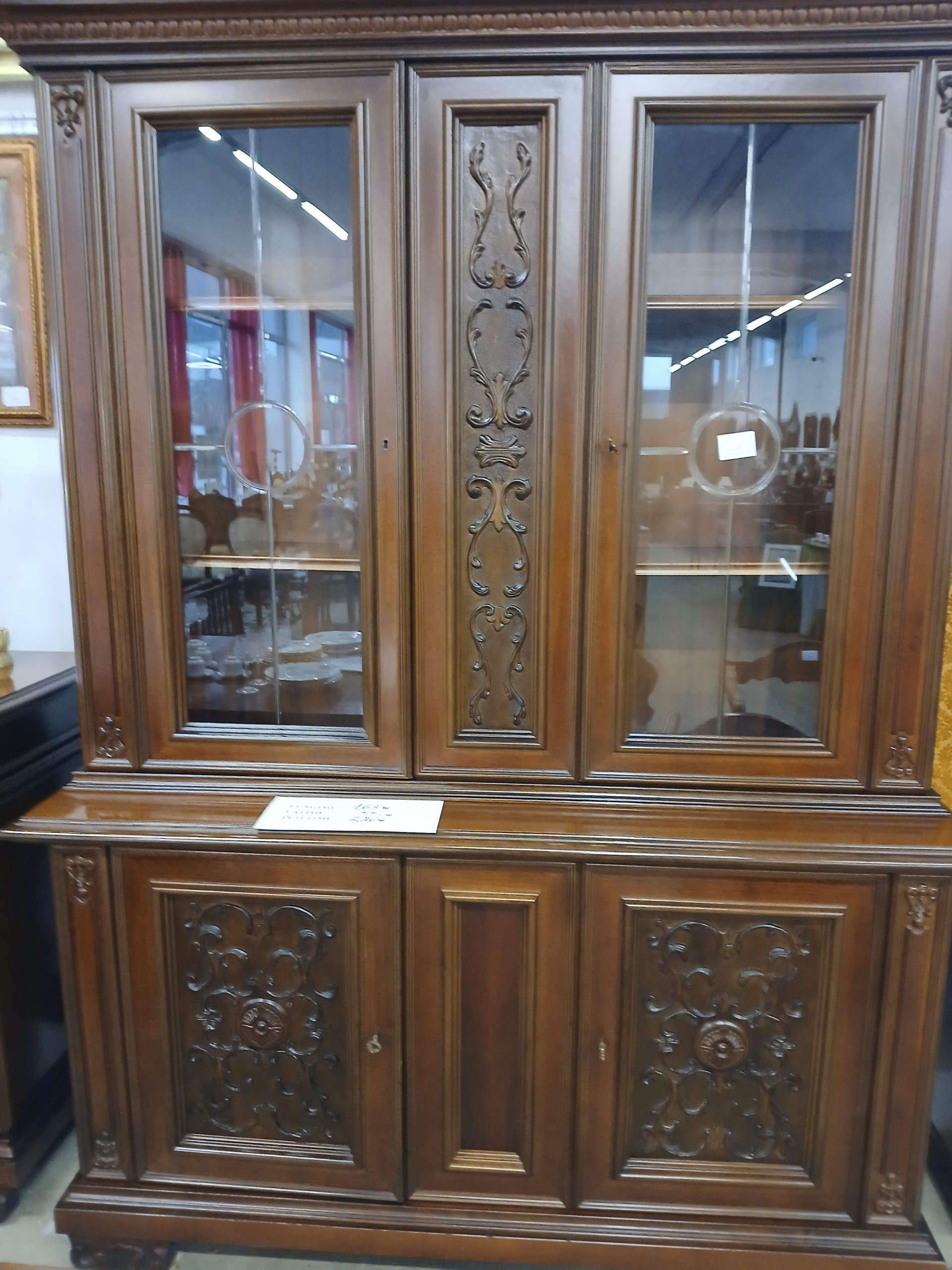 Este o vitrină din lemn masiv, in stil clasic,de calitate italiană,cu detalii sculptate manual si usi cu sticla..