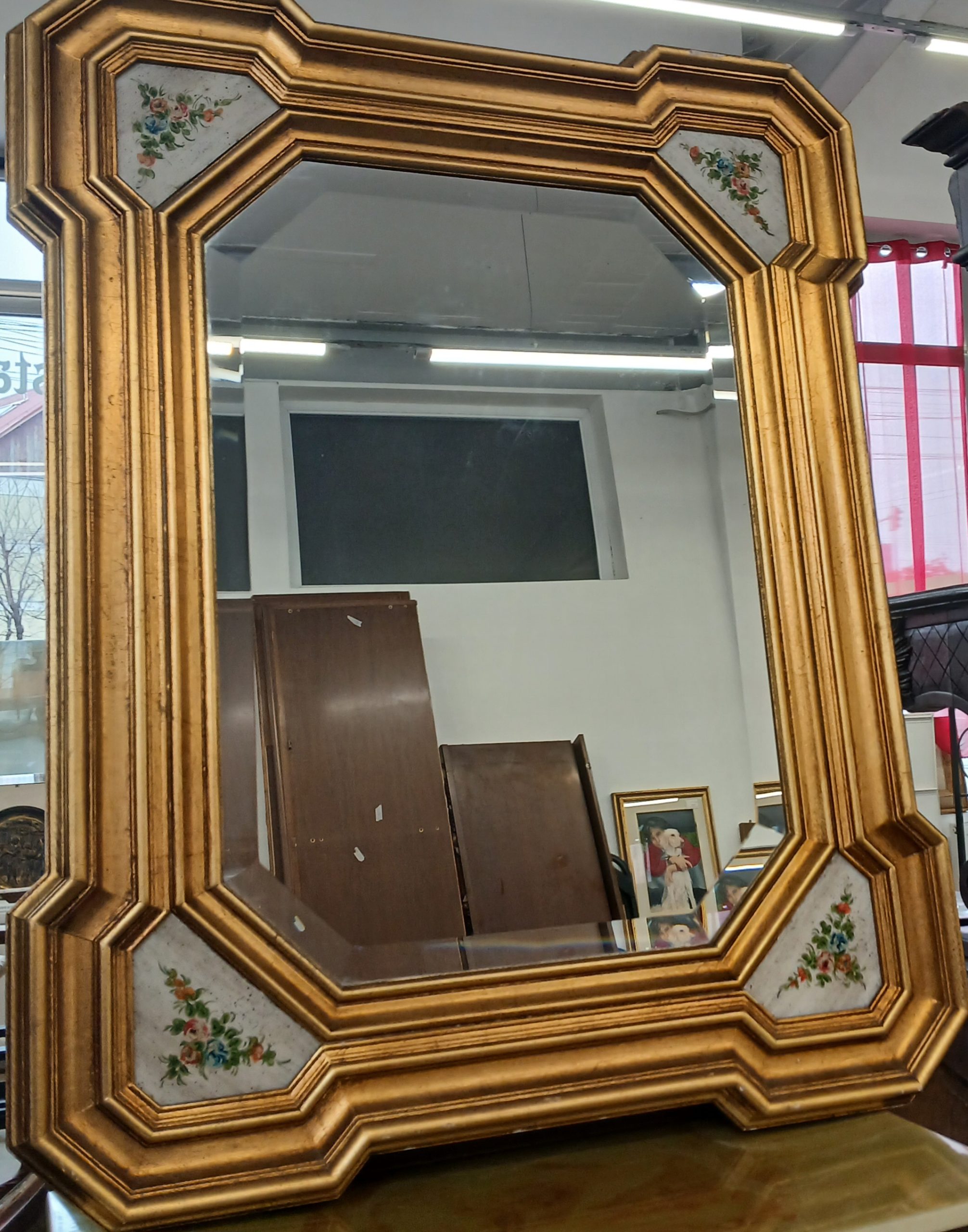 Aceasta este o oglindă din cristal, decorativă ,cu ramă din lemn aurie si detalii florale