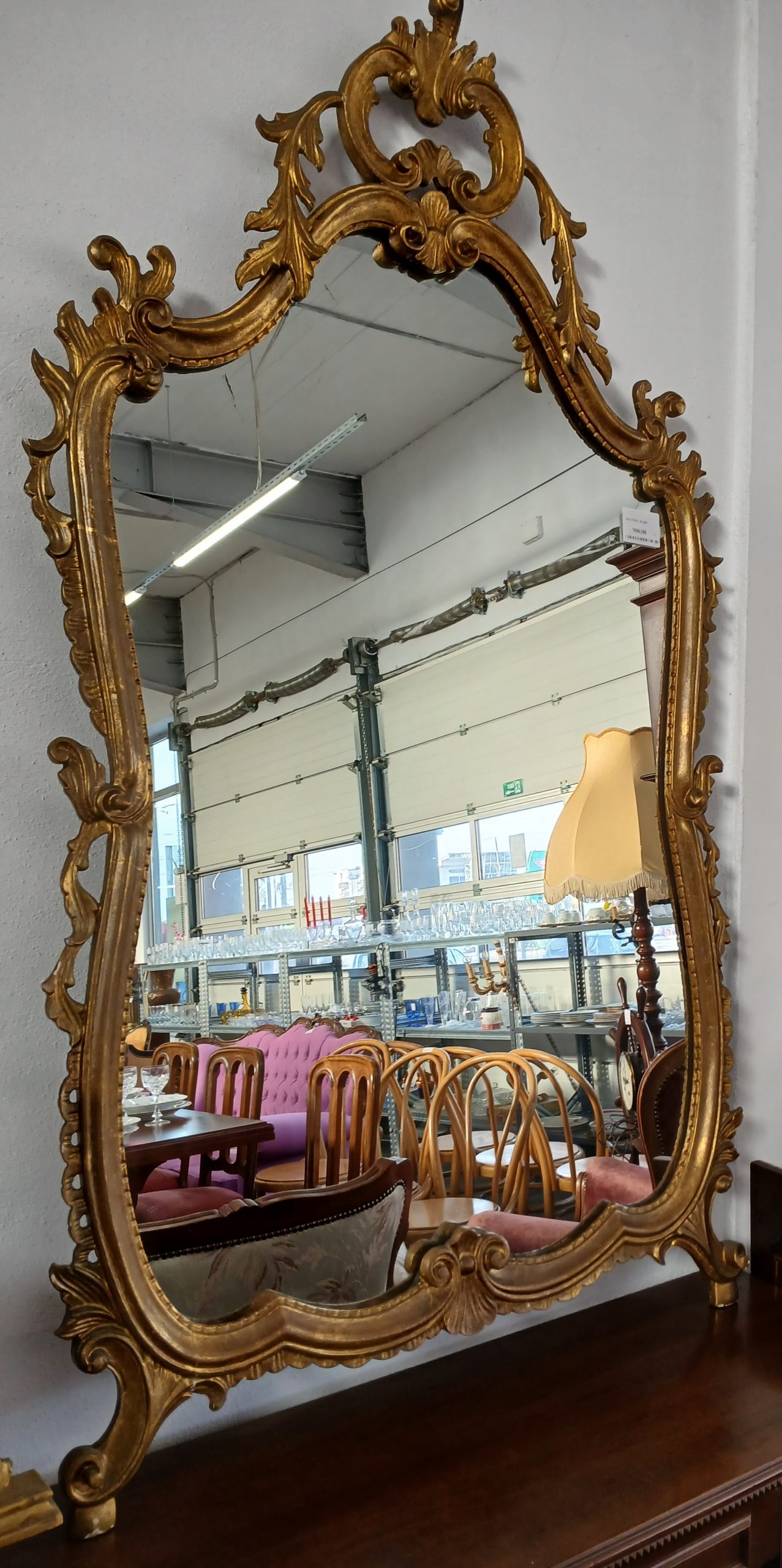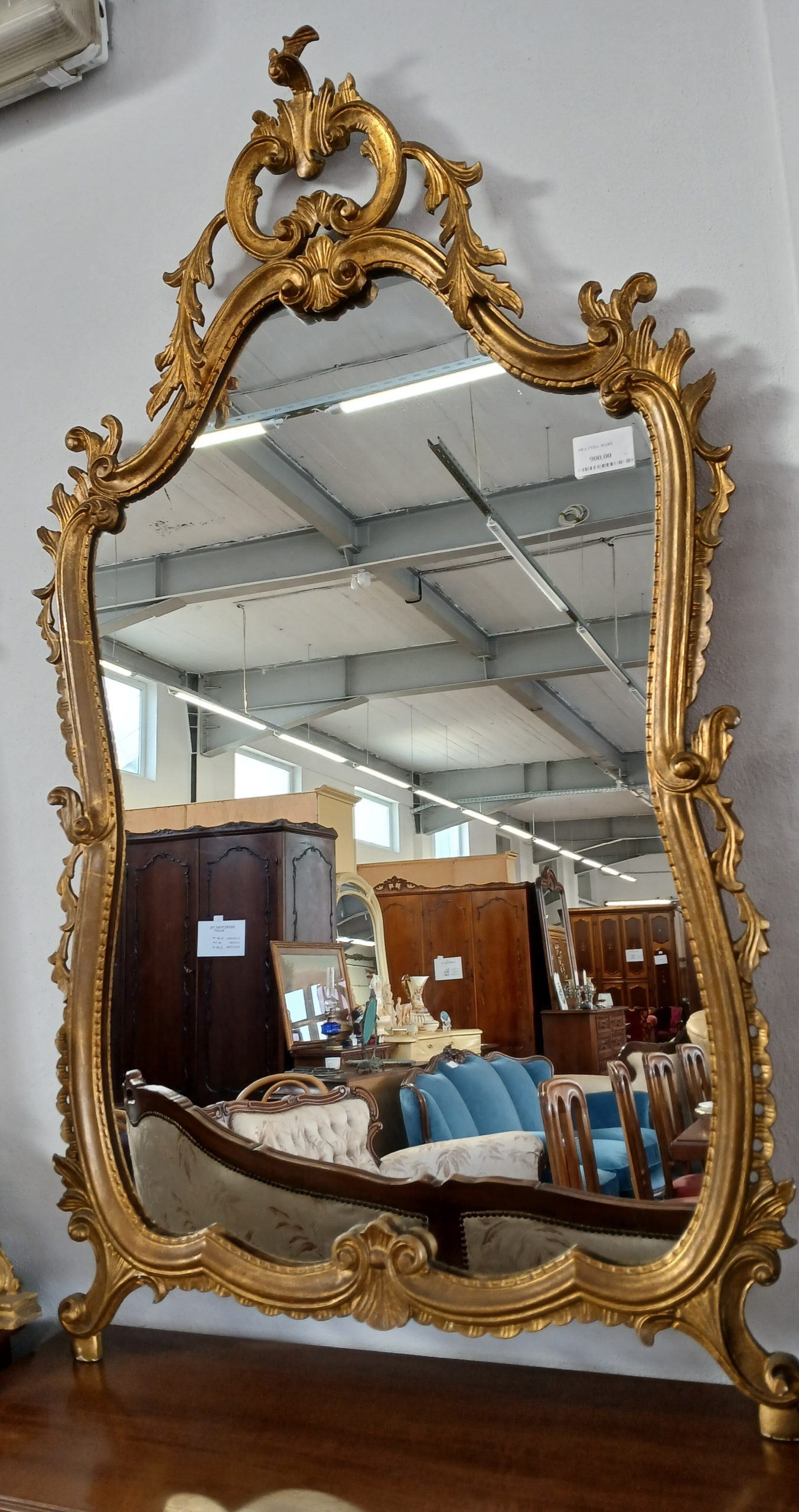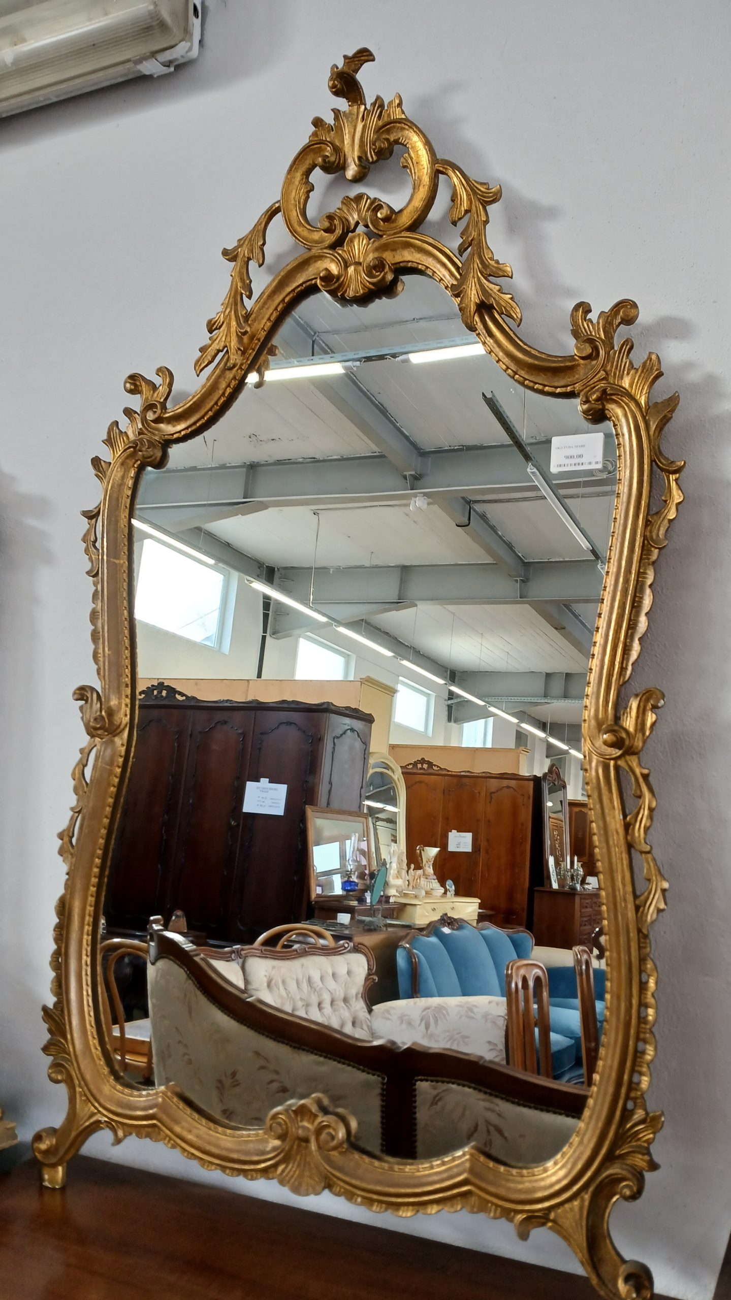 Este o oglindă de perete, stil baroc venetian, cu ramă din lemn, bogat sculptată de culoare aurie
