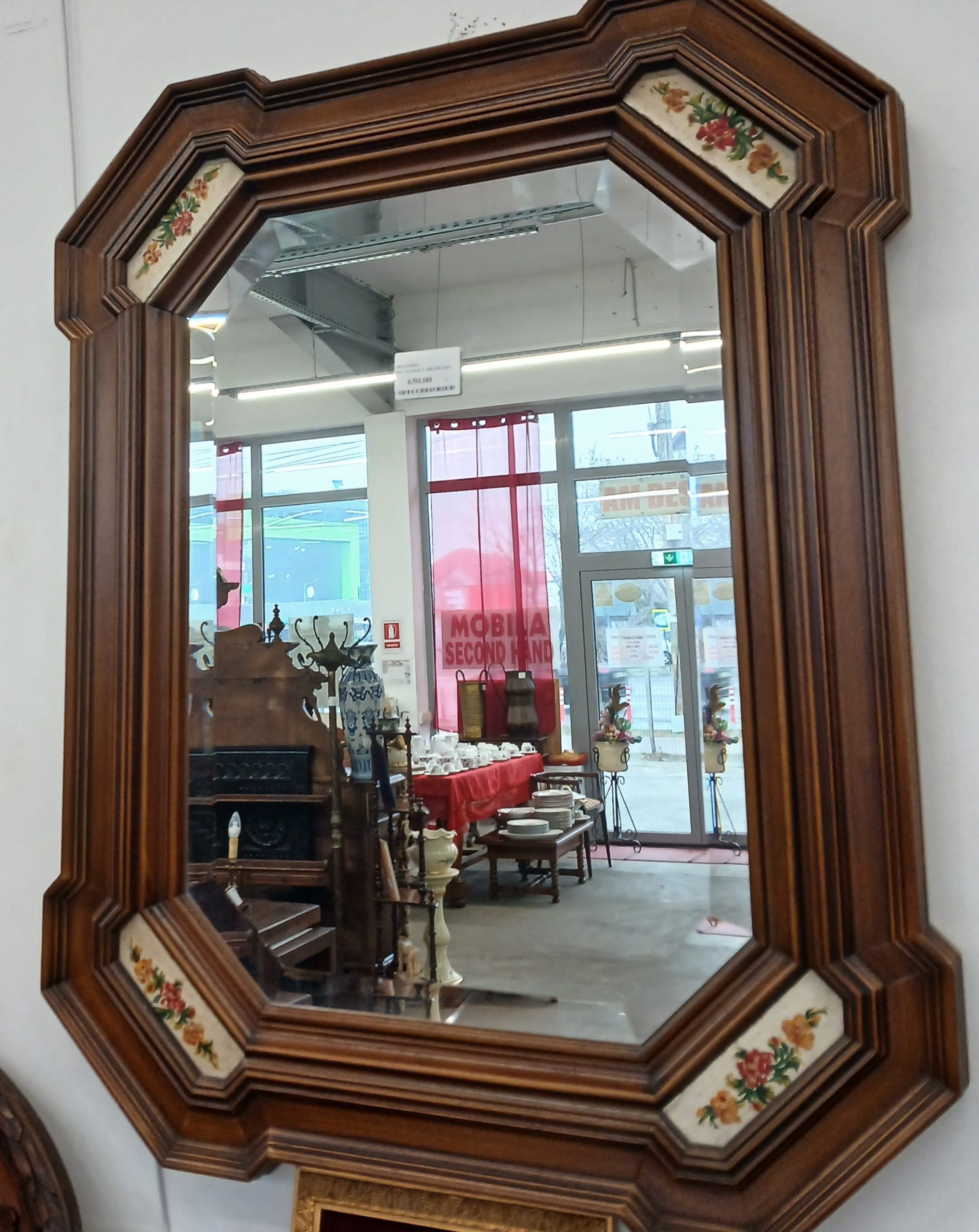 O frumoasă oglindă de perete din cristal, cu margini fazetate, cu rama octogonală din lemn, cu un model floral pictat manual.Este un articol vintage, de colecție.
