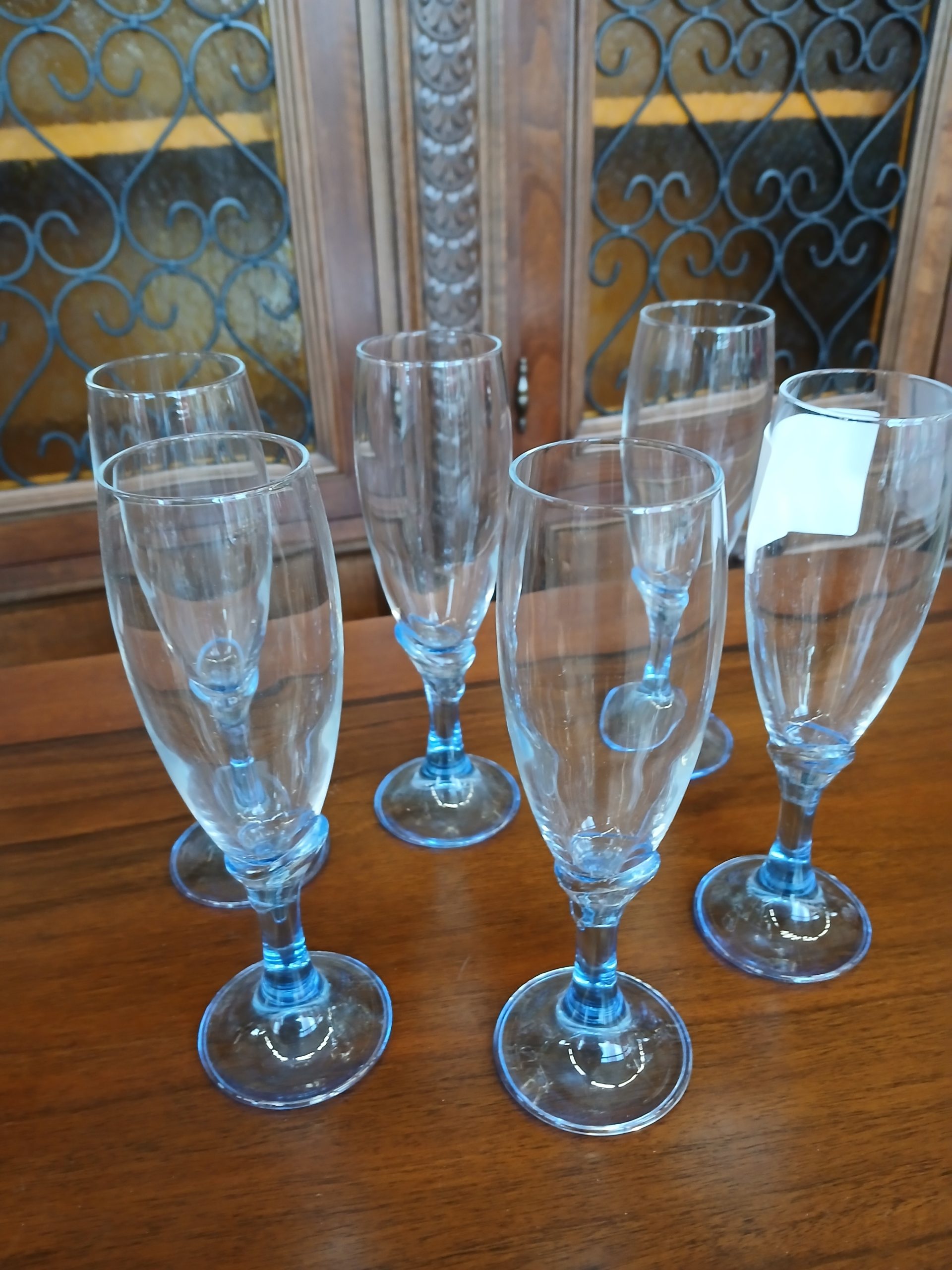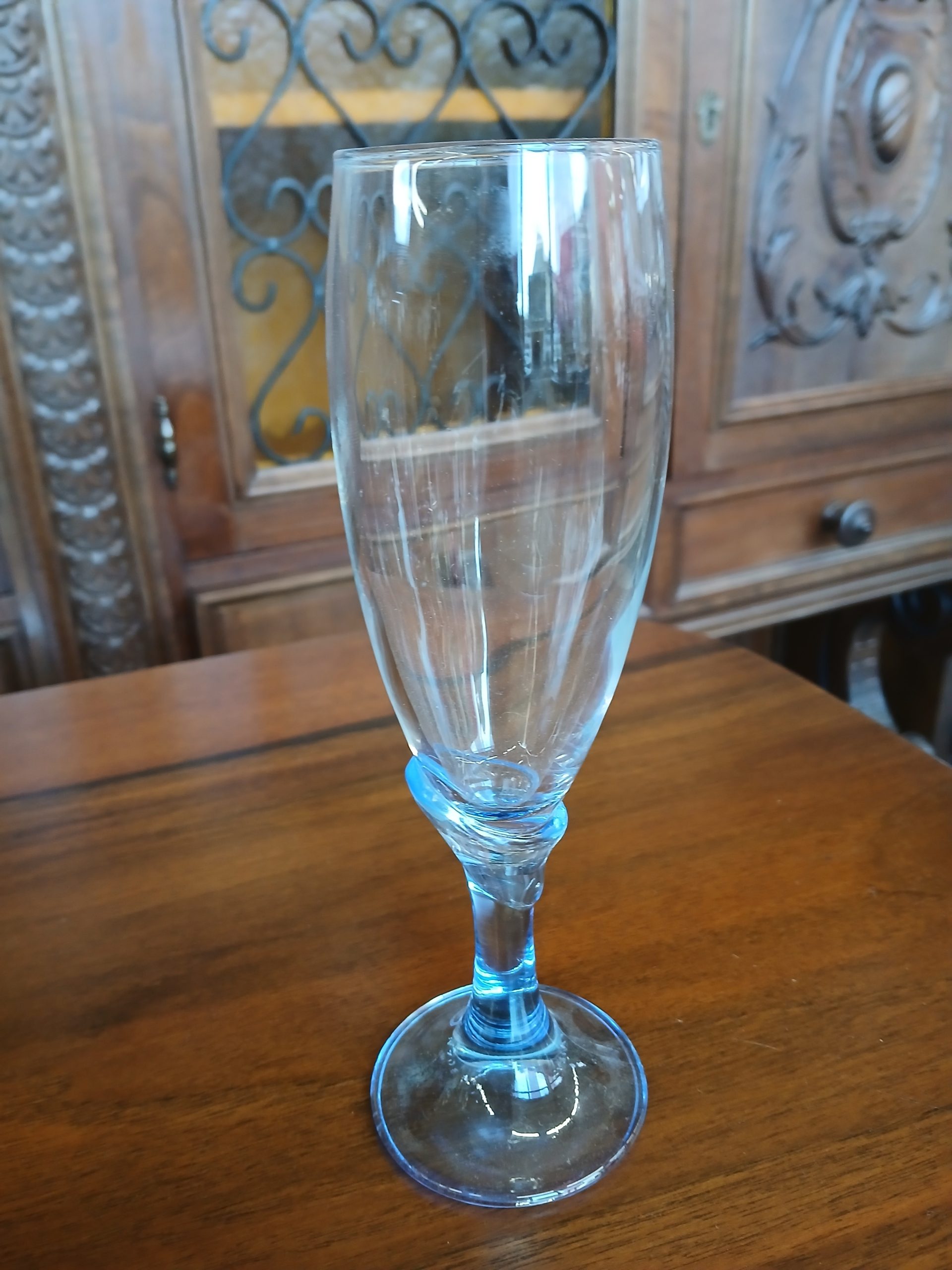 Un elegant set de 6 pahare sticlă cu picior albastru pentru sampanie cu diametrul de 5cm și înălțimea de 19cm.