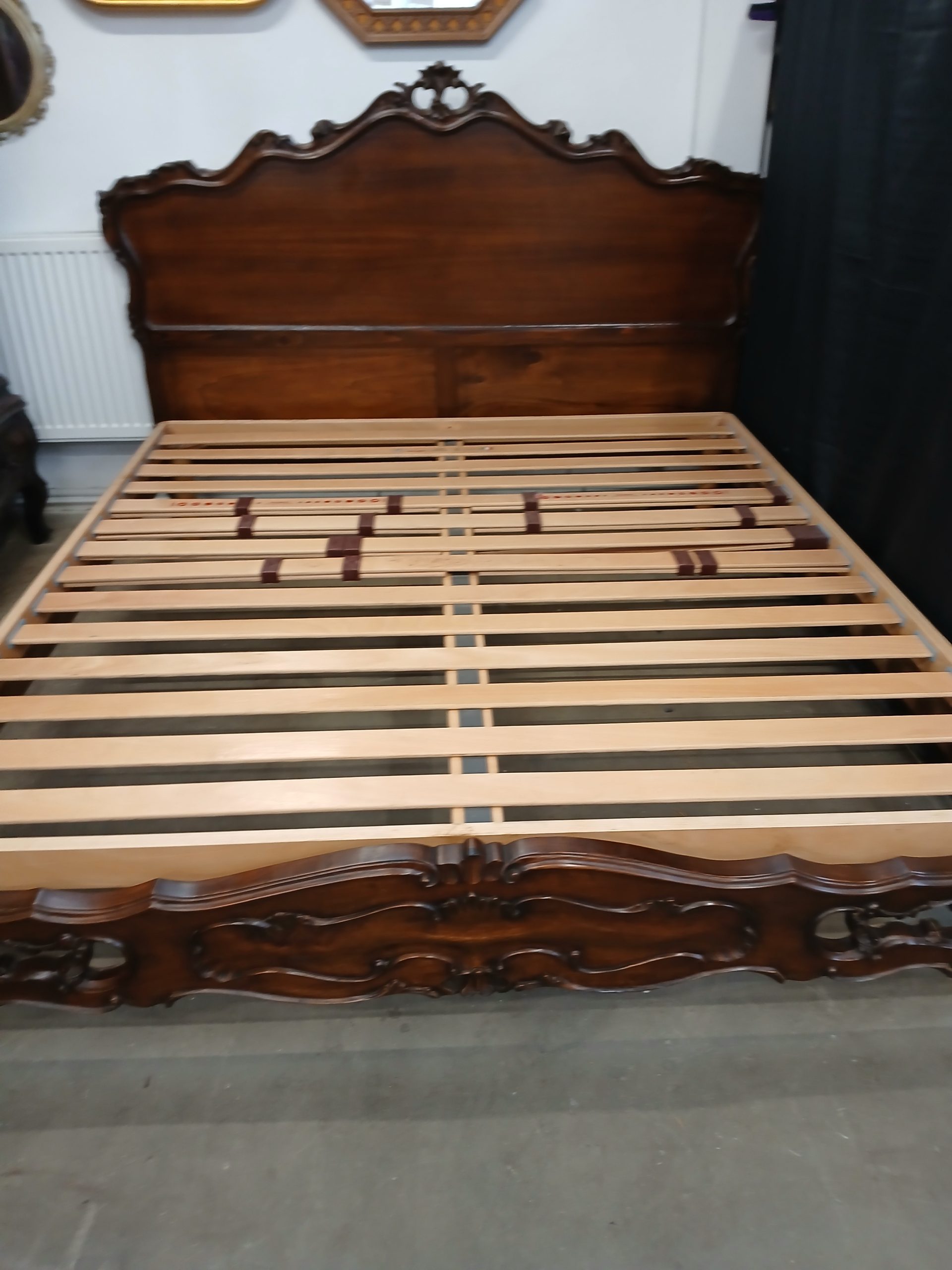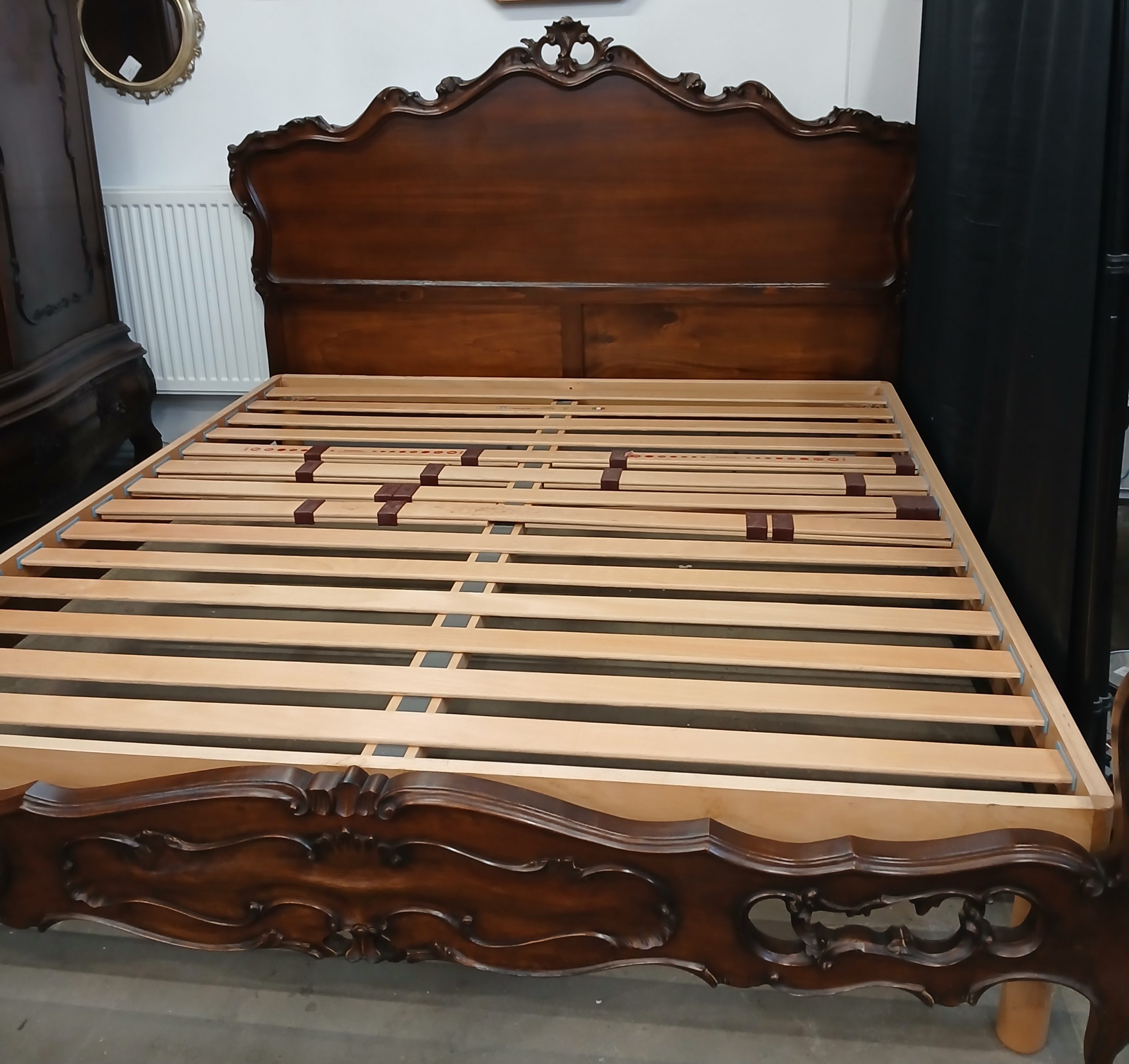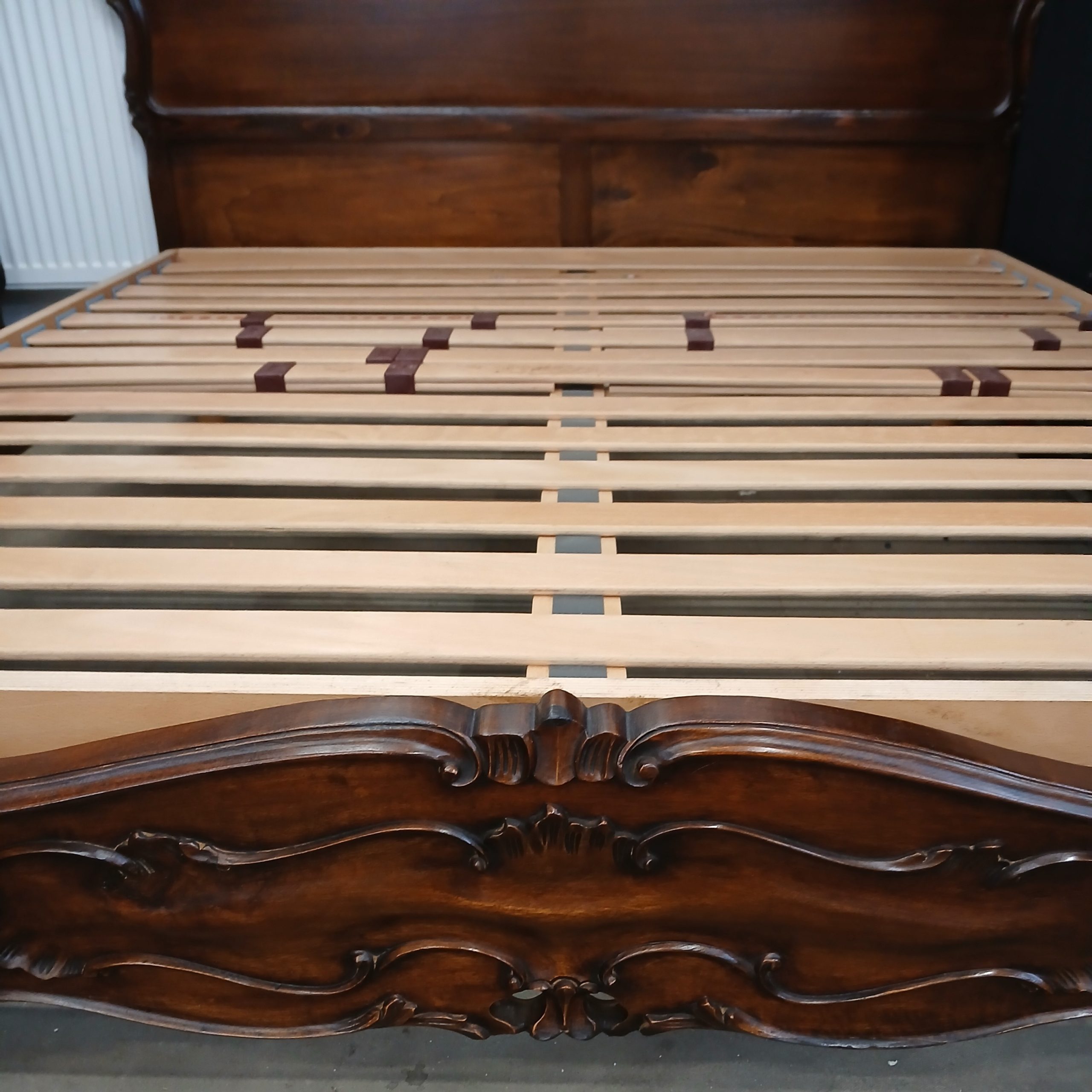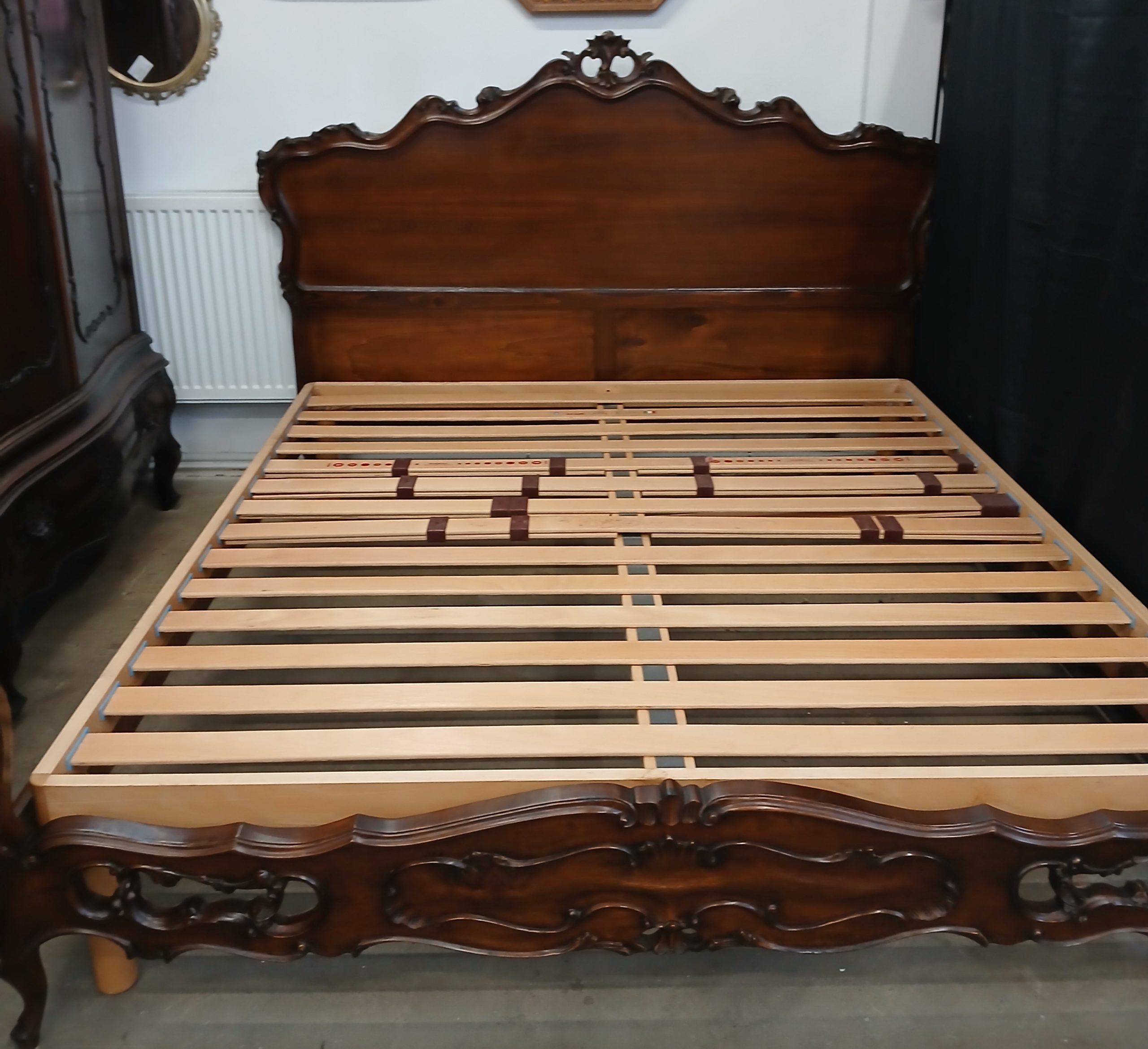 Este un pat matrimonial din lemn masiv de nuc, stil baroc piemontez, cu un design clasic si elegant. Stilul acestuia este caracterizat de sculpturi ornamentale bogate pe tablia superioară si cea inferioară ,sugerând o estetică de tip Baroc. Include o somiera din lamele de lemn. Dimensiuni somieră 170×190cm. Dimensiune rama externa pat 188cm×210cm.