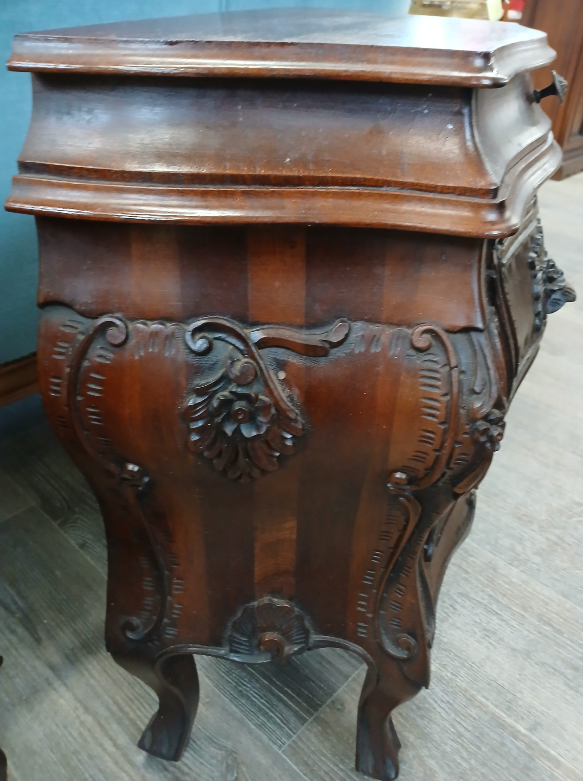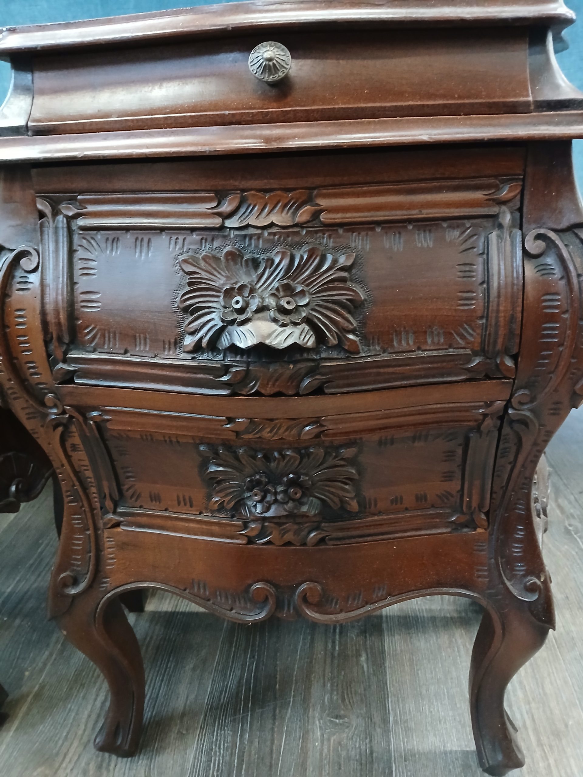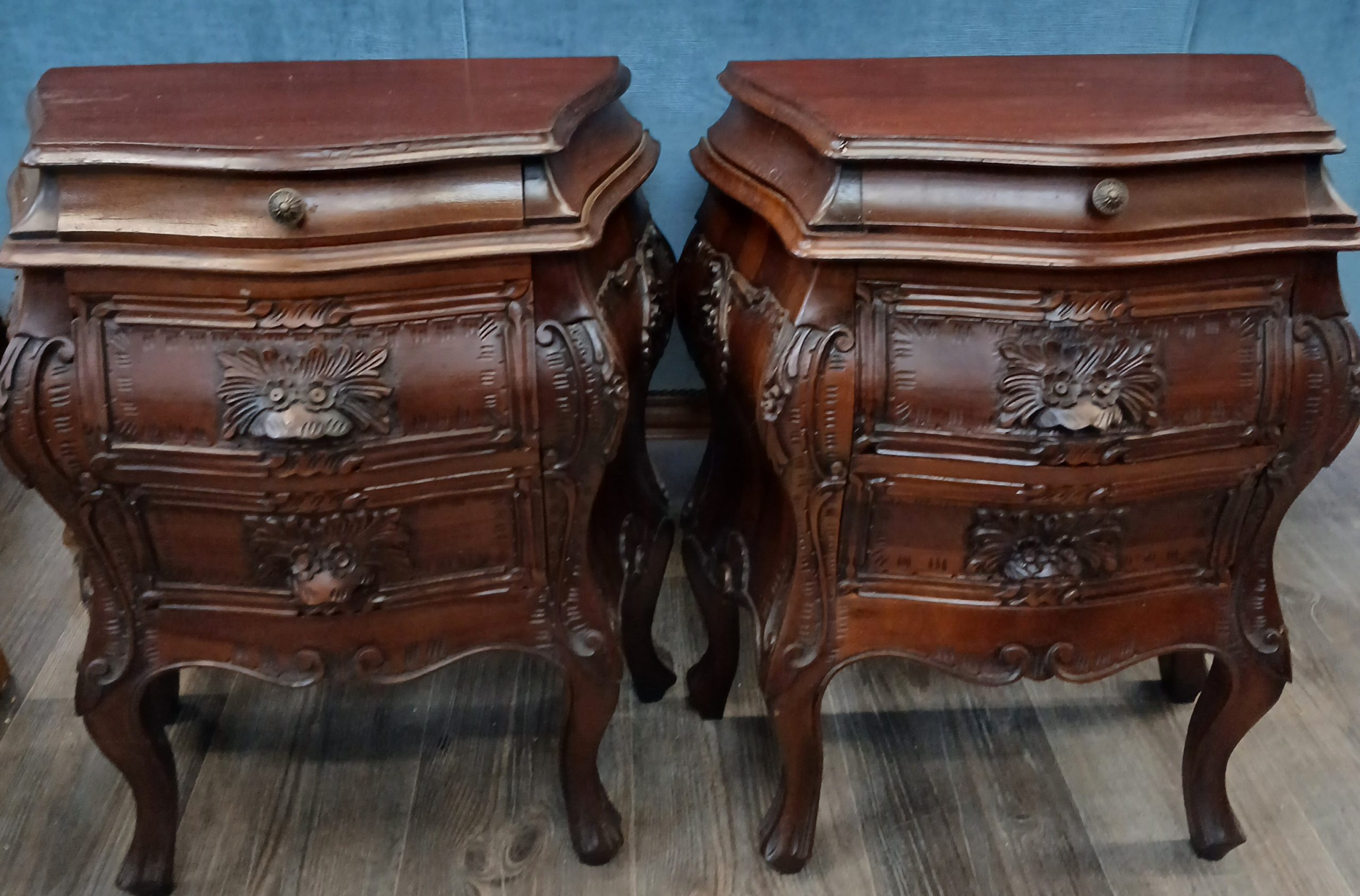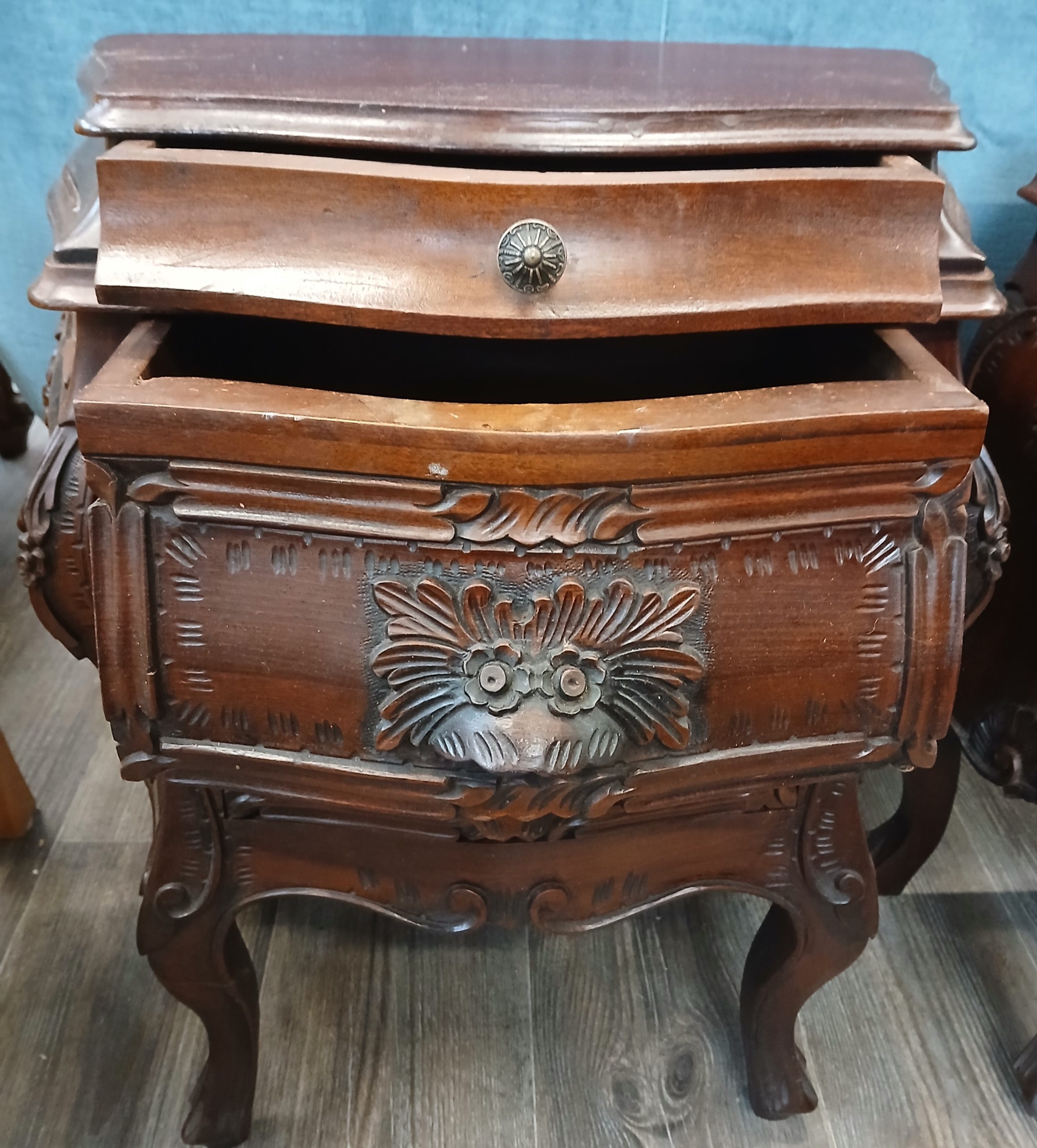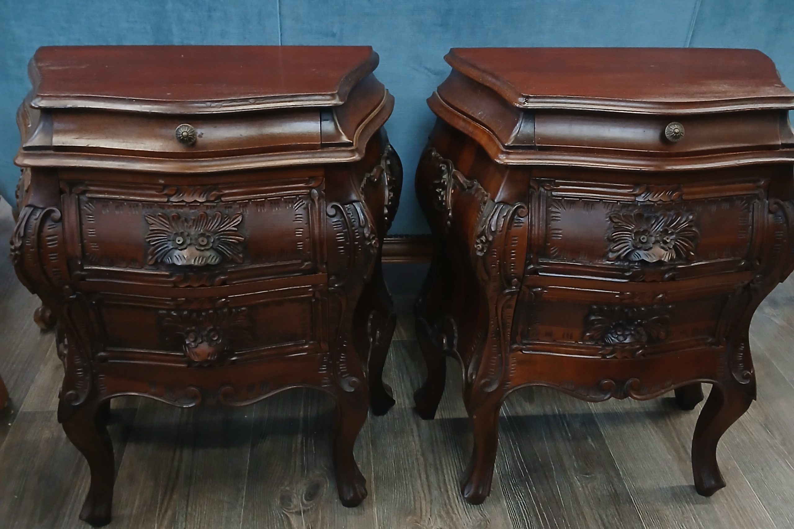Acestea sunt noptiere in stil baroc, caracterizate prin linii curbe sinuoase si sculpturi ornamentale bogate. Sunt din lemn masiv având un finisaj de culoare inchisă. Picioarele sunt de tip “cabriole, “iar fațada sertarelor prezintă sculpturi vegetale si florale proeminente. Fiecare noptieră dispune de două sertare cu manere discrete integrate in designul sculptat si un sertar mai mic cu buton metalic. Are lungimea de 53cm, latimea de 30cm, si inaltimea de 64cm.
