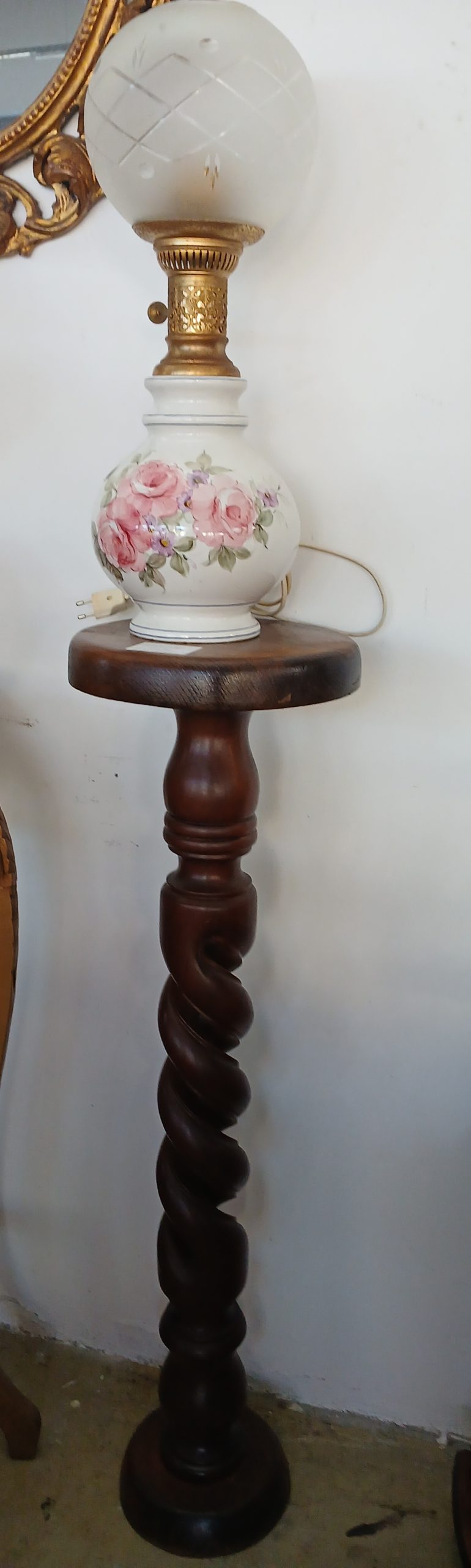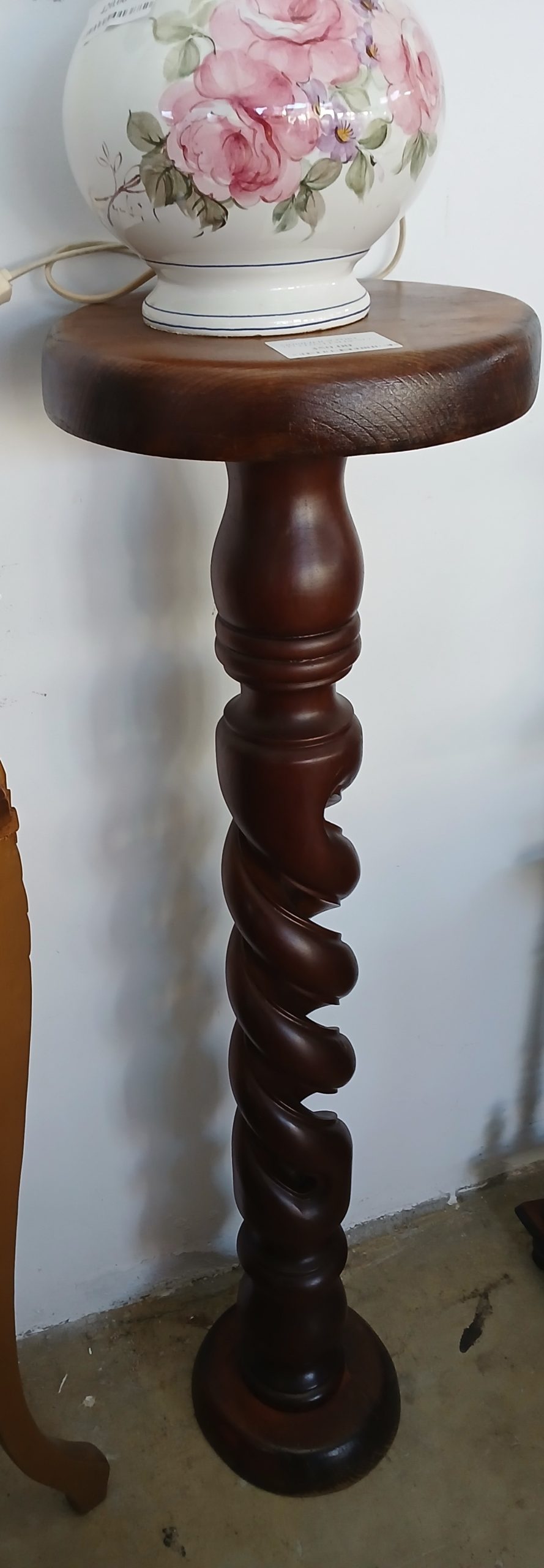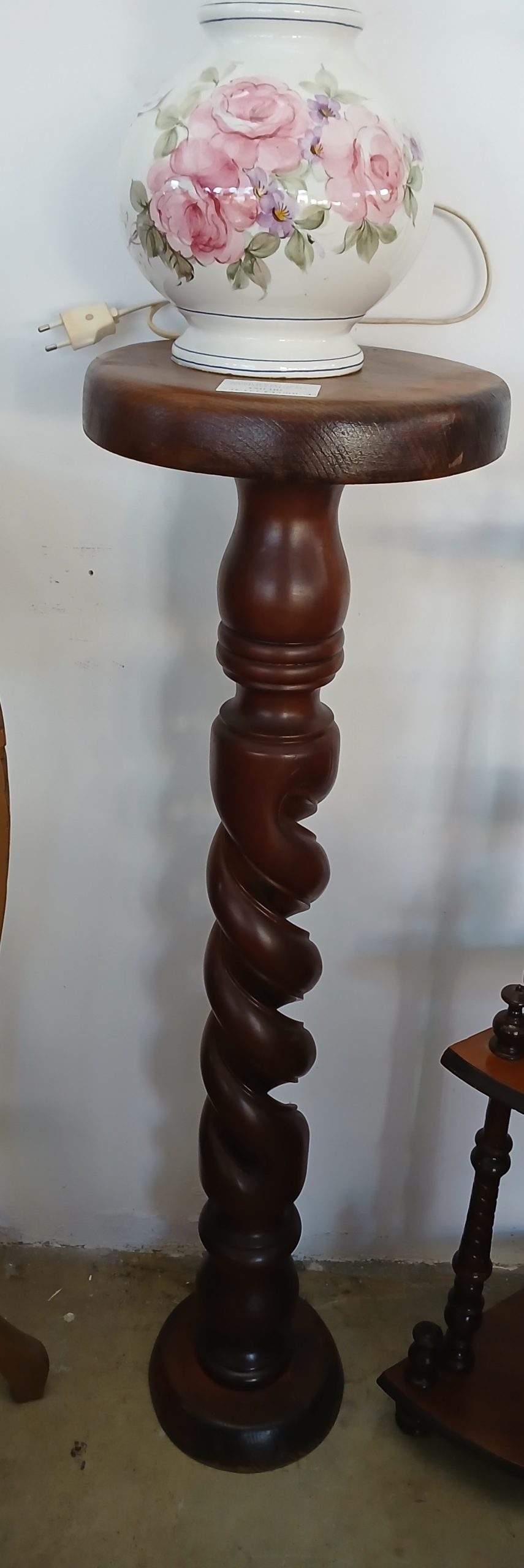 Este un piedestal vintage din lemn cu un picior sculptat in stil răsucit (tip torsadă).