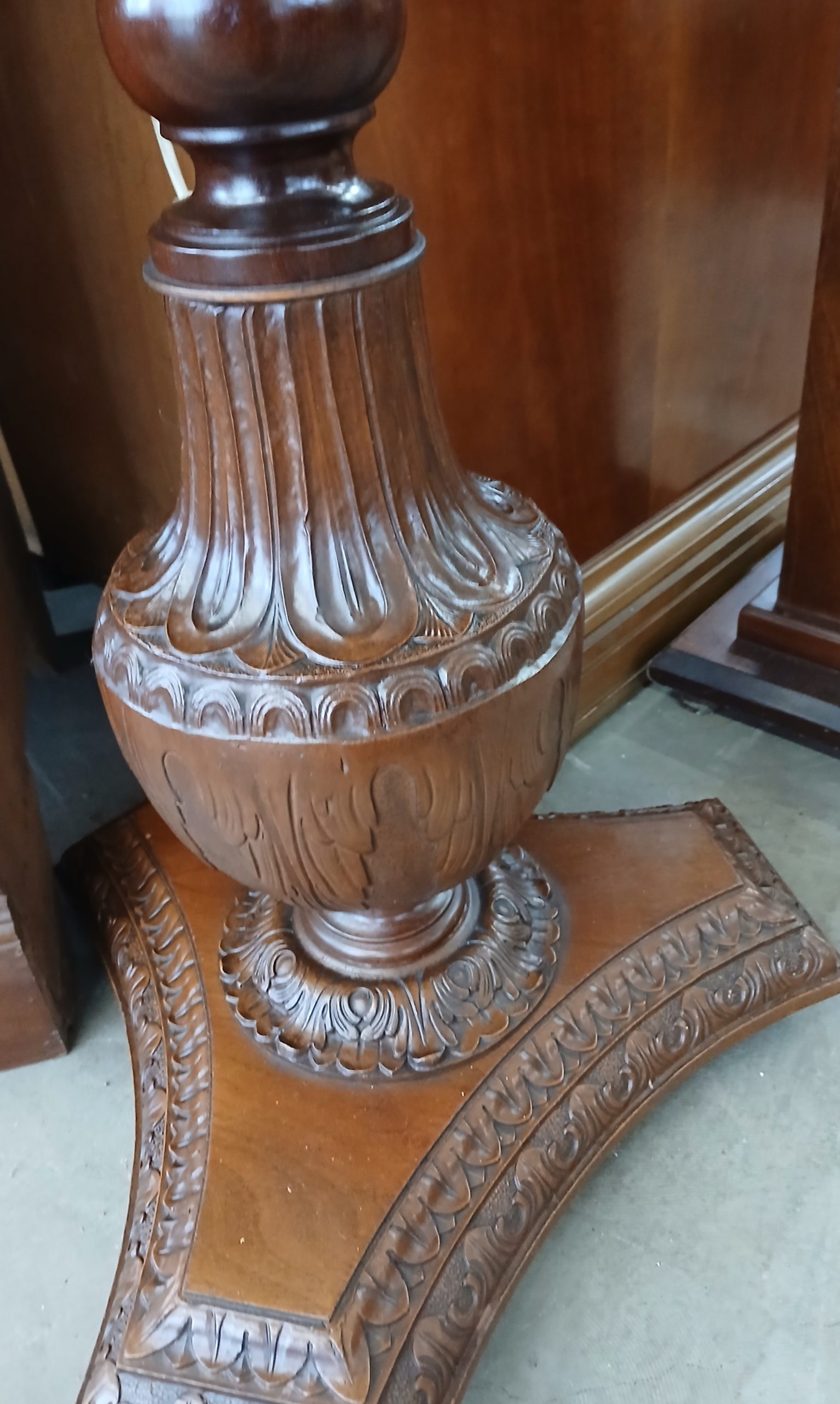 Este o piesă de mobilier vintage,prezintă o bază largă,sculptată, cu picioare evazate,o coloană centrală robustă,de asemenea sculptată,și un blat superior rotund cu diametrul de 33cm.