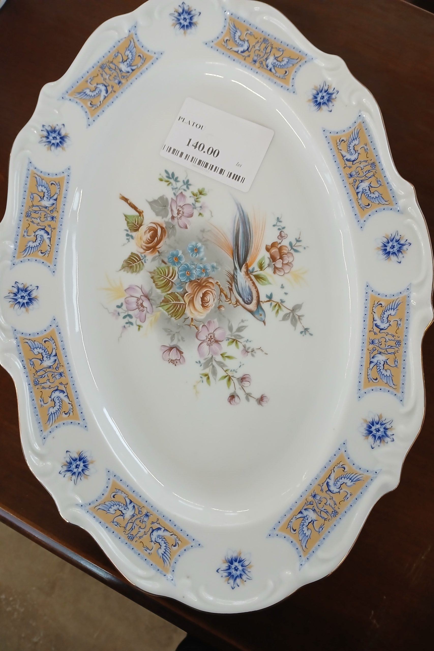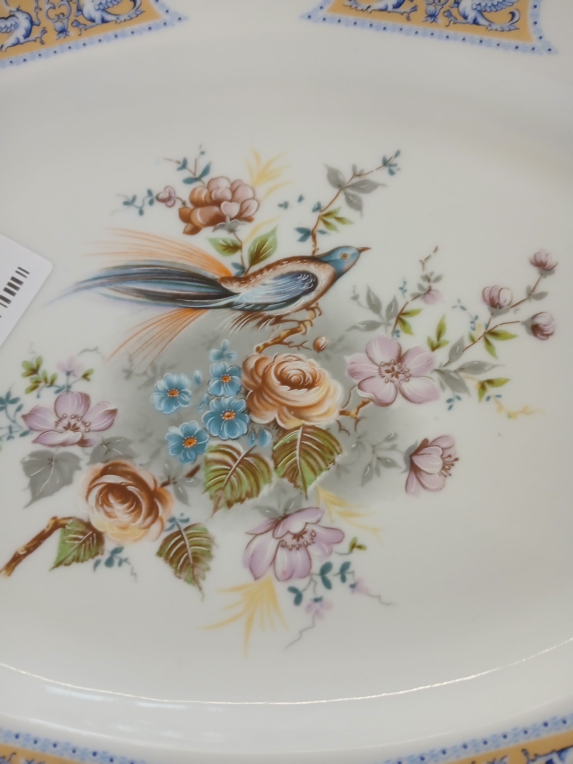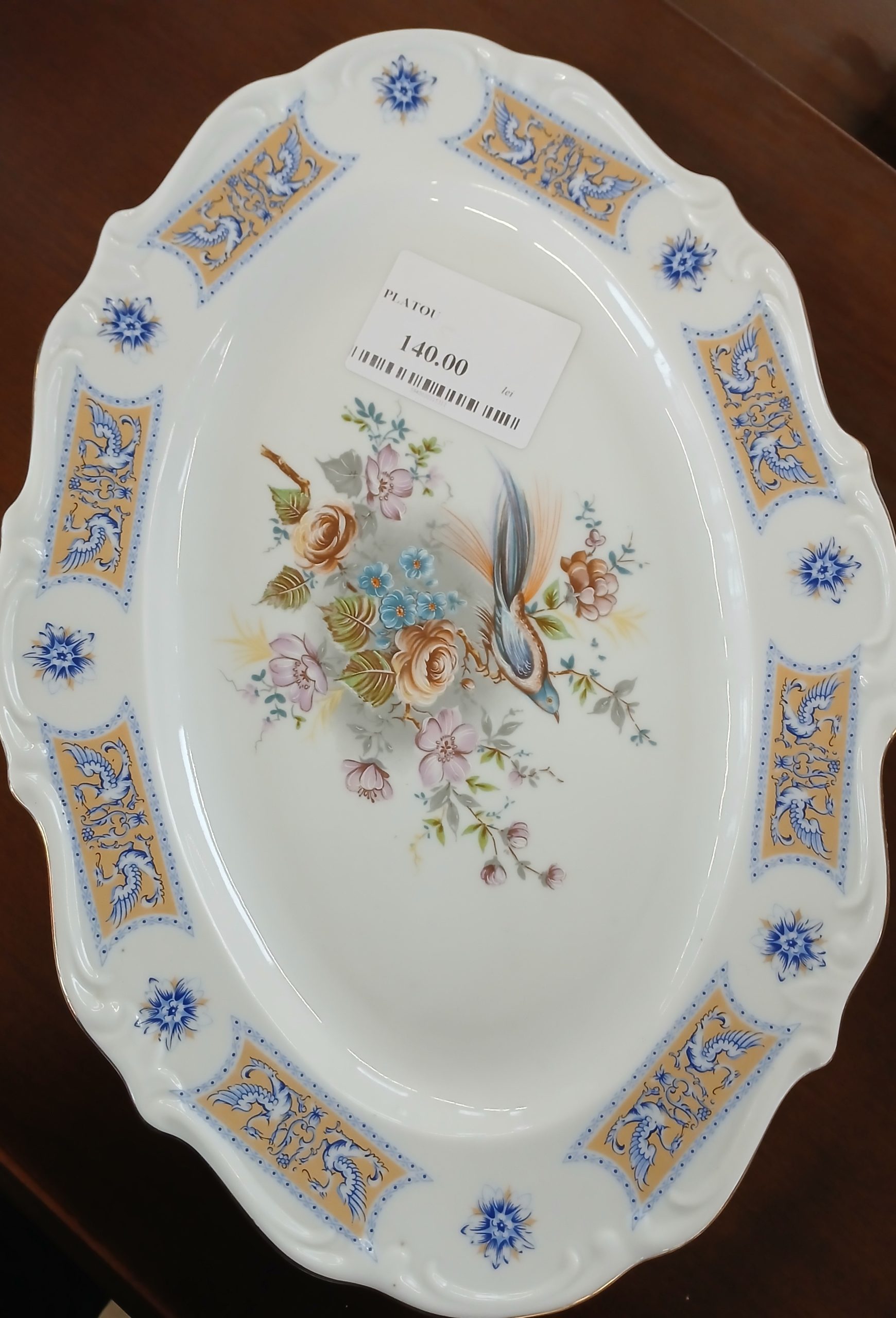 Este un platou oval din porțelan Limoges, decorat manual cu motive florale și o pasăre.