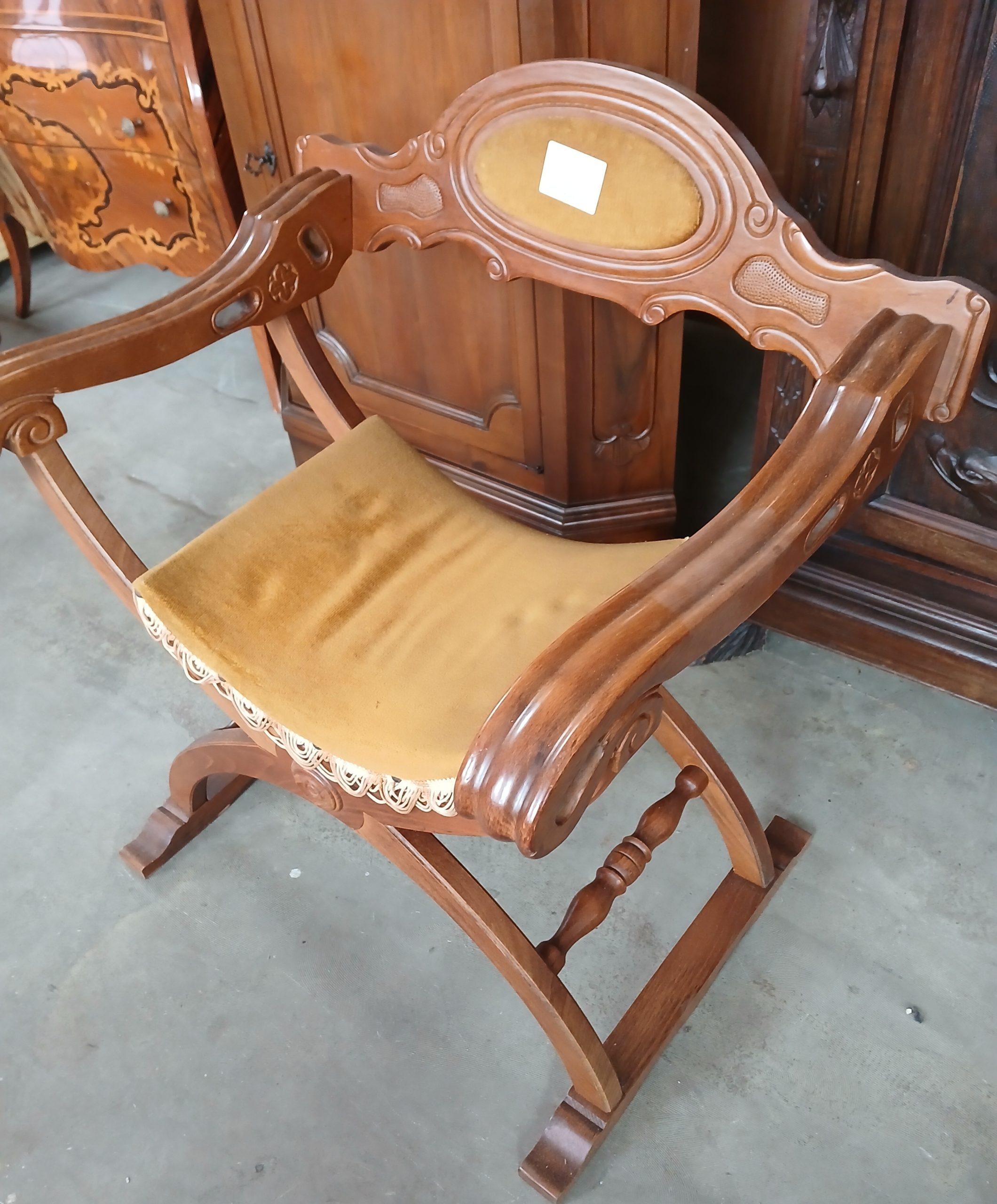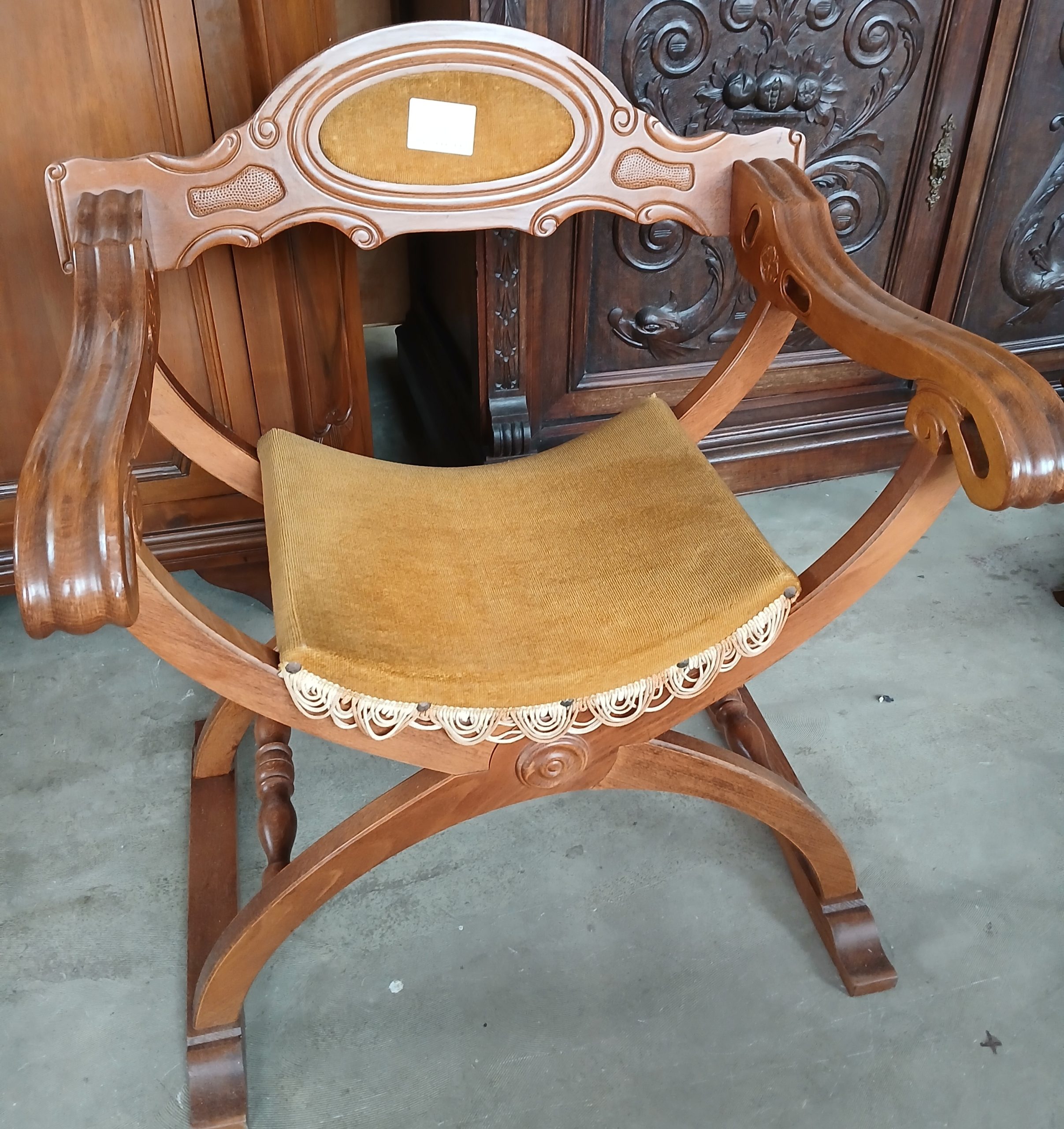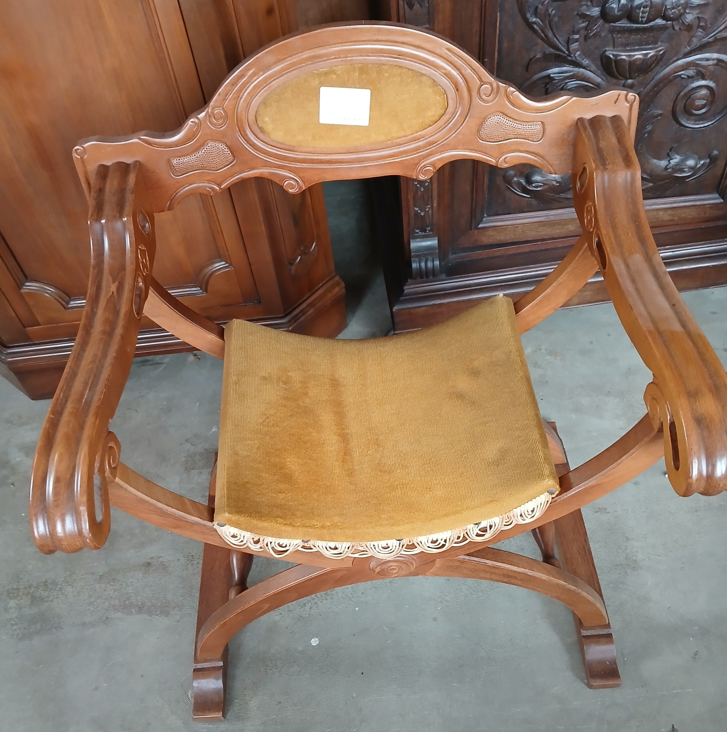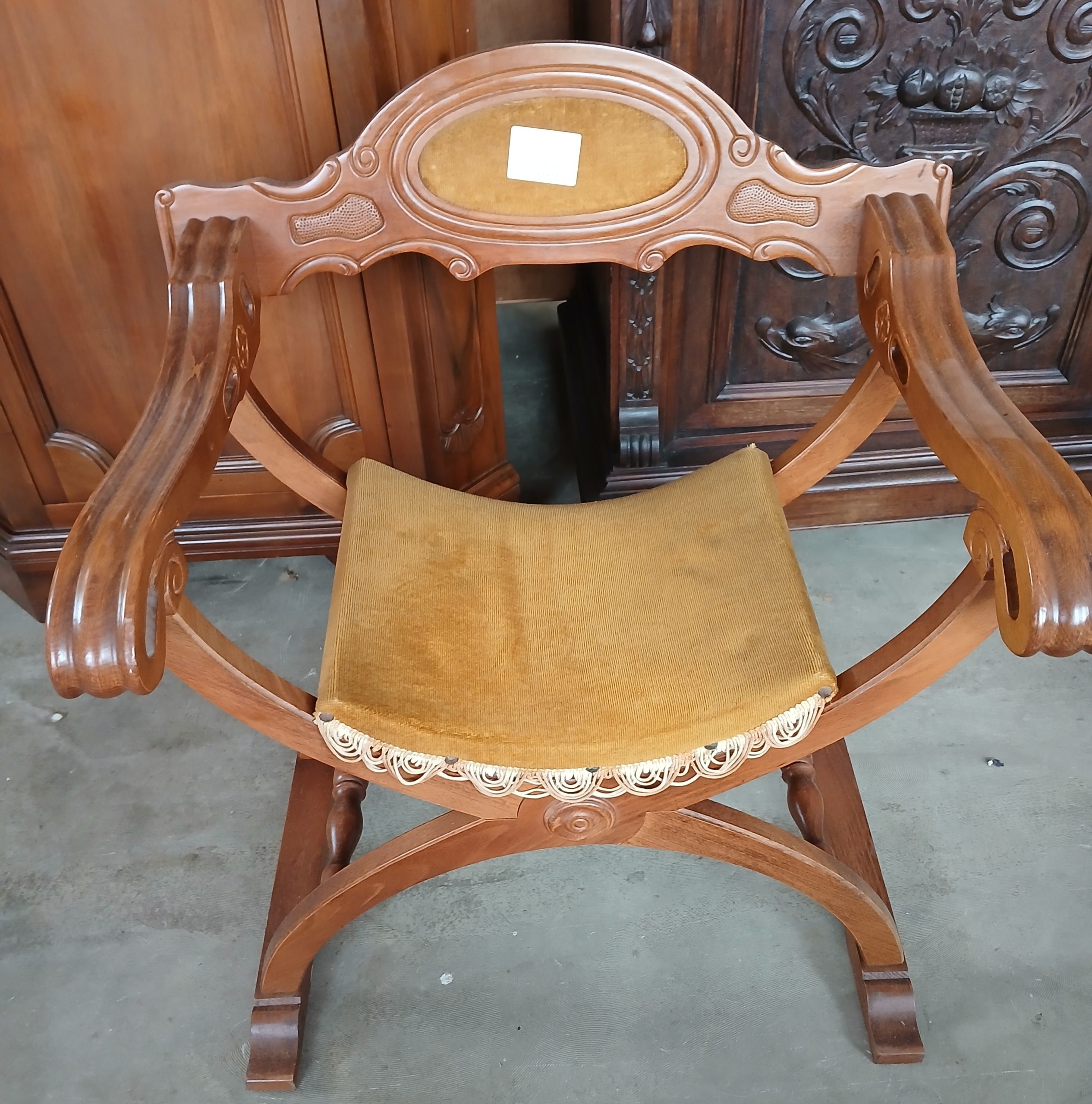 Scaun pliabil de inspirație renascentista italiană. Structură din lemn in formă de X ,cu brate sculptate si spătar arcuit, decorat cu un blazon. Scaunul prezintă o pernă de sezut din material textil muștar cu franjuri.