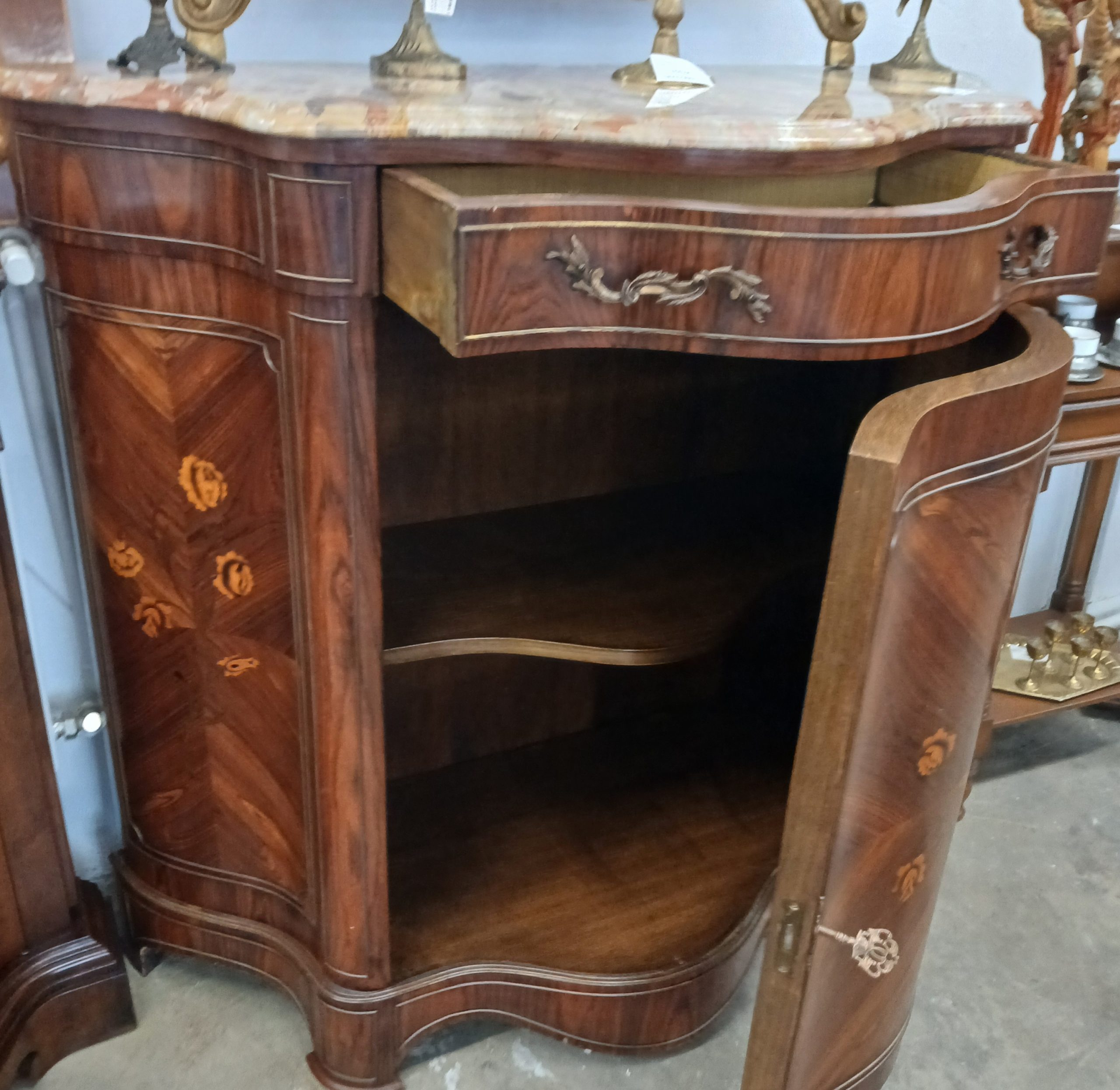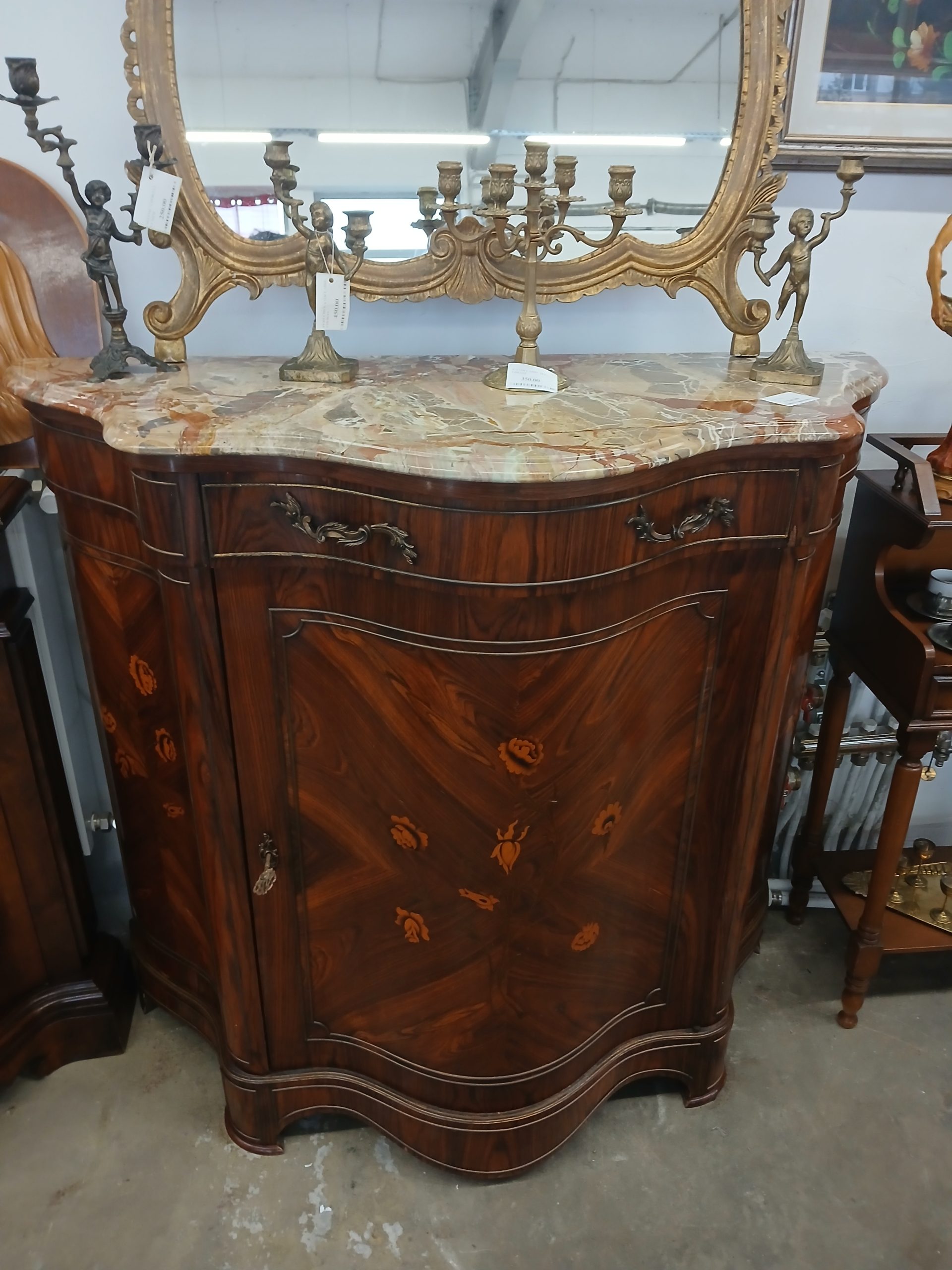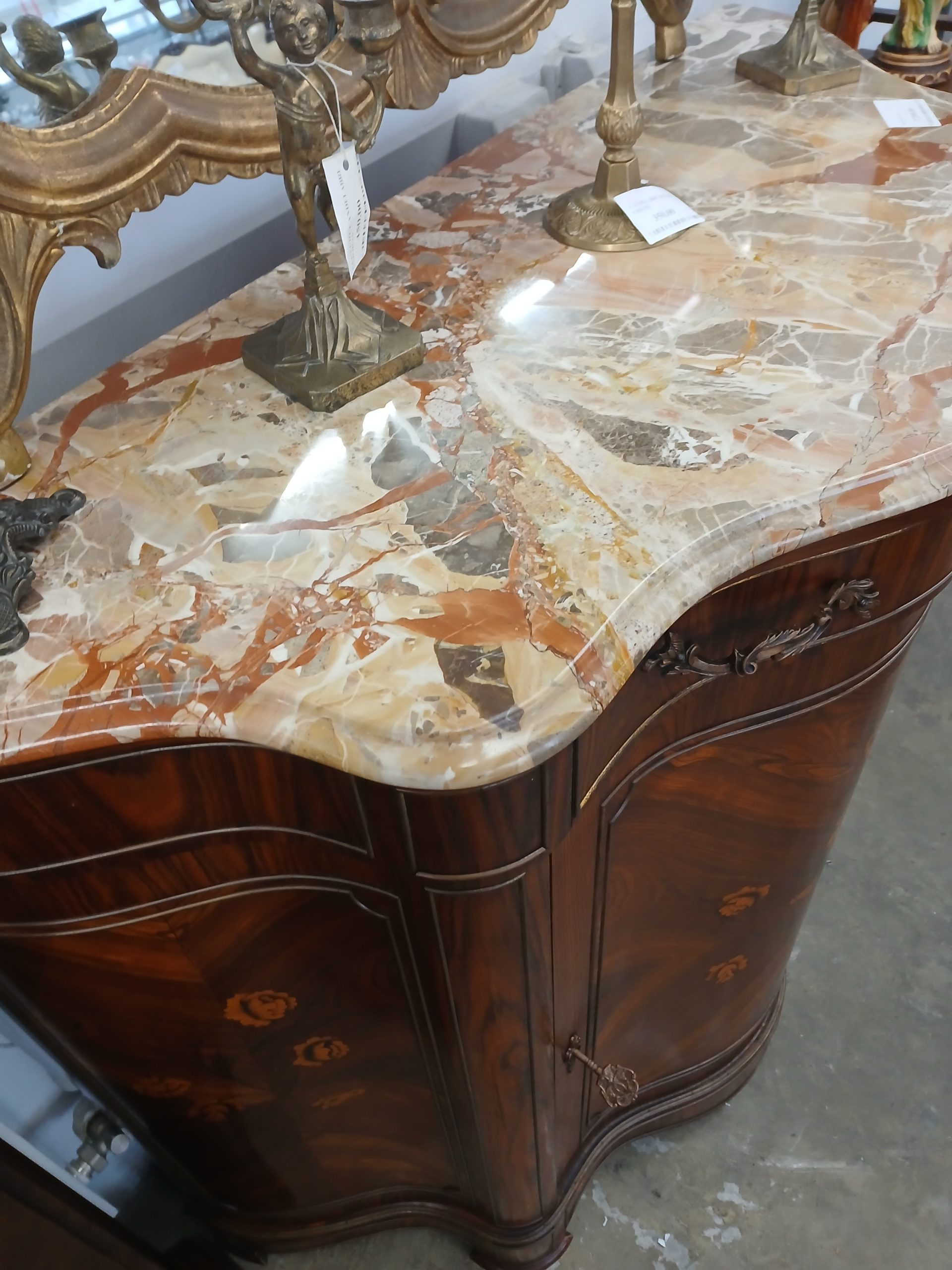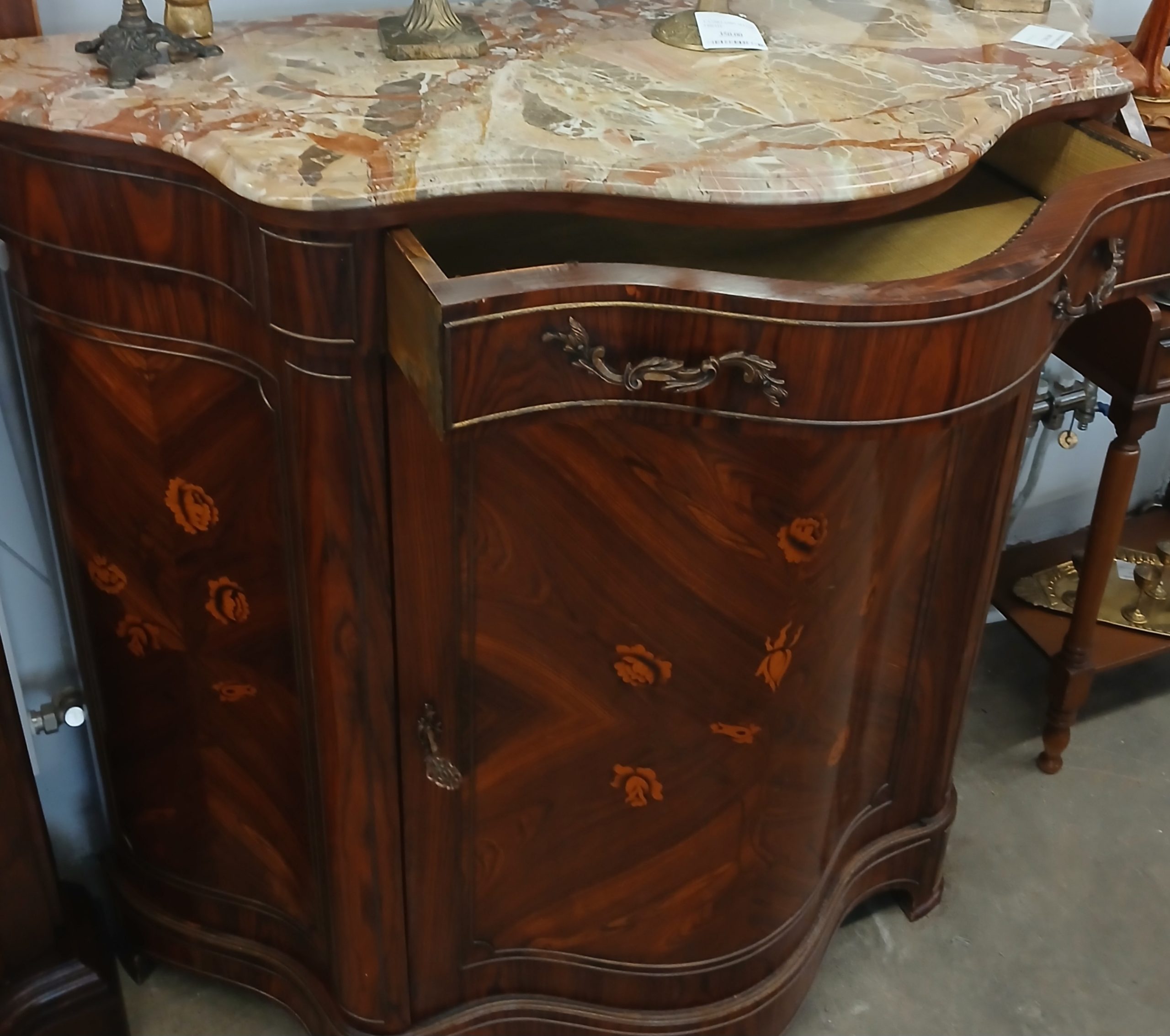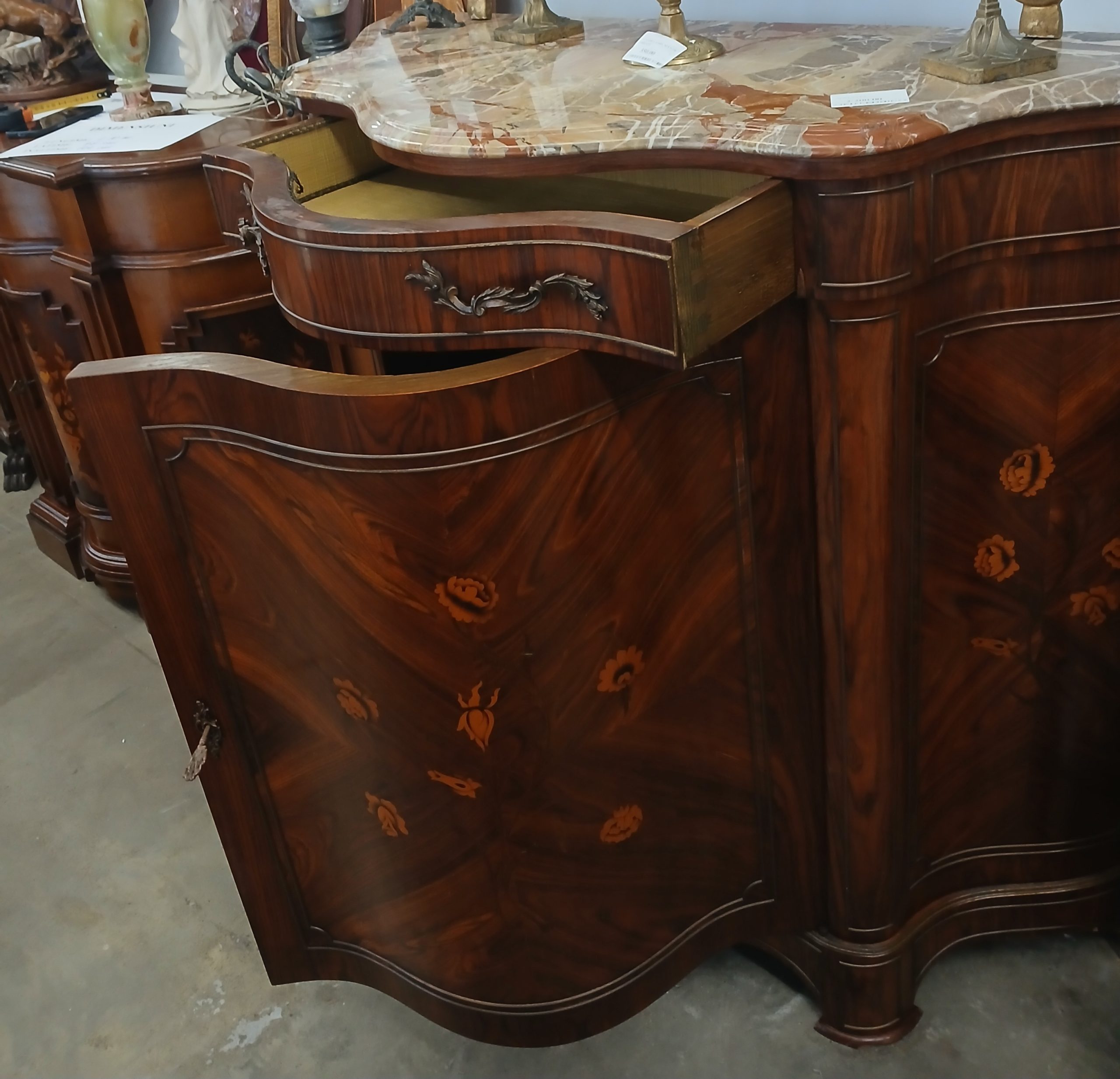 Aceasta este o comodă vintage in stil Maggiolini din lemn cu intarsii florale si blat de marmură.