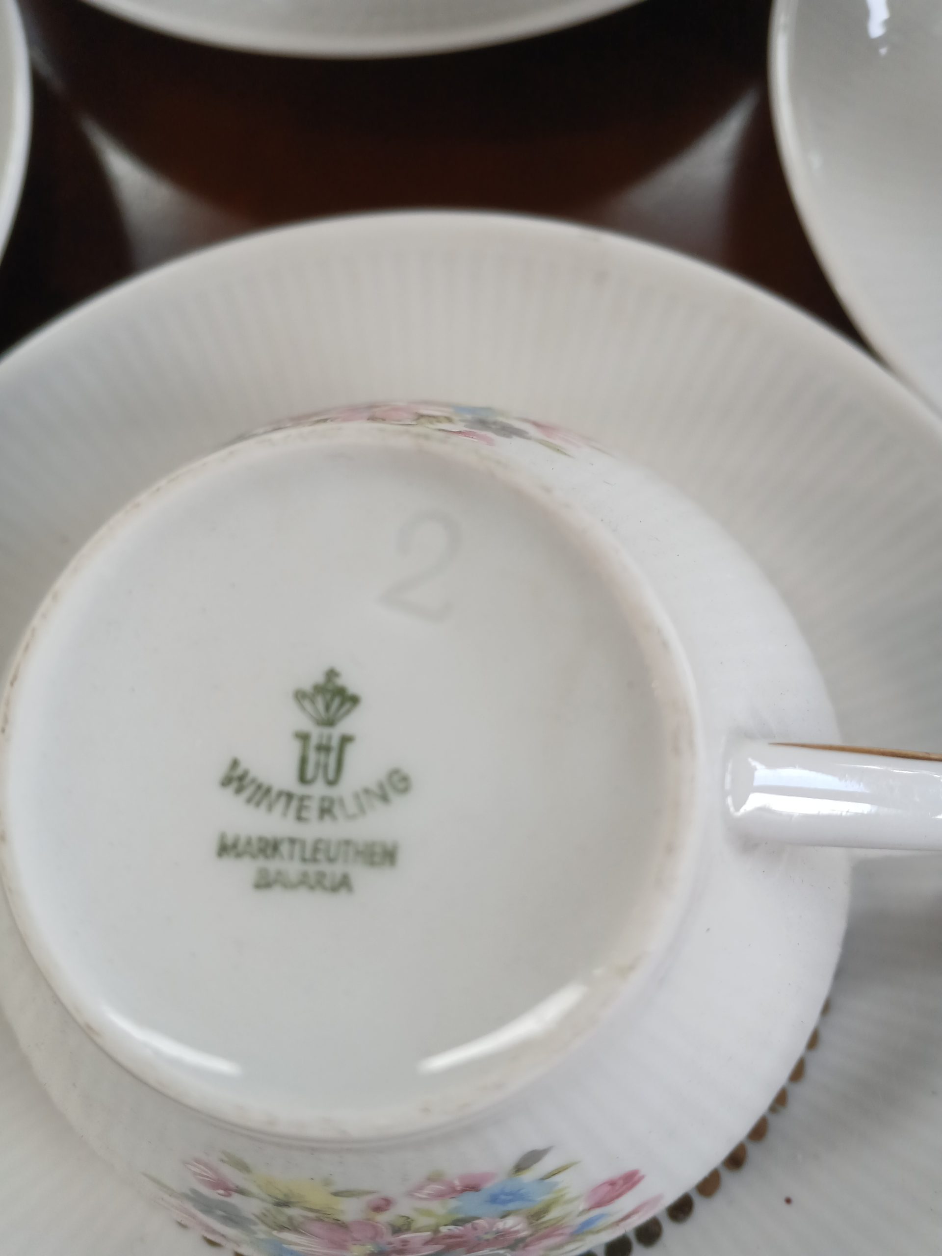 Acest serviciu de cafea este un set vintage, Winterling, Bavaria din portelan fin, caracterizat prin modele florale delicate si detalii aurii pe margini. Include o cafetieră, o latieră, o zaharnită, precum si 12 ceșcuțe cu 12 farfurioare. Ceșcuța are diametrul de 6 cm si inaltimea de 5,5 cm. Zaharnita are înălțimea de 10 cm. Letiera are înălțimea de 10 cm. iar cafetiera are inaltimea de 22 cm.