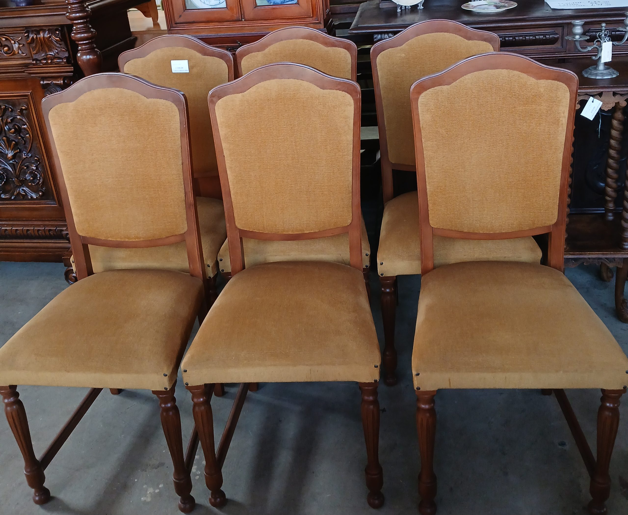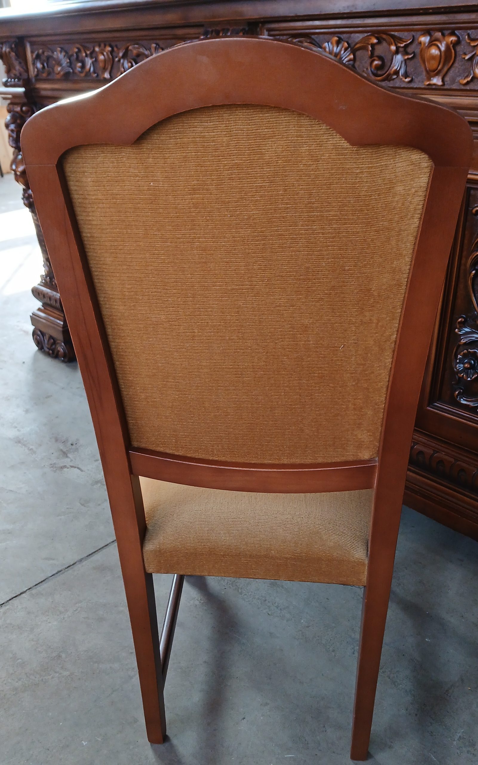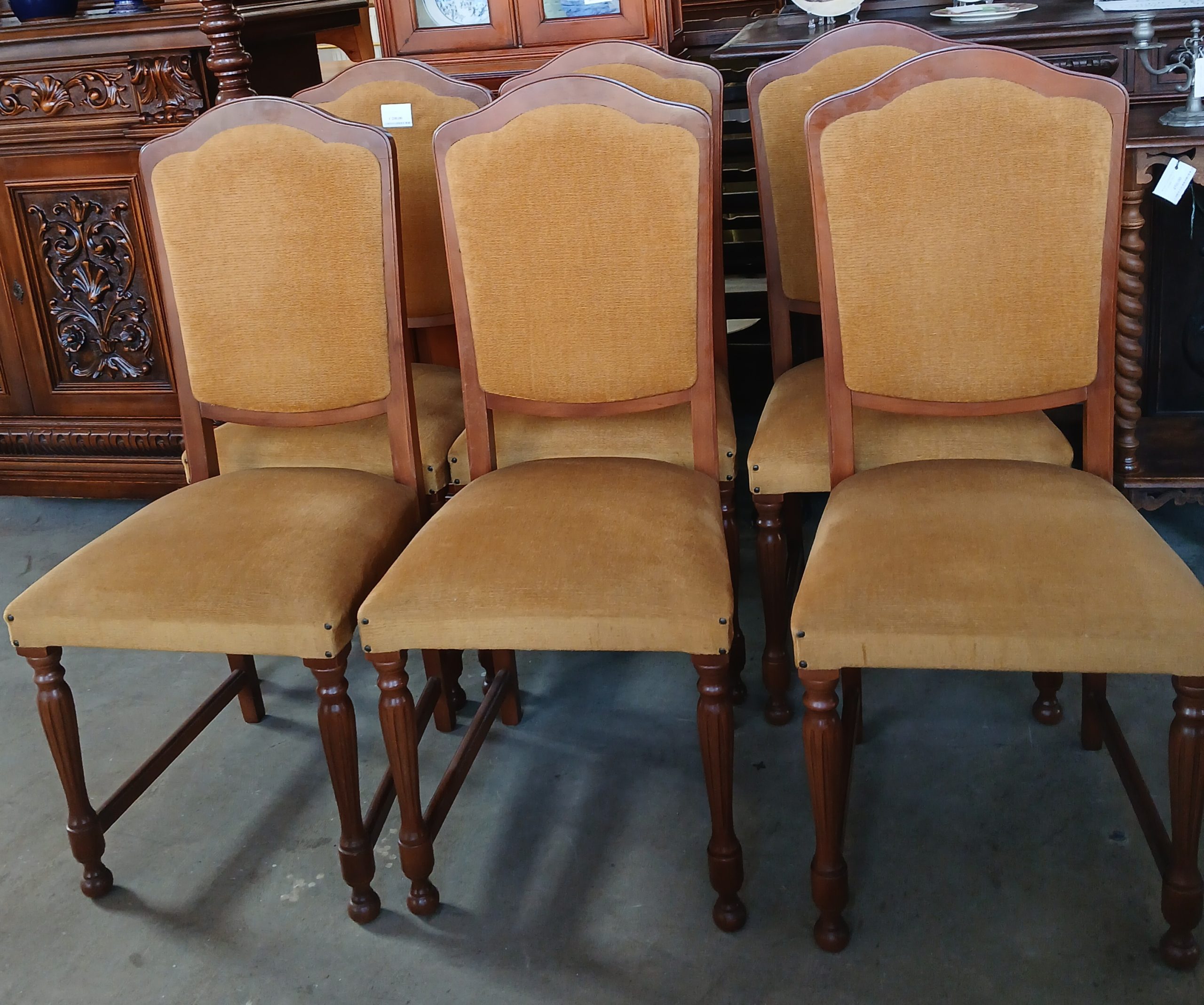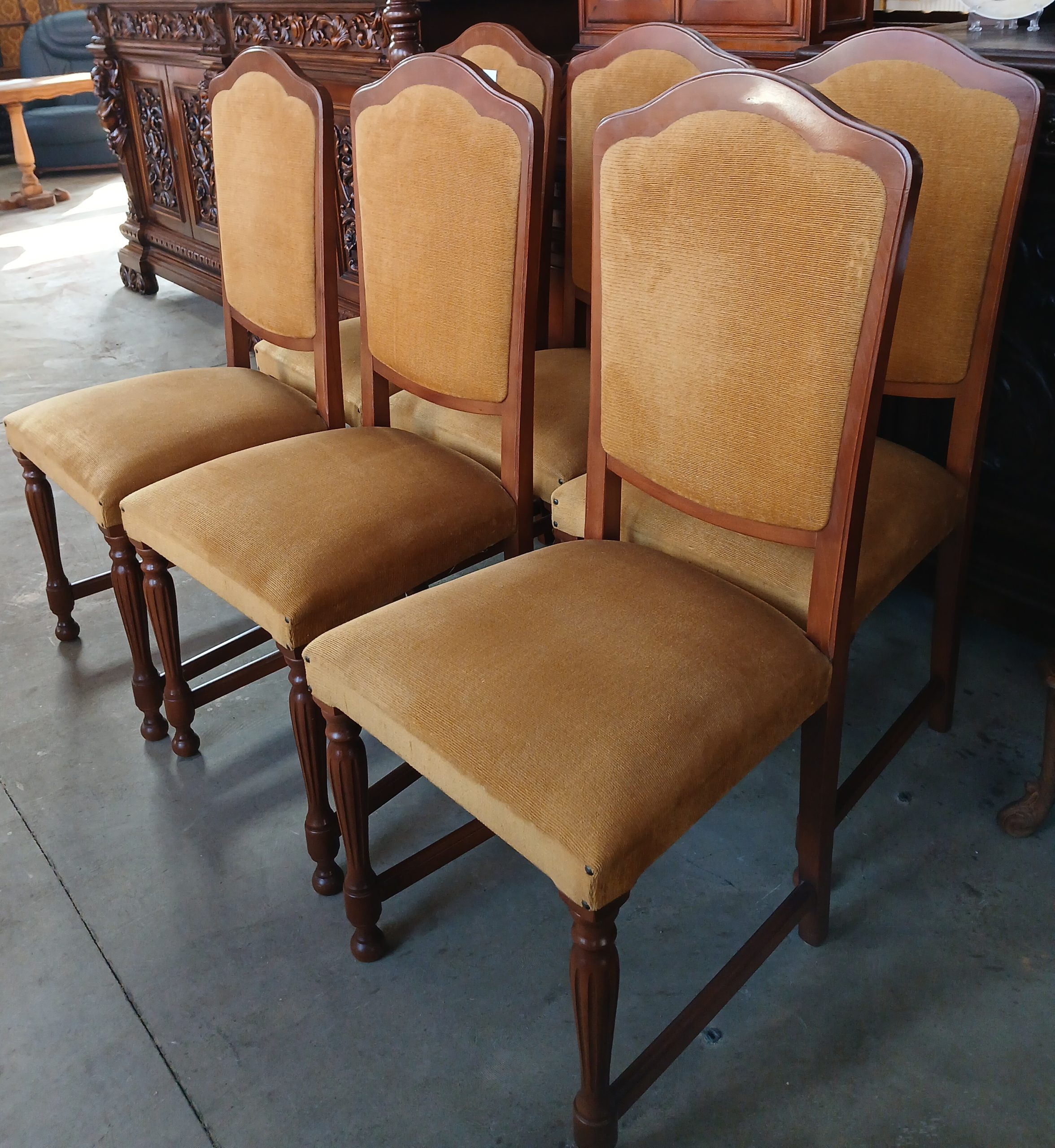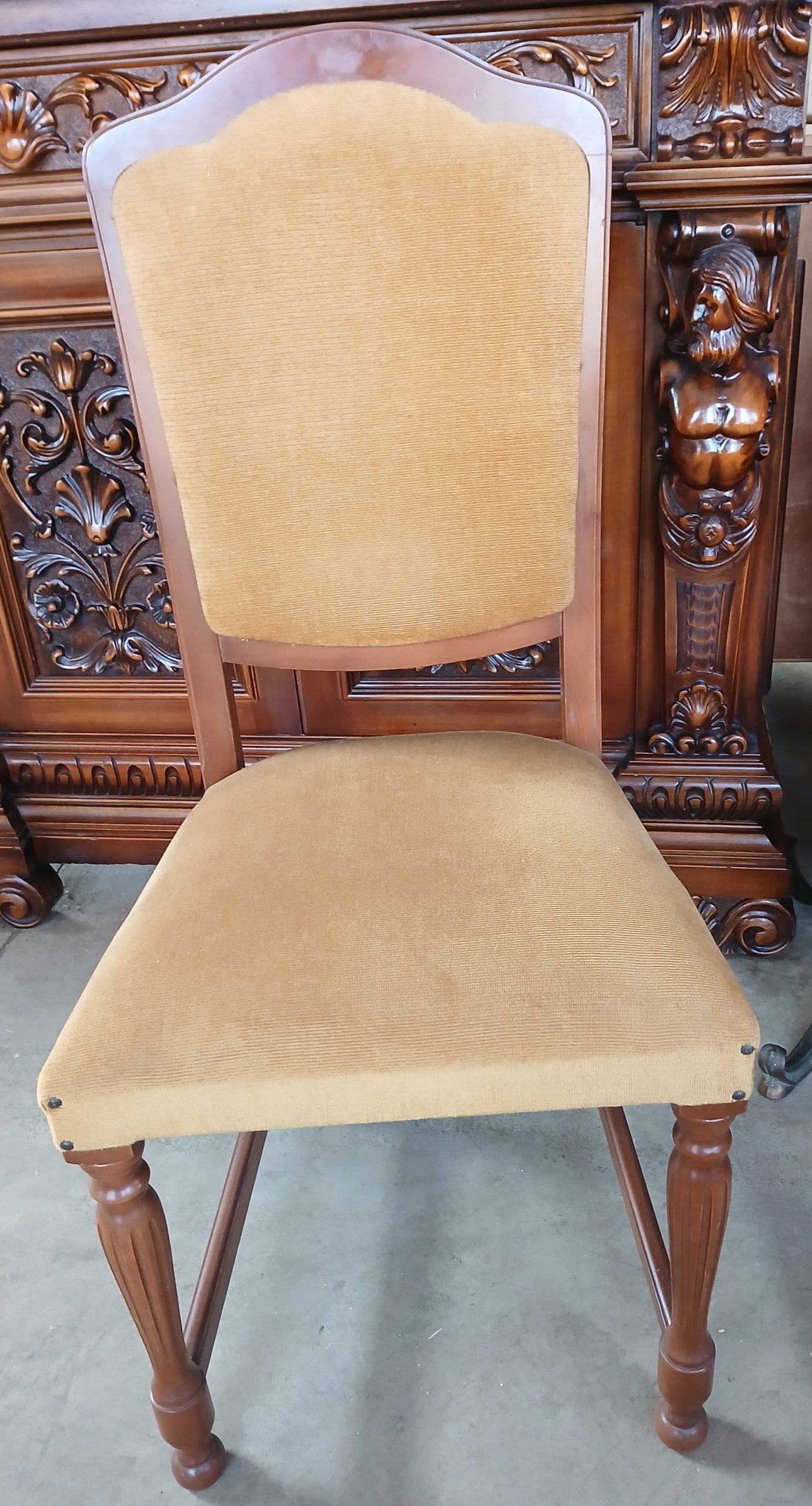 Scaunele au o tapițerie din material textil de culoare galben muștar si o structură din lemn cu picioare sculptate, ceea ce le conferă un aspect elegant si robust