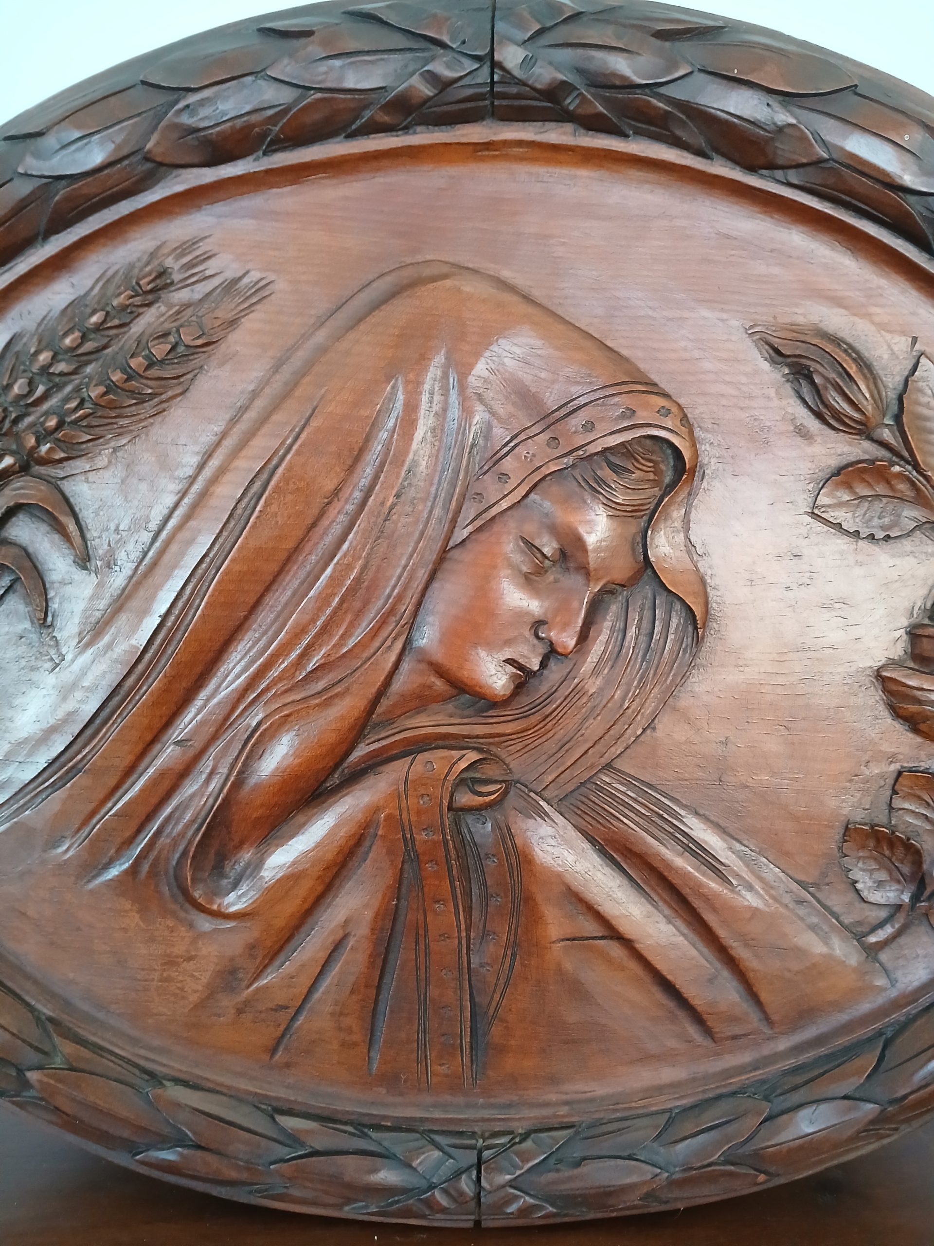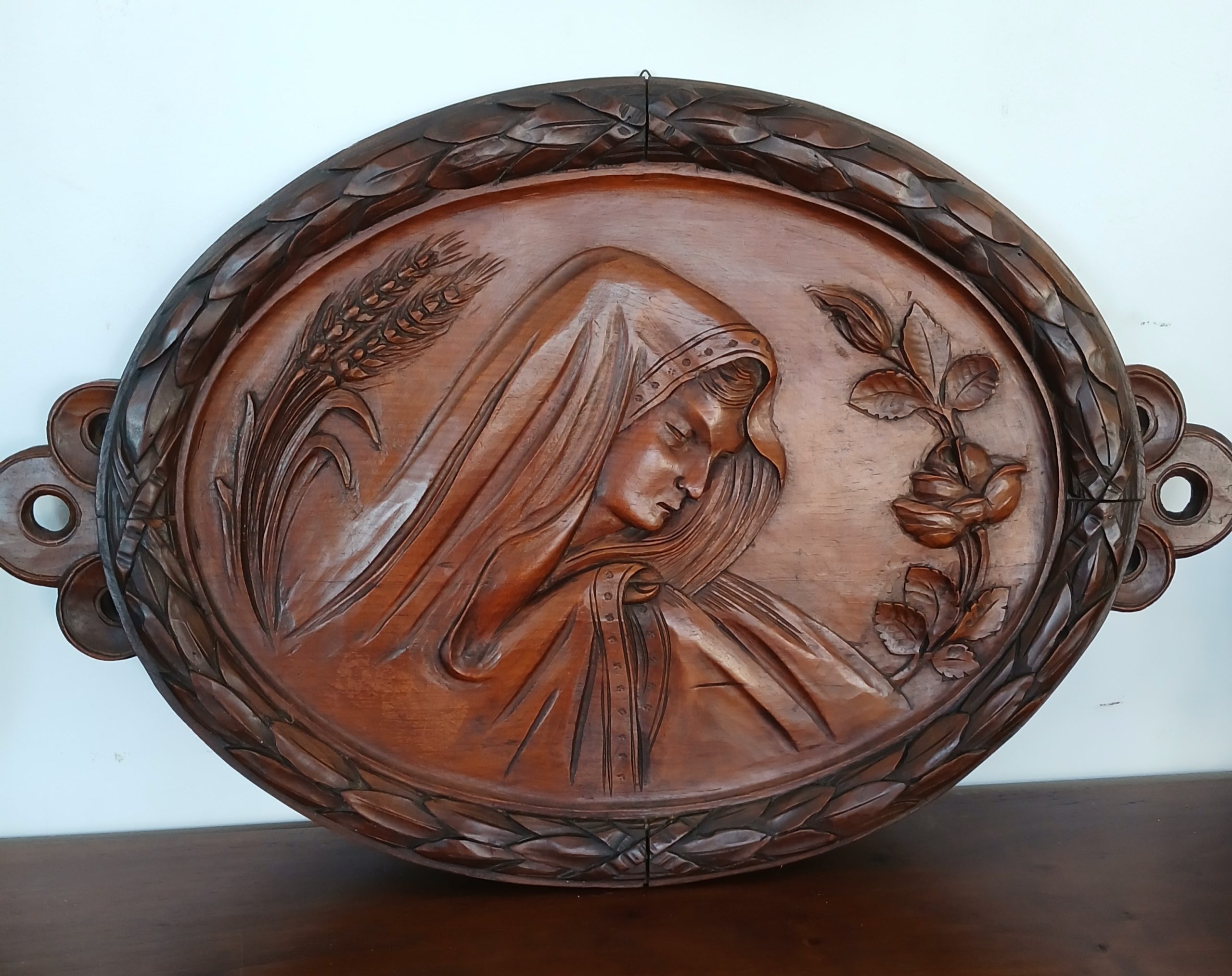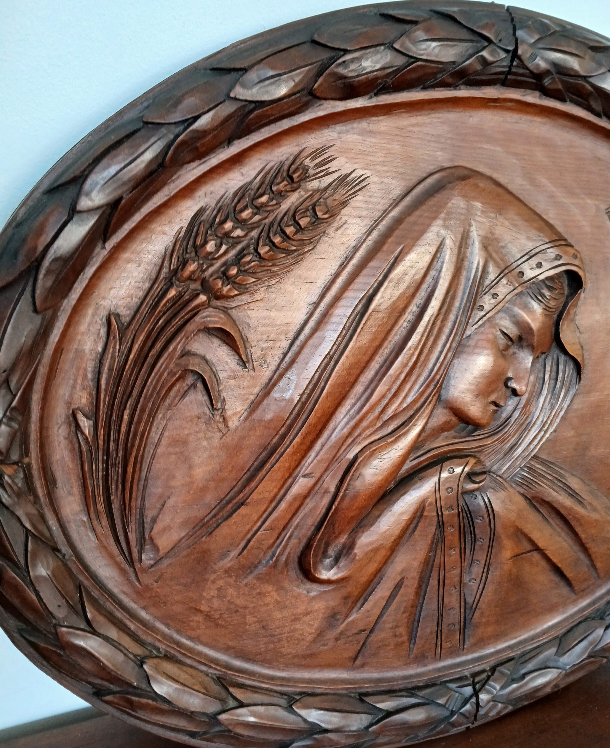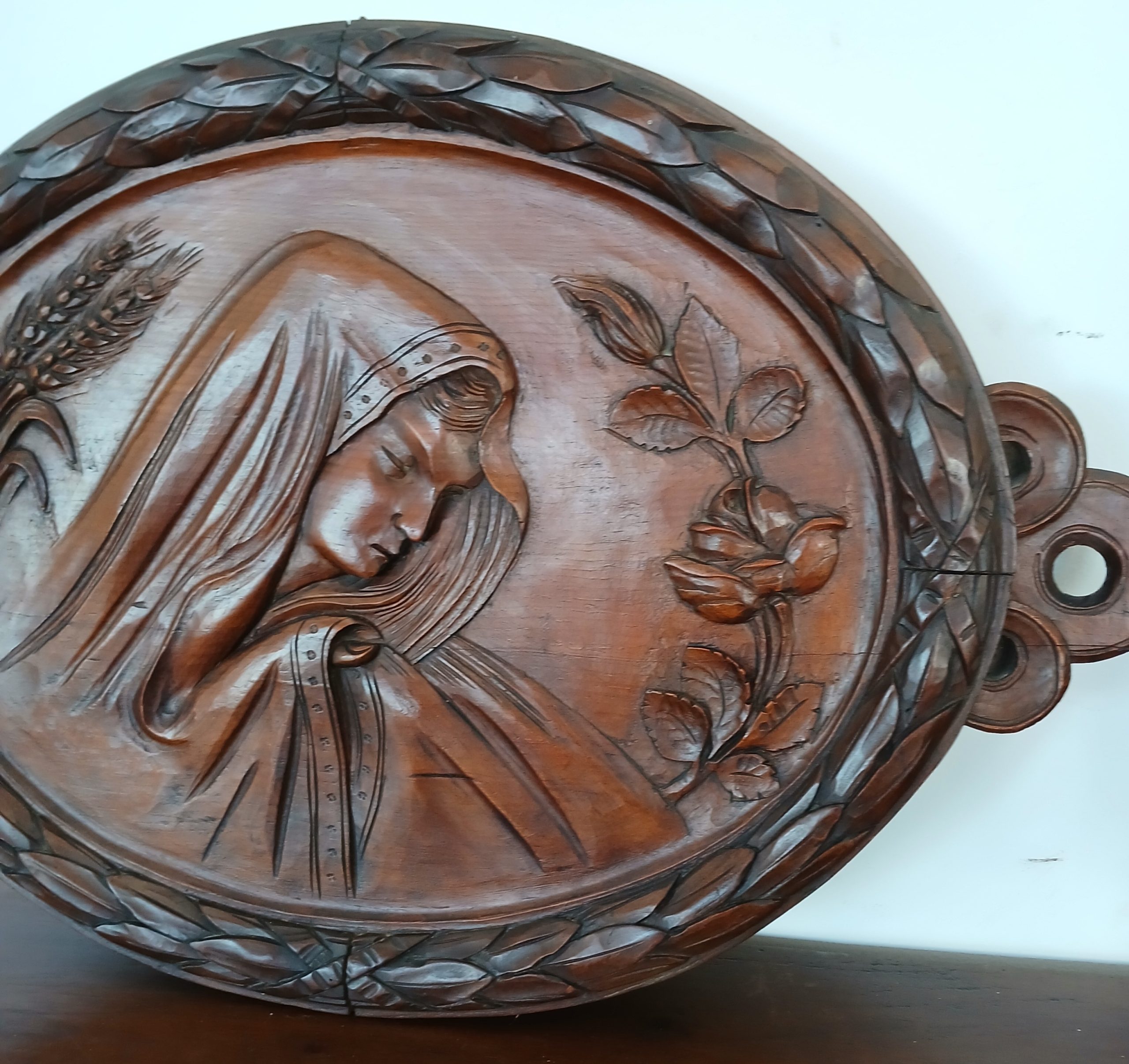 Aceasta este o placă sculptată in lemn care reprezintă pe Maica Domnului,avand in vedere voalul si expresia de smerenie sau suferința. Este o piesă de artă religioasă și un obiect de colecție.