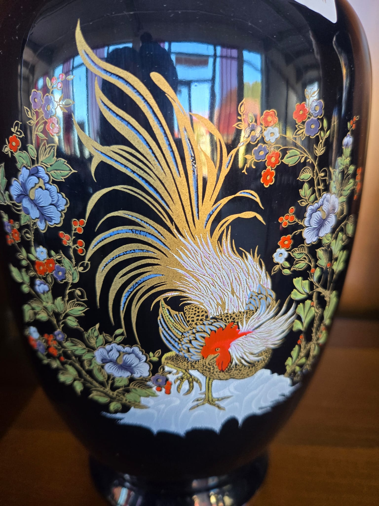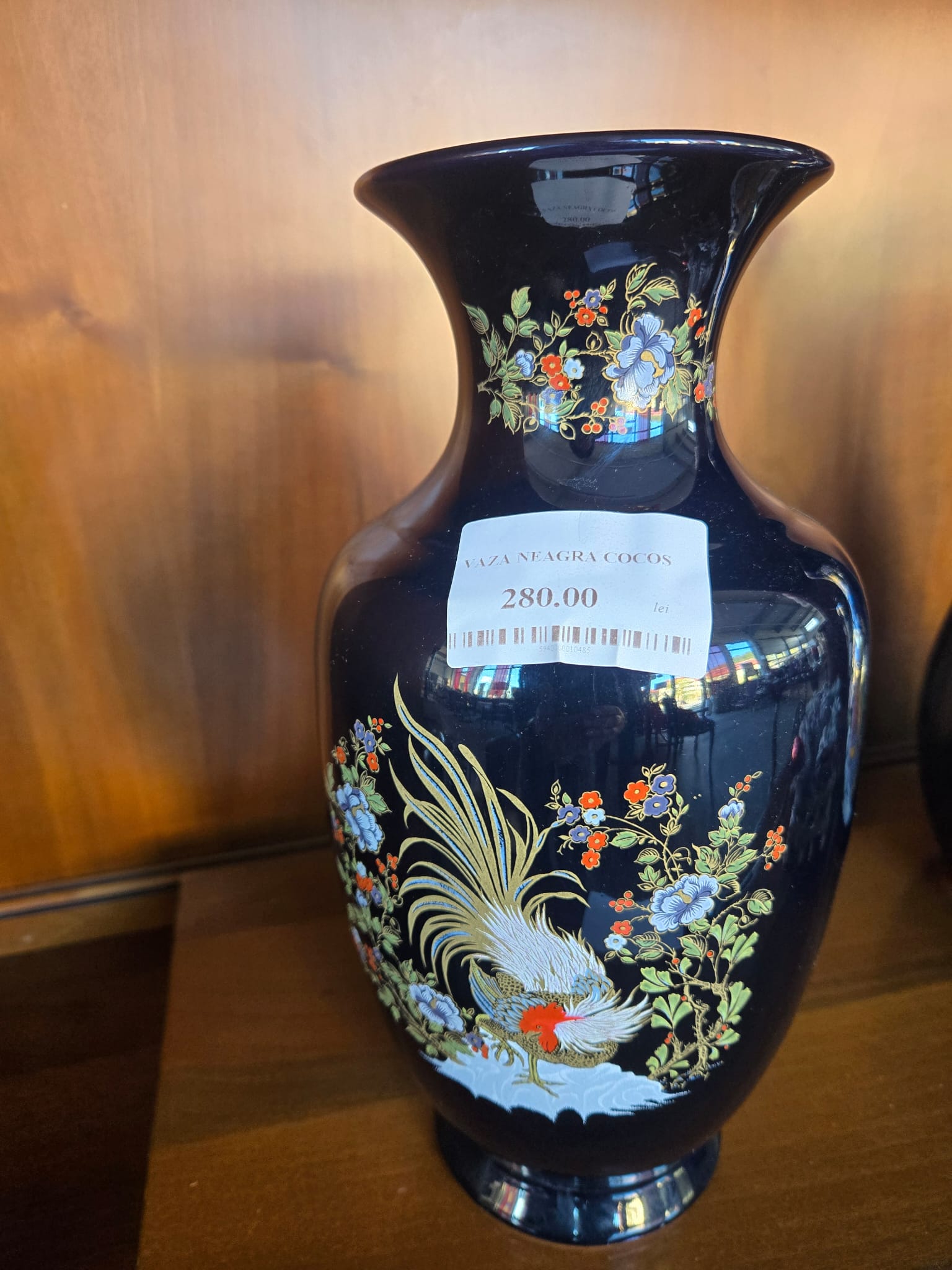 O deosebita vaza chinezesca din portelan cobalt culoare negru albastrui, decorata cu motive florale si un paun, simbol al frumusetii, demnitatii si prosperitatii in cultura chineza.