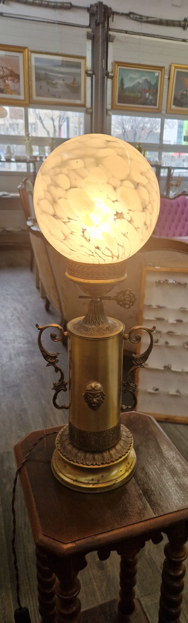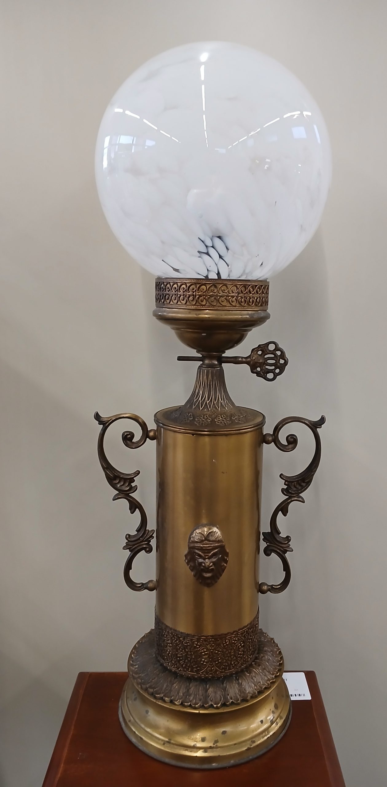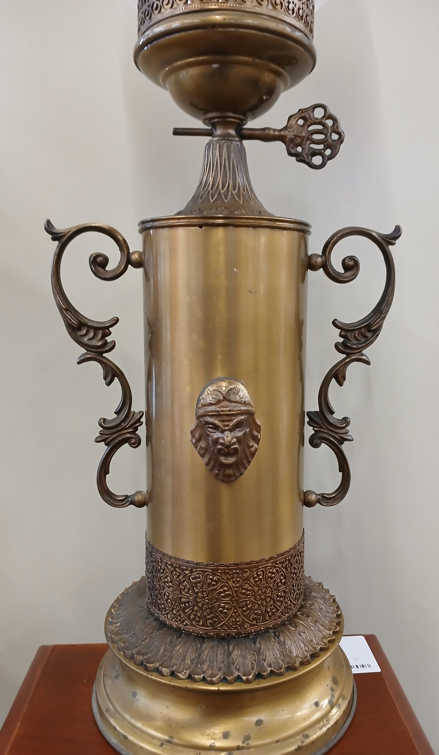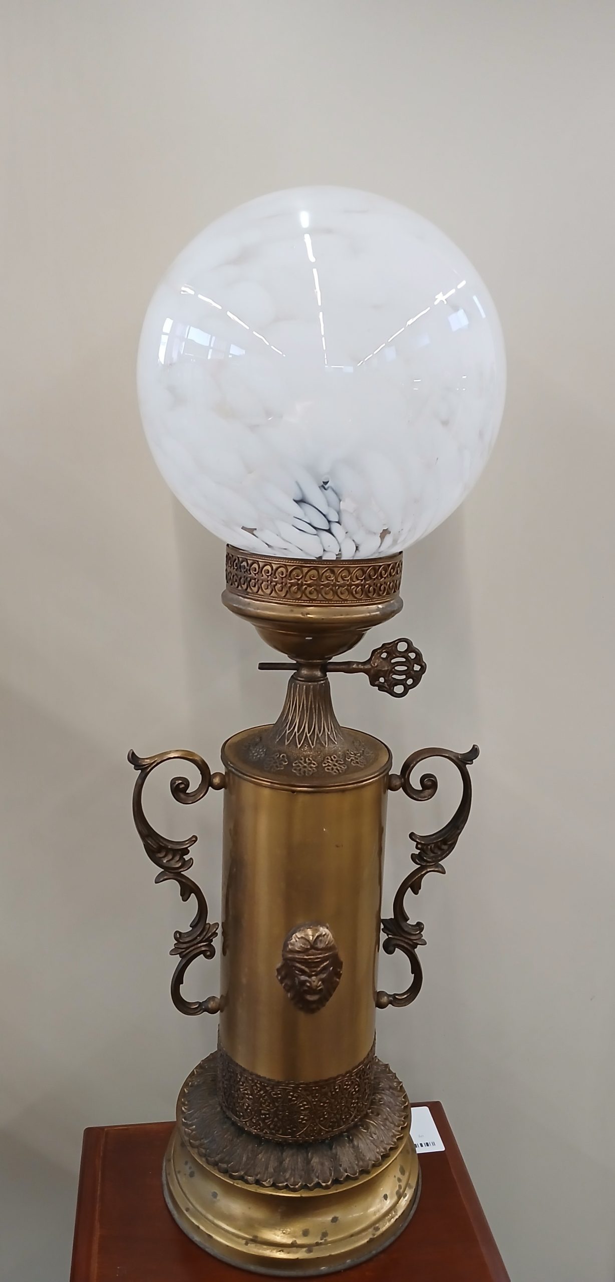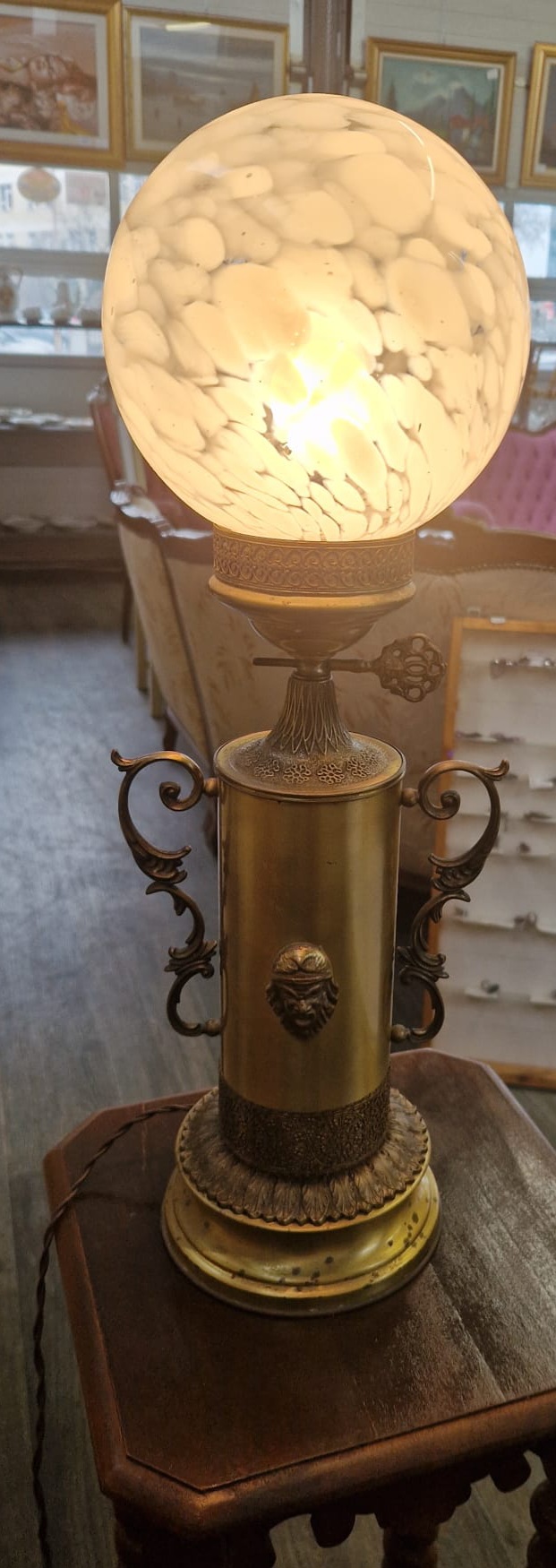 Aceasta este o lampă de masă antică ,realizată din bronz. Corpul lampii are o formă cilindrica, fiind ornamentat cu un cap de figură mitologică si manere laterale curbate. Baza si corpul sunt lucrate din metal turnat ( bronz) iar partea superioară prezintă un glob din sticlă opalină. Are înălțimea de 54cm.